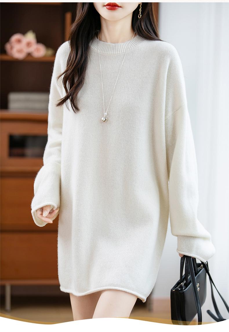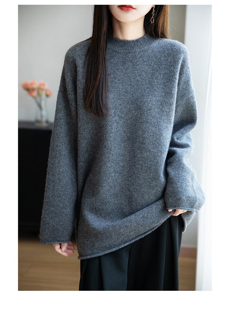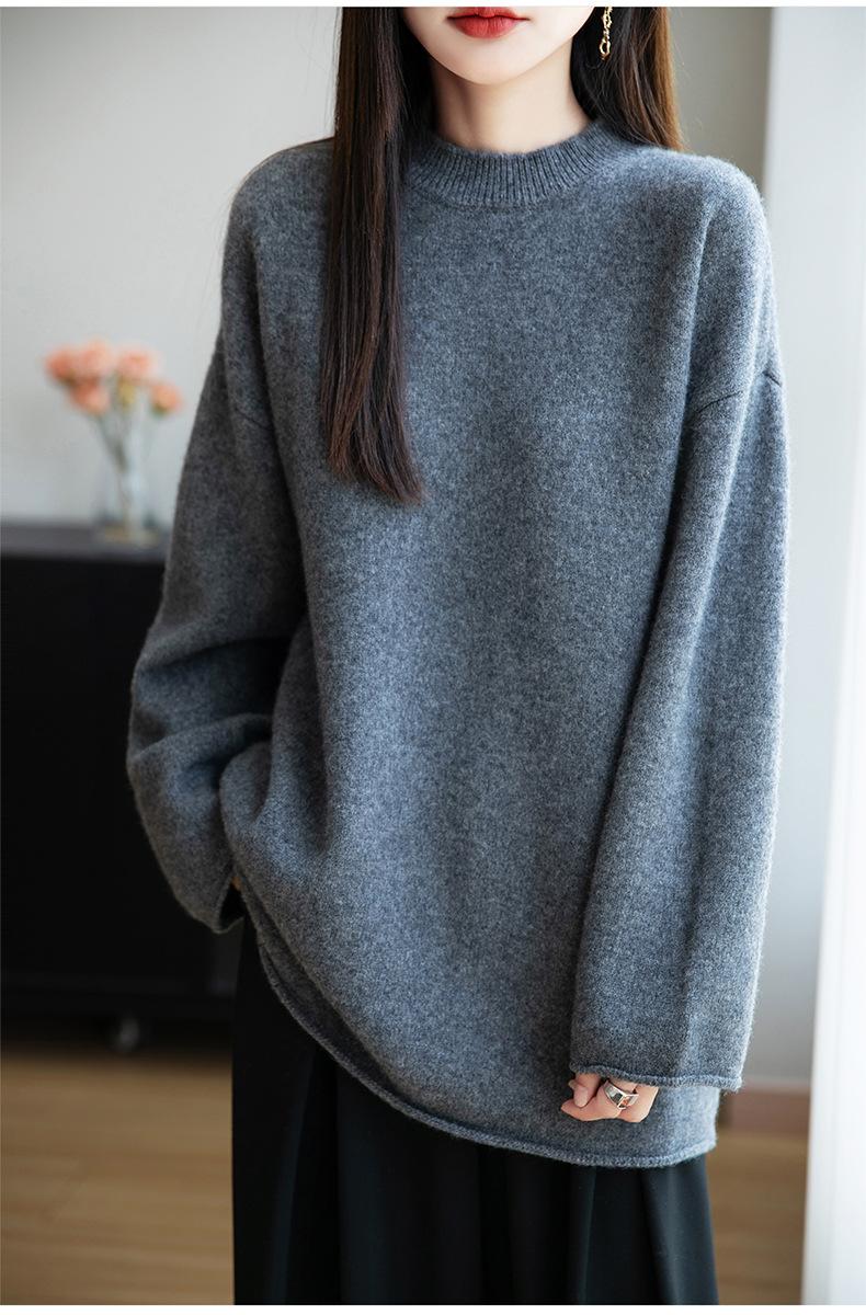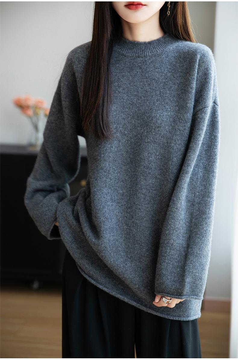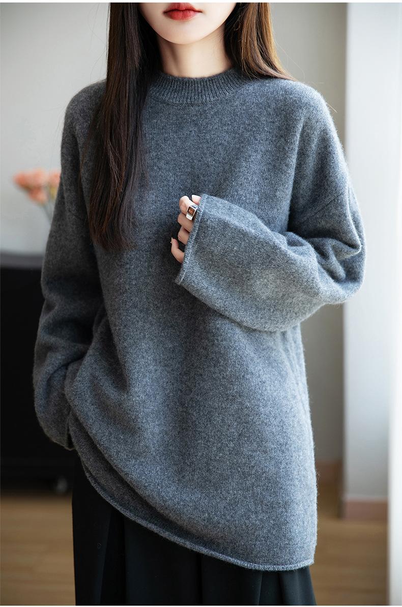 Suéter de Punto de Lana Pura Estilo Nuevo 2025 para Mujer, Jersey de Cuello Redondo, Color Sólido, Suelto Casual, Largo Medio, Suéter Básico