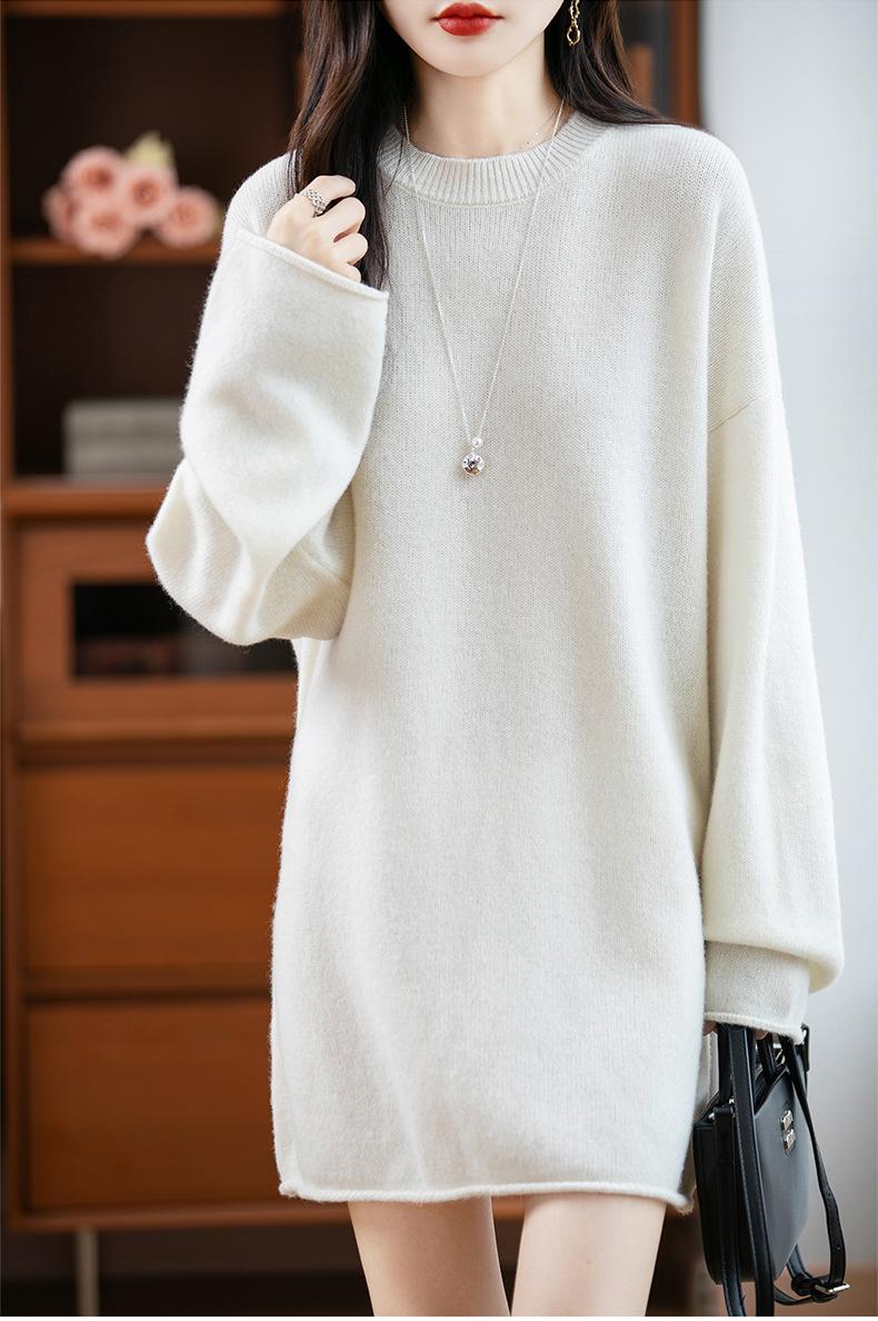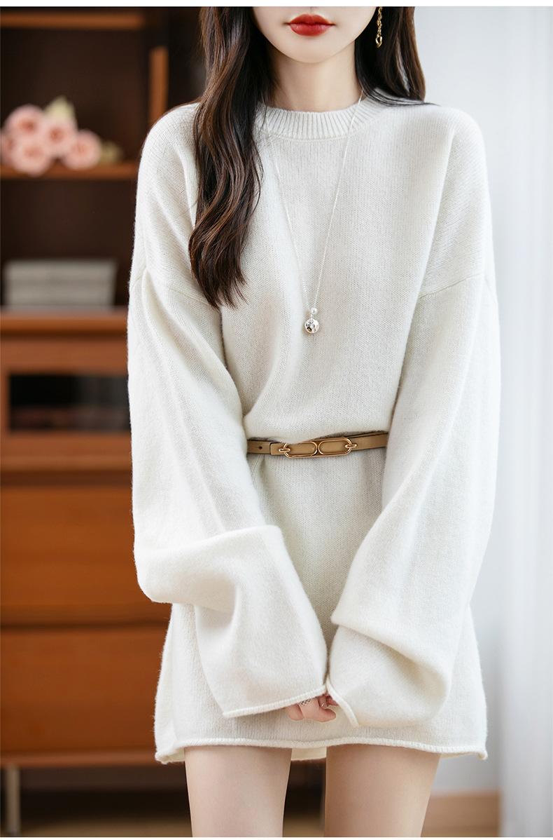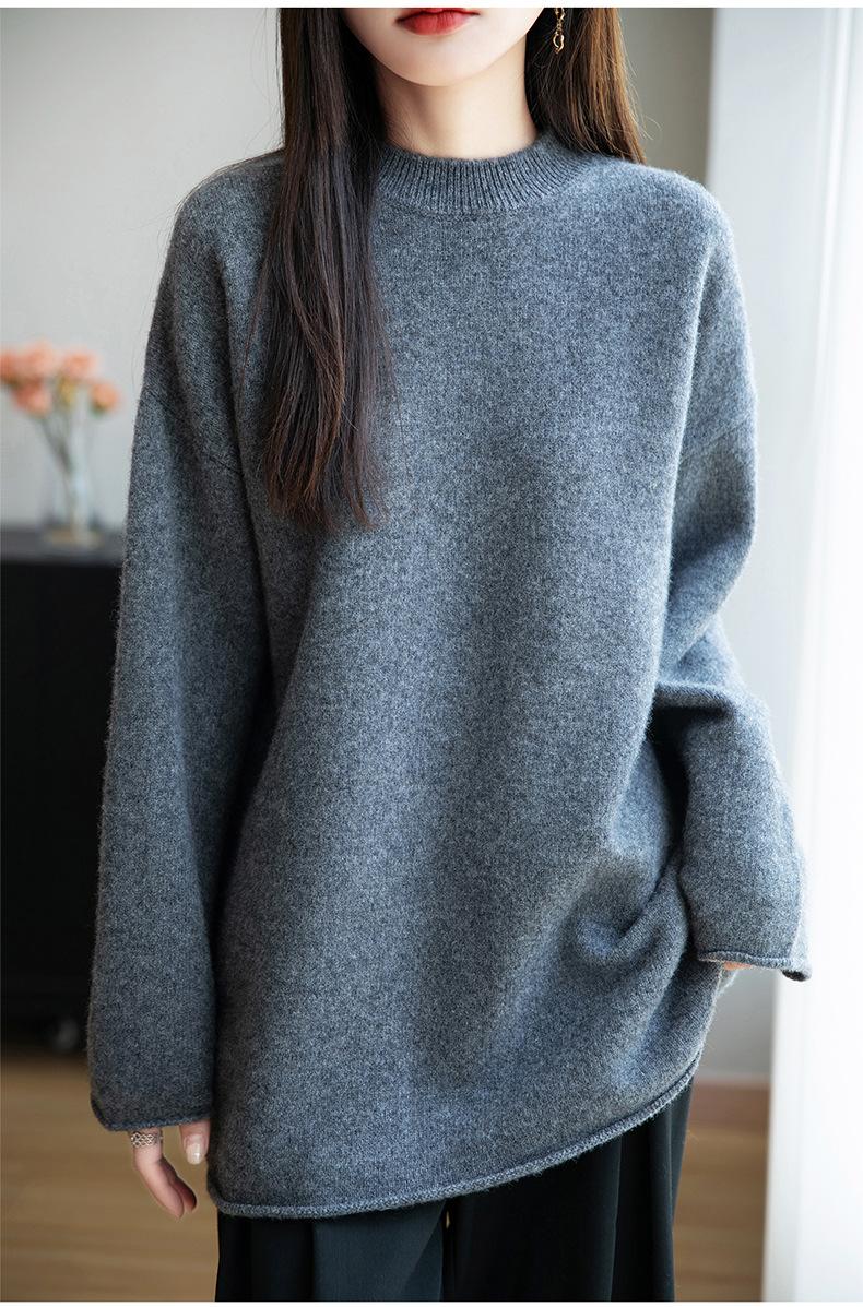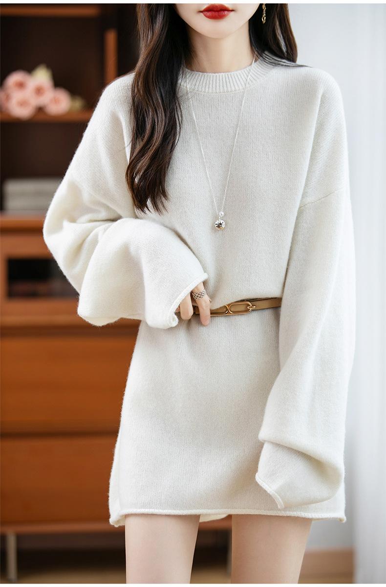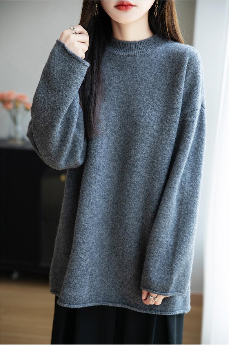 Suéter de Punto de Lana Pura Estilo Nuevo 2025 para Mujer, Jersey de Cuello Redondo, Color Sólido, Suelto Casual, Largo Medio, Suéter Básico