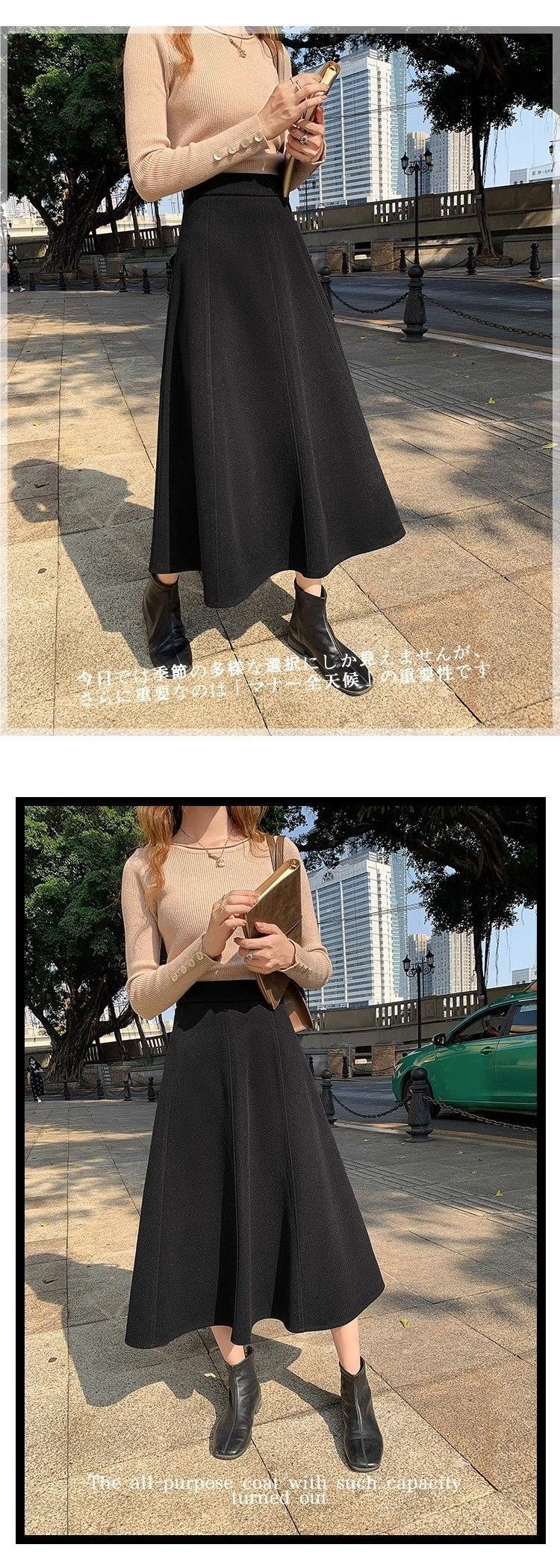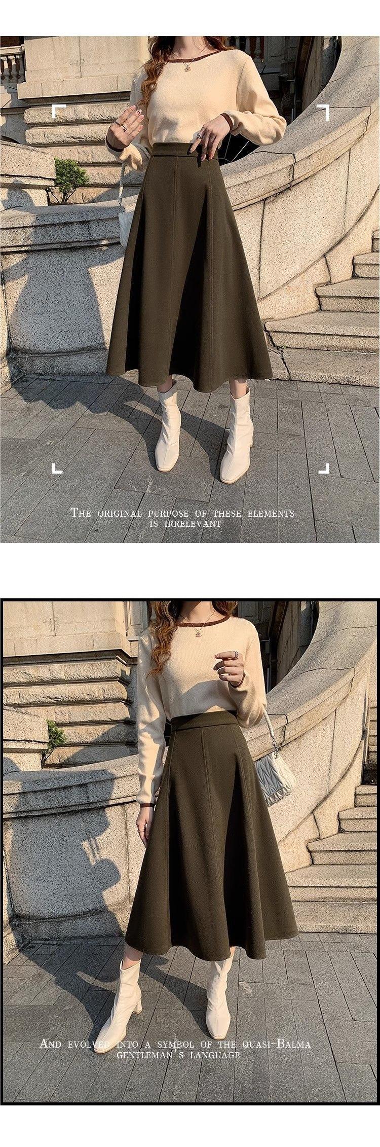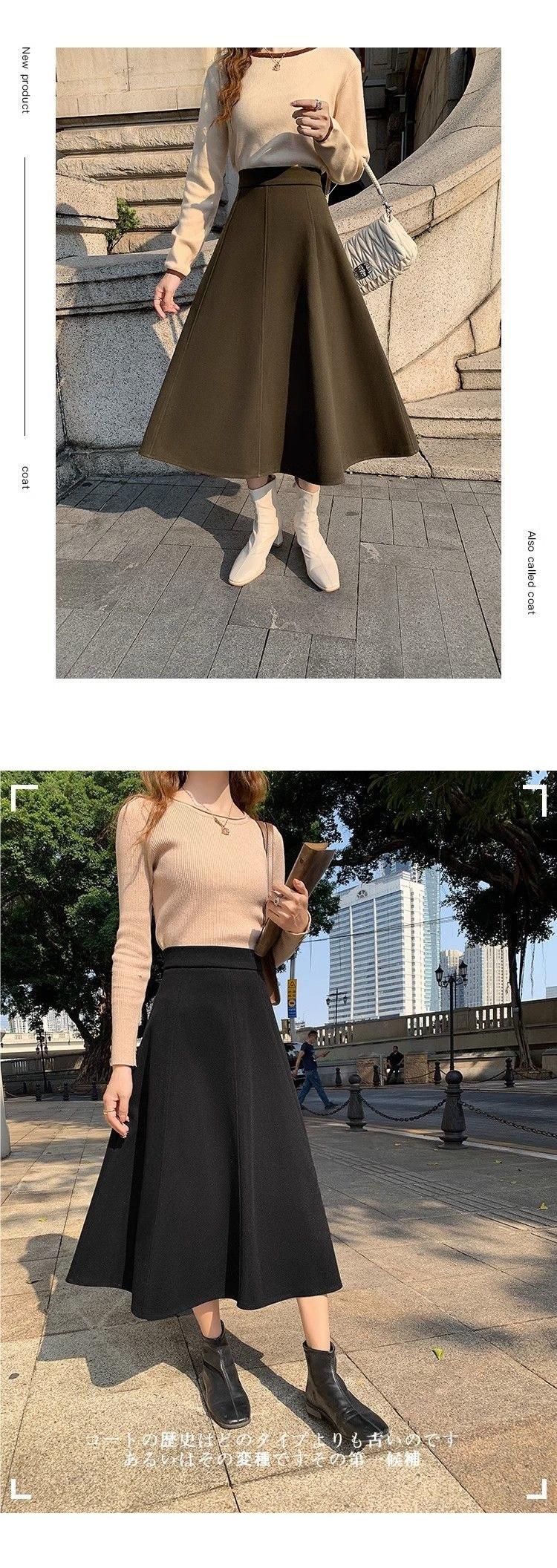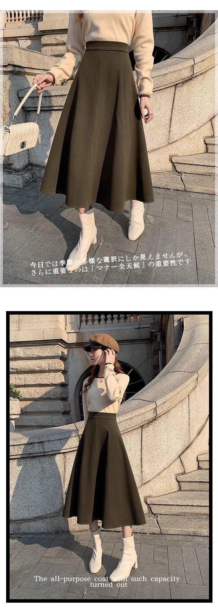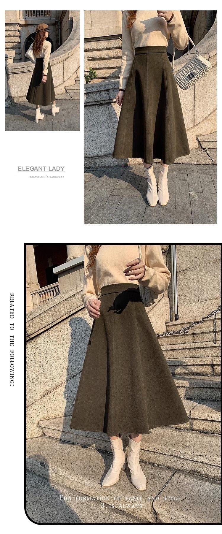 Falda Midi de Lana Caqui para Mujer Nuevo Otoño Invierno Línea A Largo Medio Cintura Alta Adelgazante Falda Paraguas para Mujer Petite