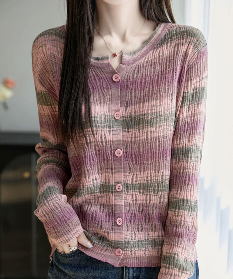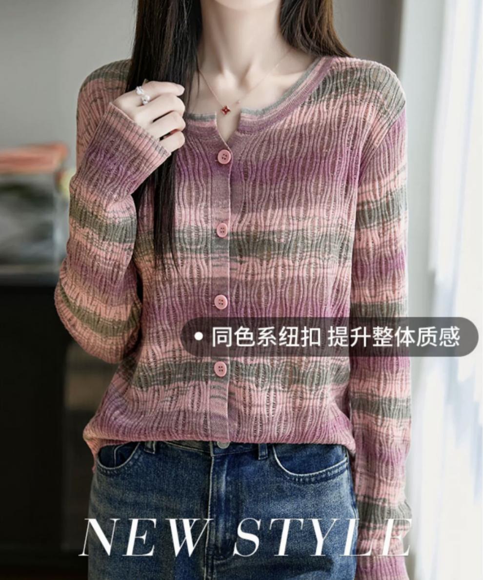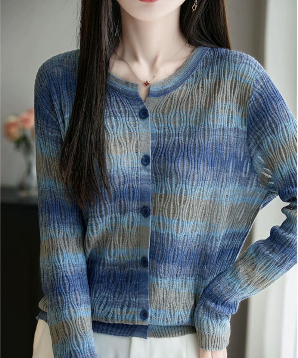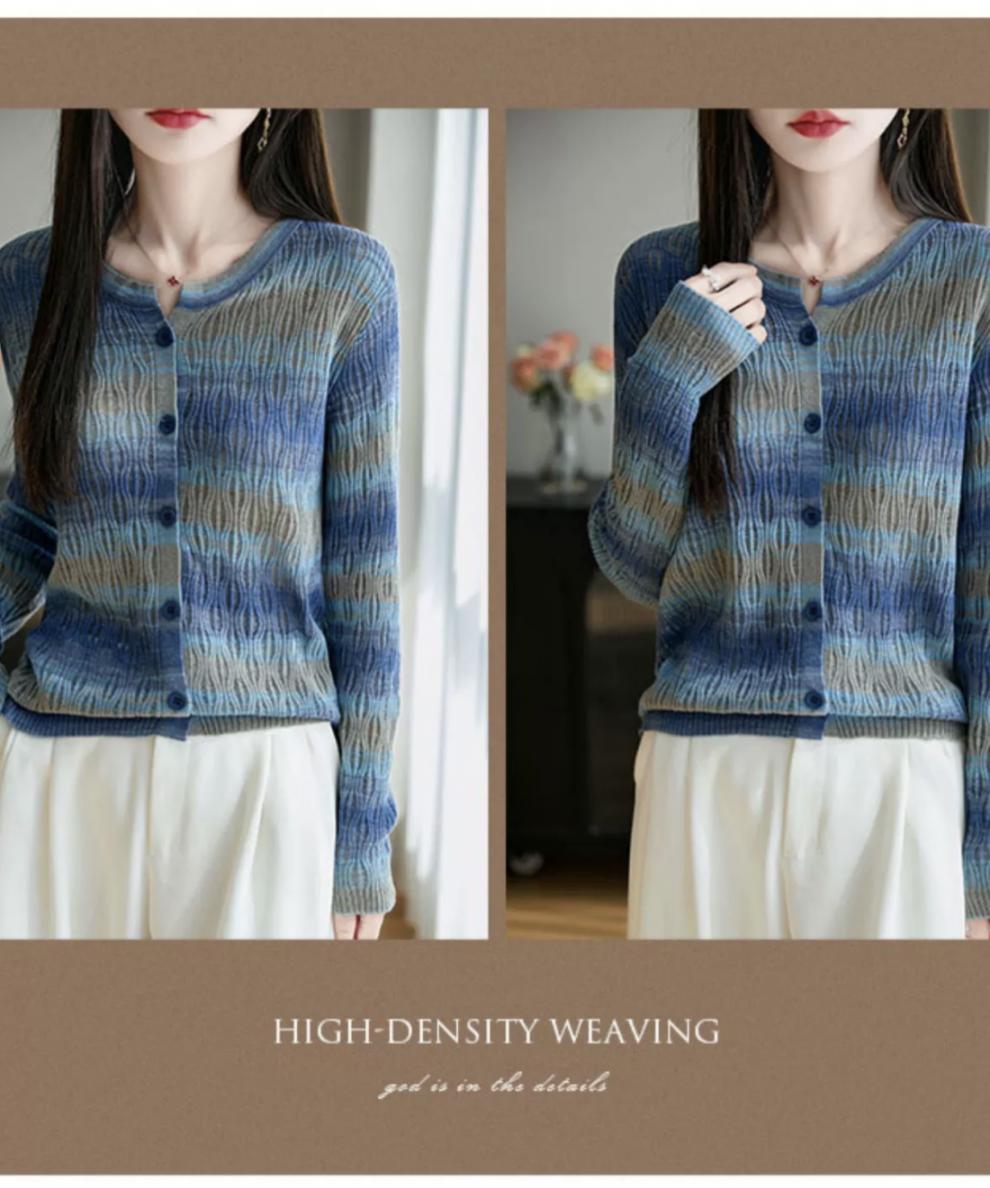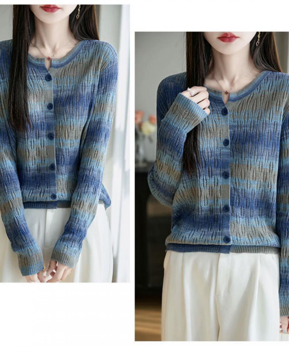Cárdigan de Punto de Alta Gama Calado con Bloques de Color y Rayas Arcoíris para Mujer, Ropa Exterior Ligera, Ropa con Protección Solar, Diseño con Sentido de la Moda, Top Pequeño a la Moda