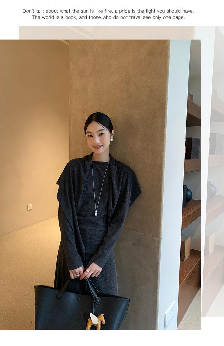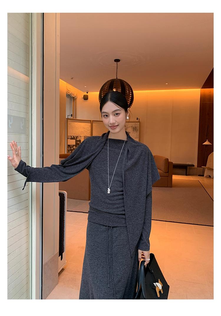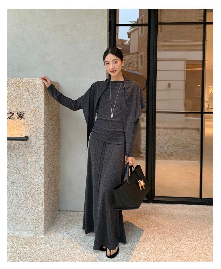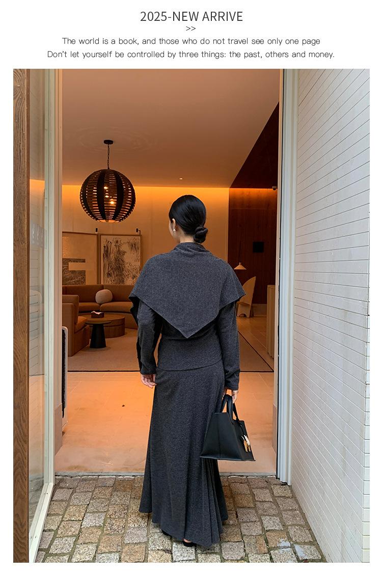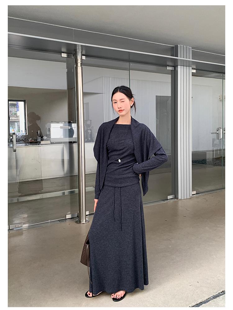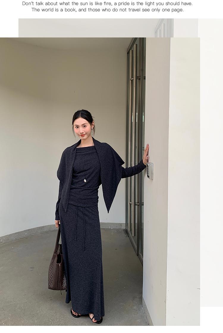 Aixi Li 2025 Otoño Chal Abrigo + Prenda Interior Tejida de un Hombro + Falda Midi Adelgazante Conjunto de Tres Piezas 15339