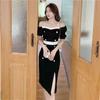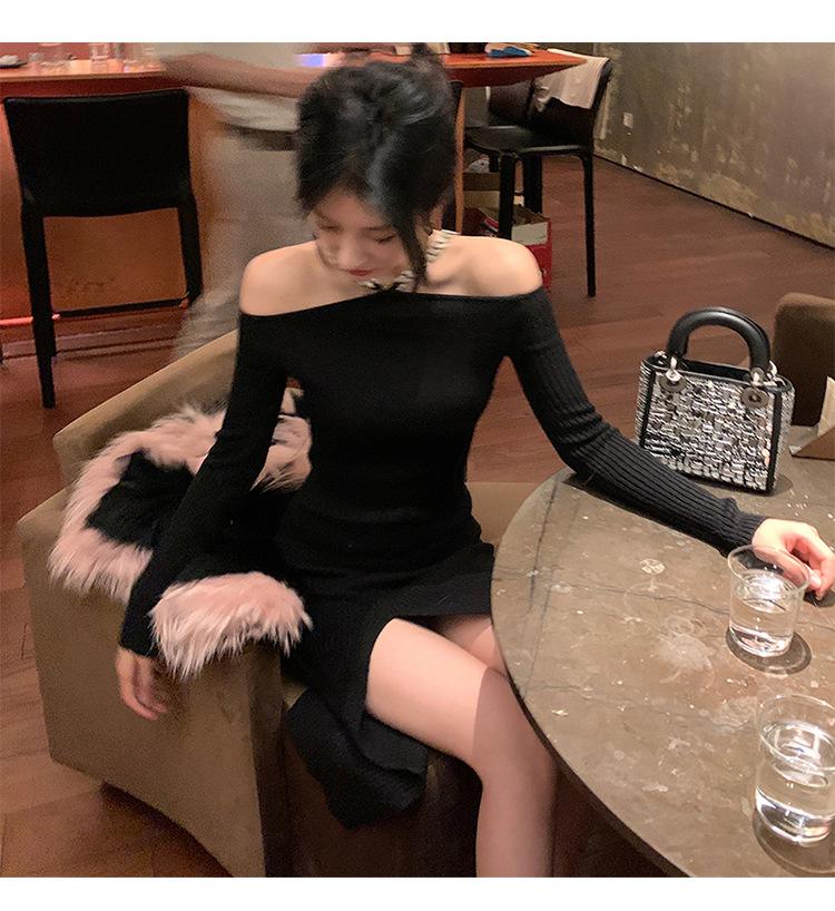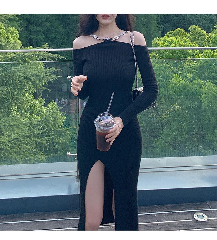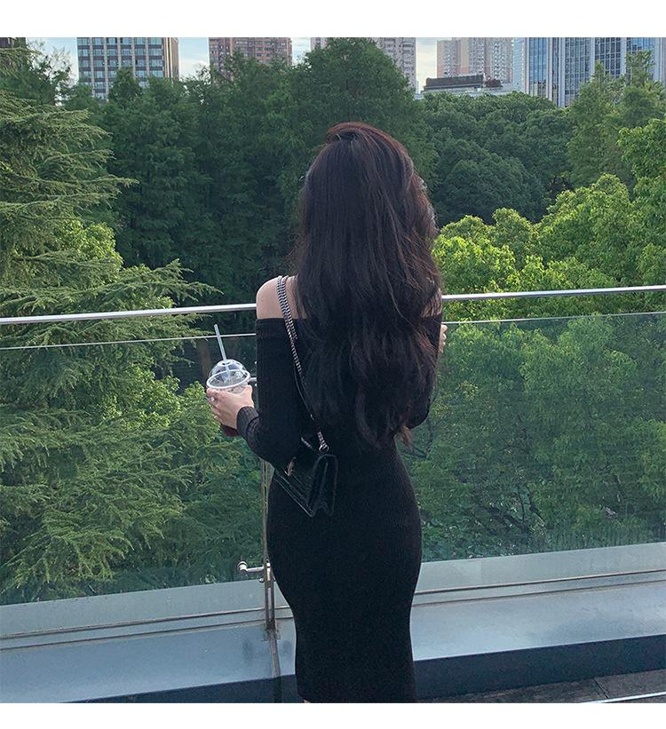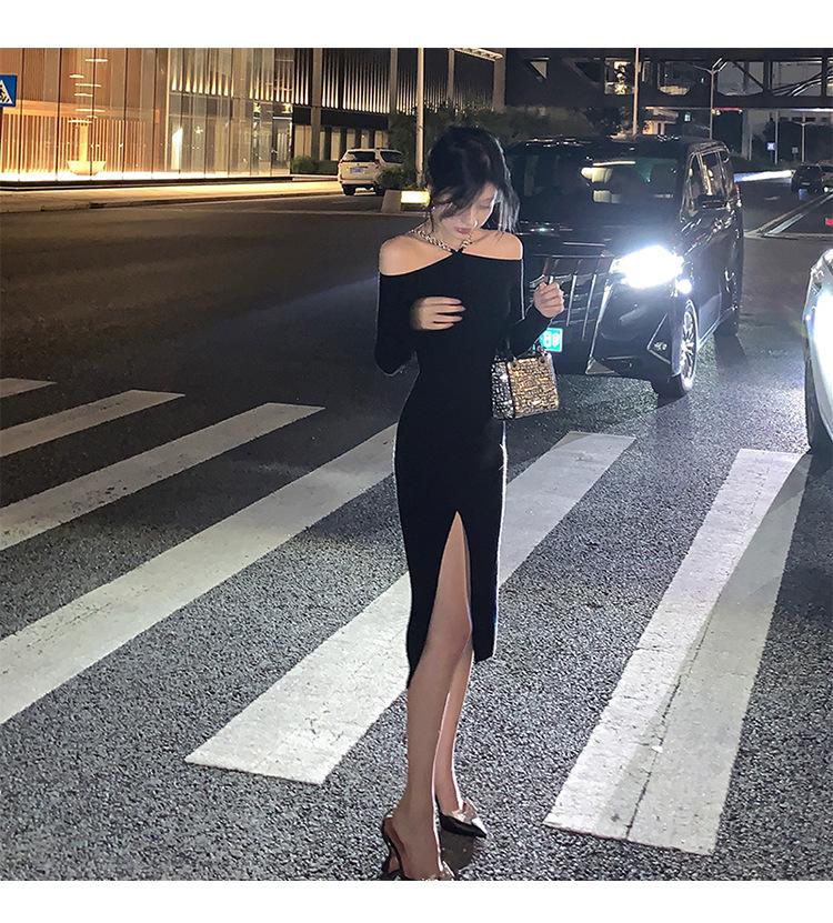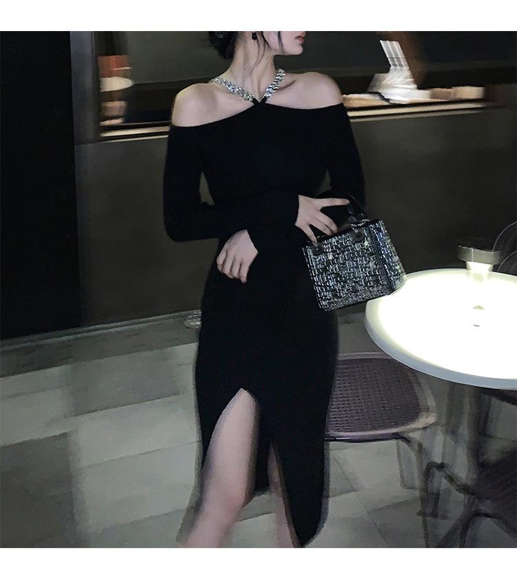 Sexy fuera del hombro Elegante Vestido Negro Pequeño Cadena para Mujer Fuera del Hombro Cuello Abertura Ajustado Cadera