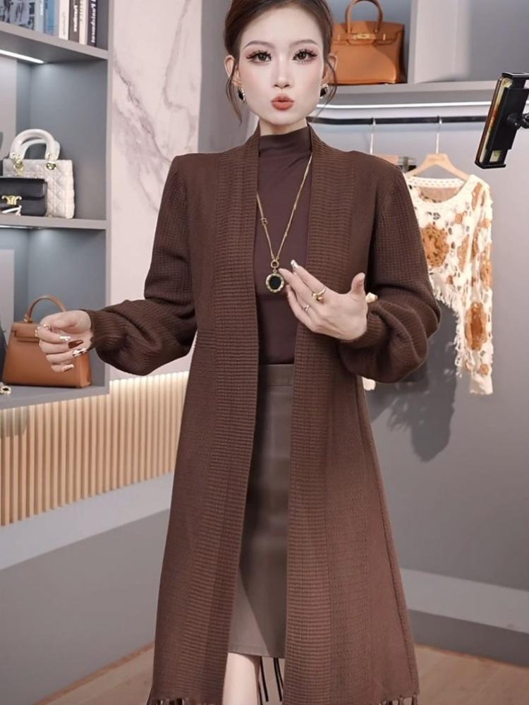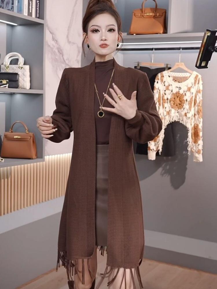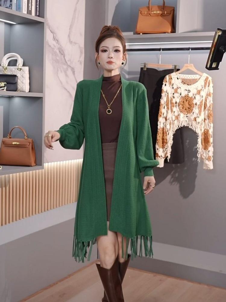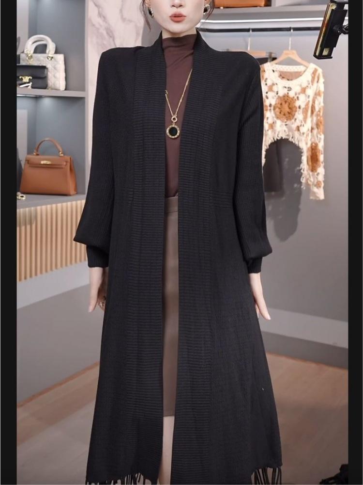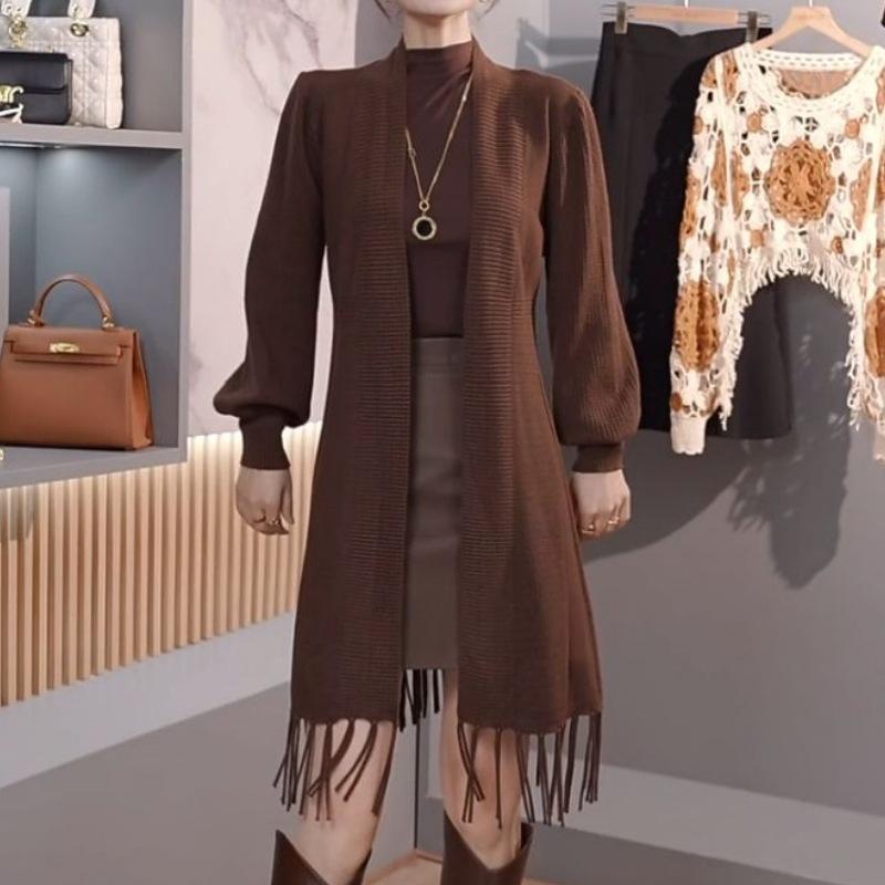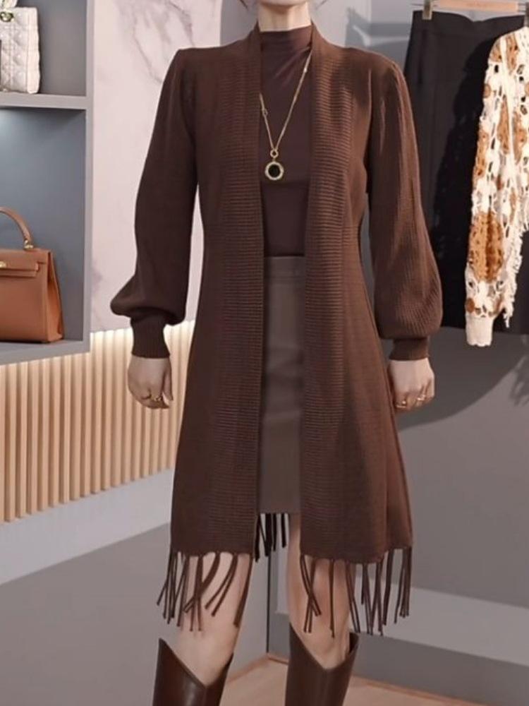 Abrigo de Borlas Tejido de Color Sólido Otoño Invierno Suéter Cárdigan Exterior de Largo Medio Ropa de Otoño Moda Versátil Estilo Commute para Mujer