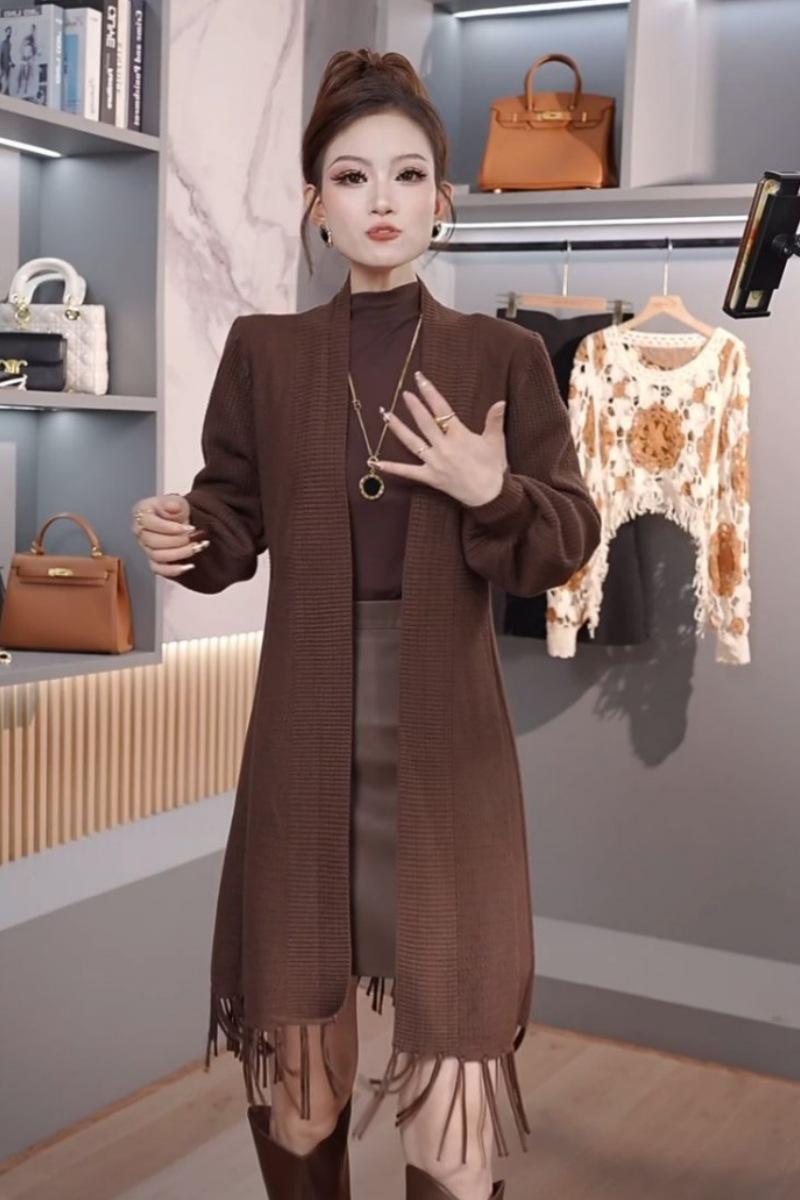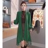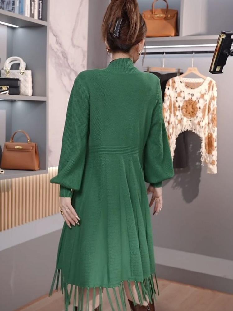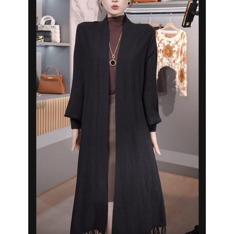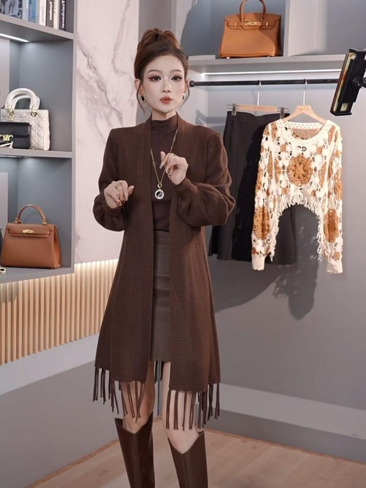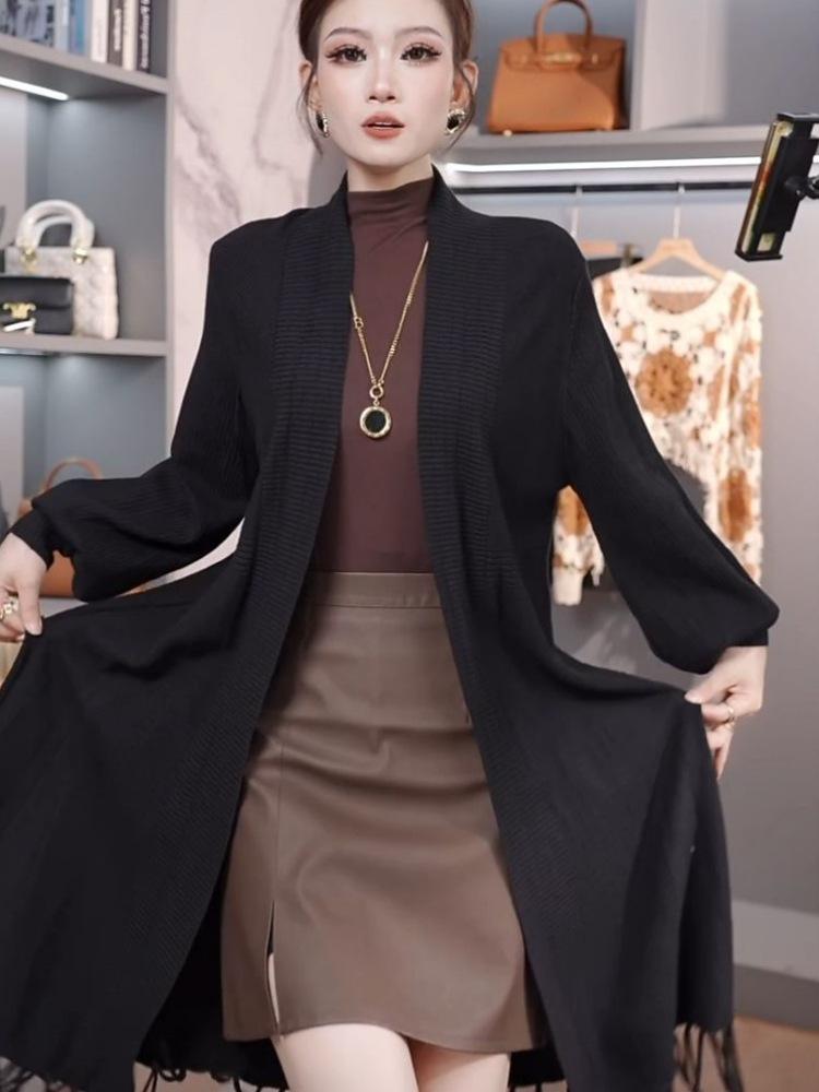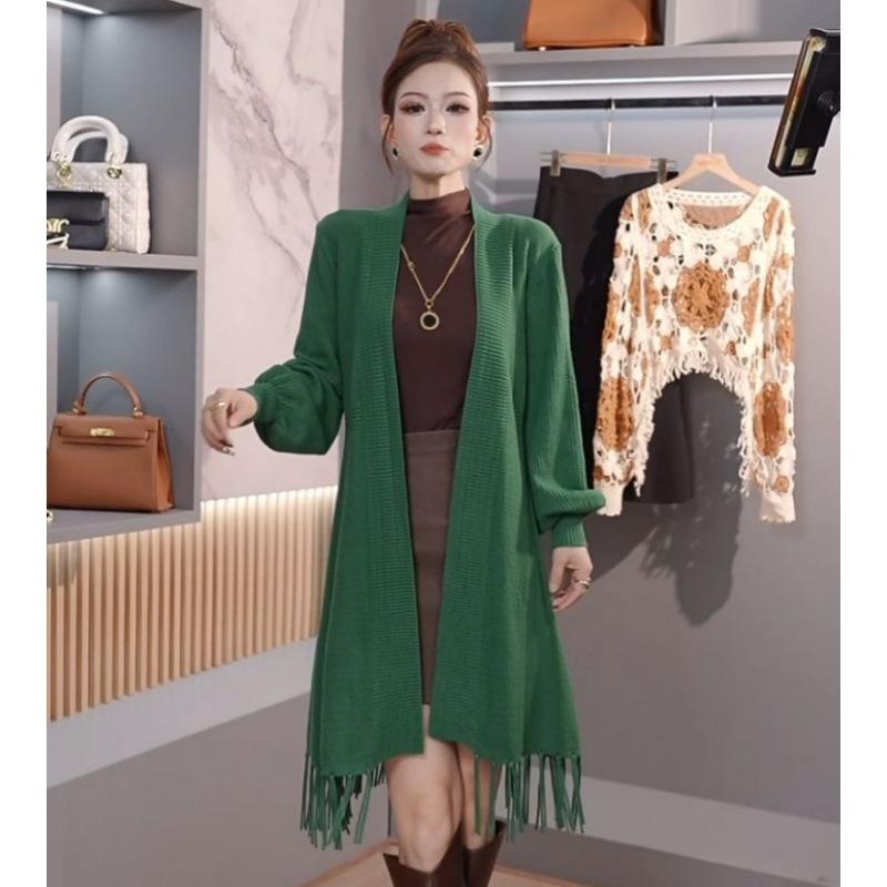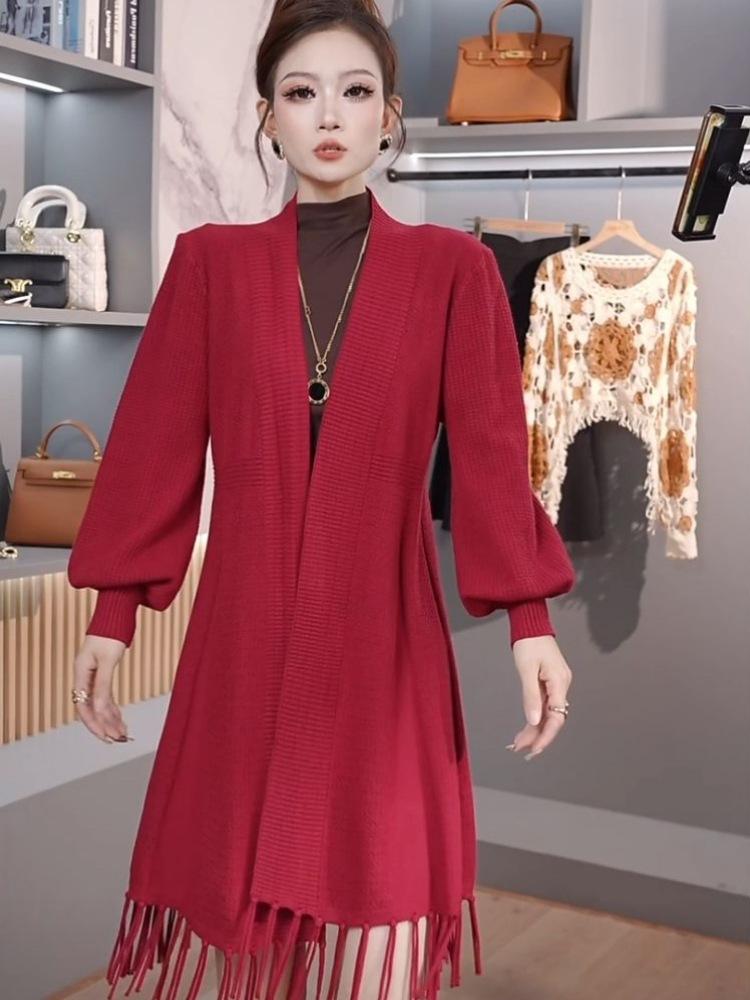 Abrigo de Borlas Tejido de Color Sólido Otoño Invierno Suéter Cárdigan Exterior de Largo Medio Ropa de Otoño Moda Versátil Estilo Commute para Mujer