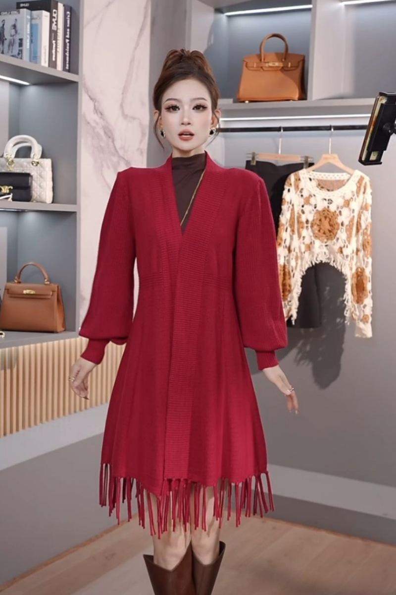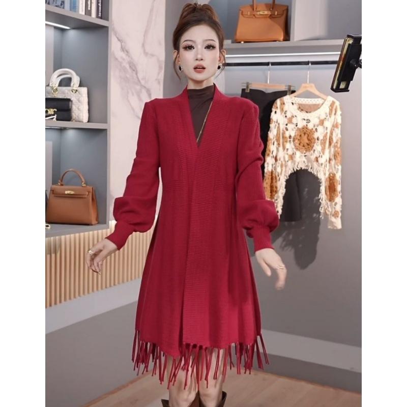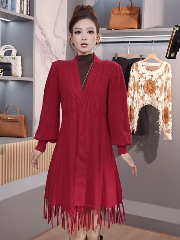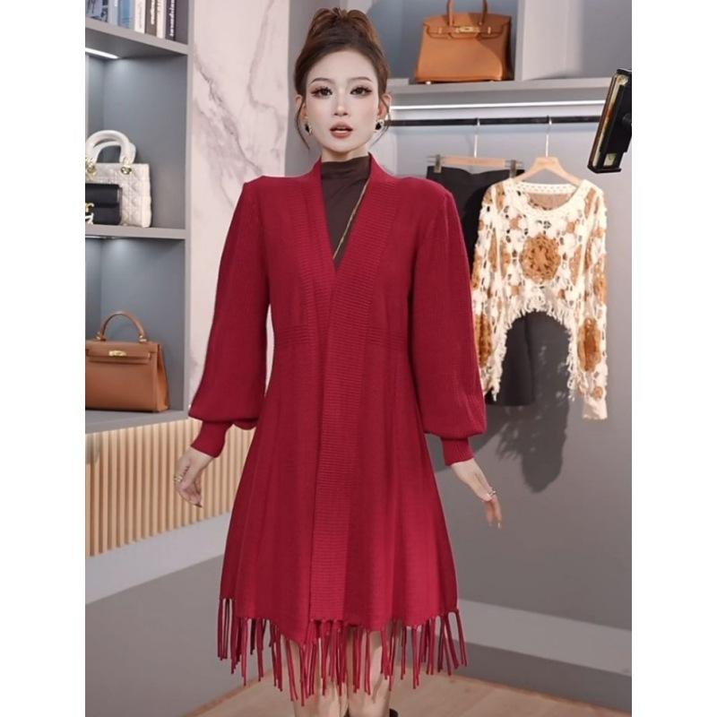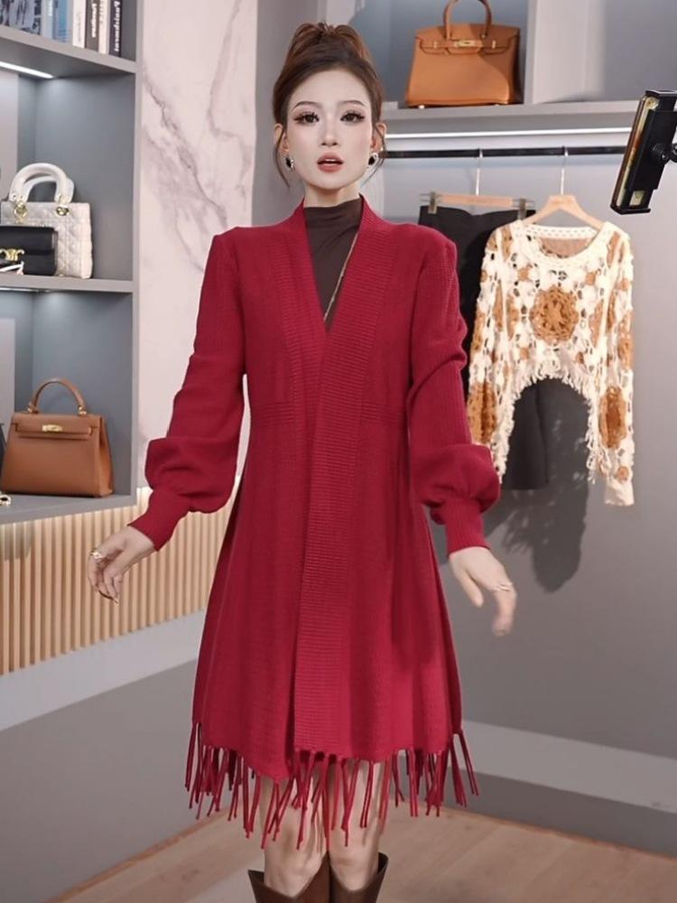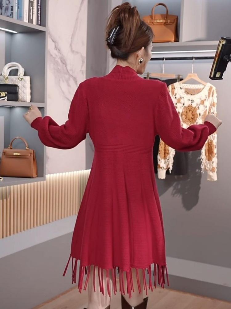 Abrigo de Borlas Tejido de Color Sólido Otoño Invierno Suéter Cárdigan Exterior de Largo Medio Ropa de Otoño Moda Versátil Estilo Commute para Mujer