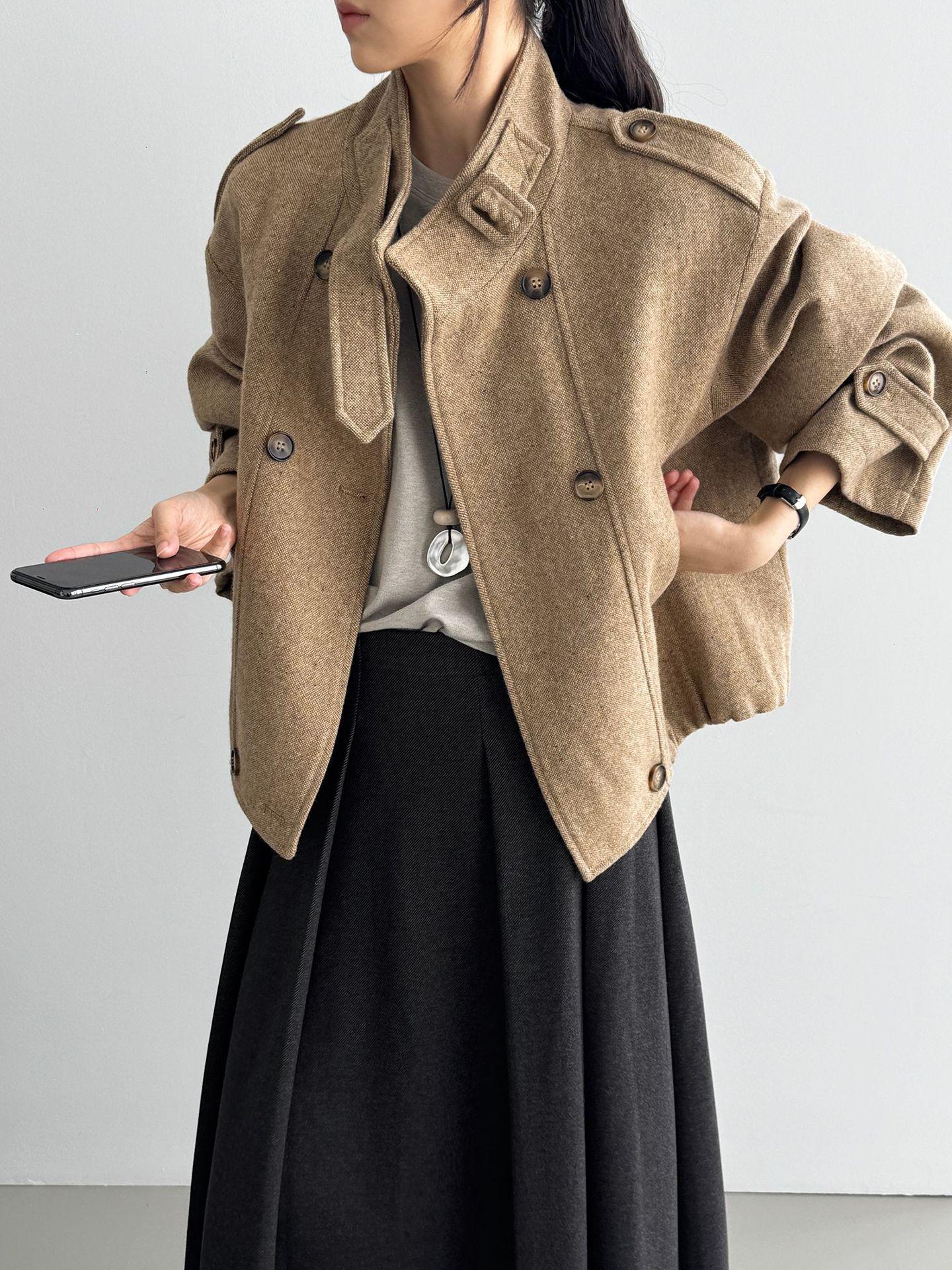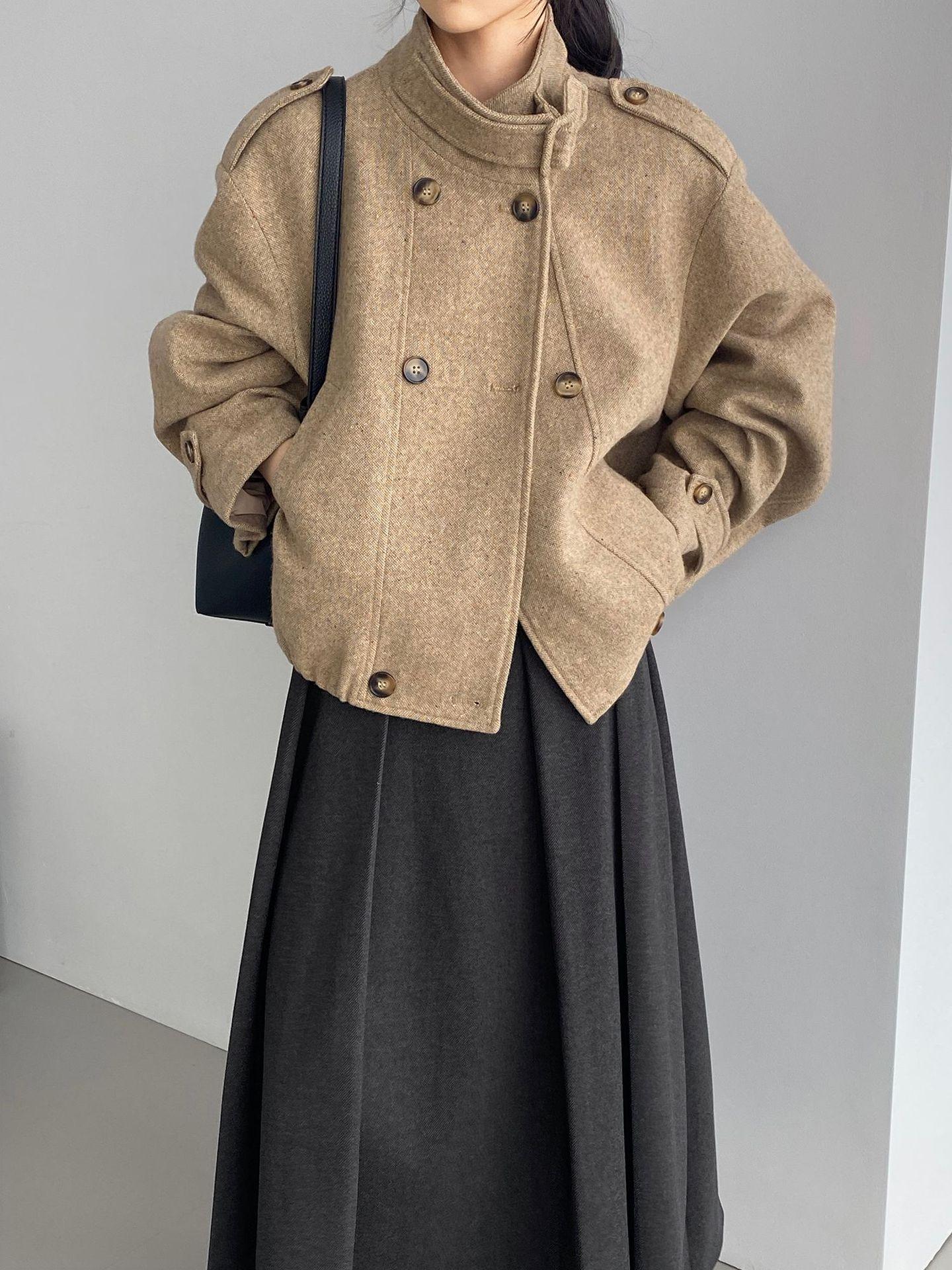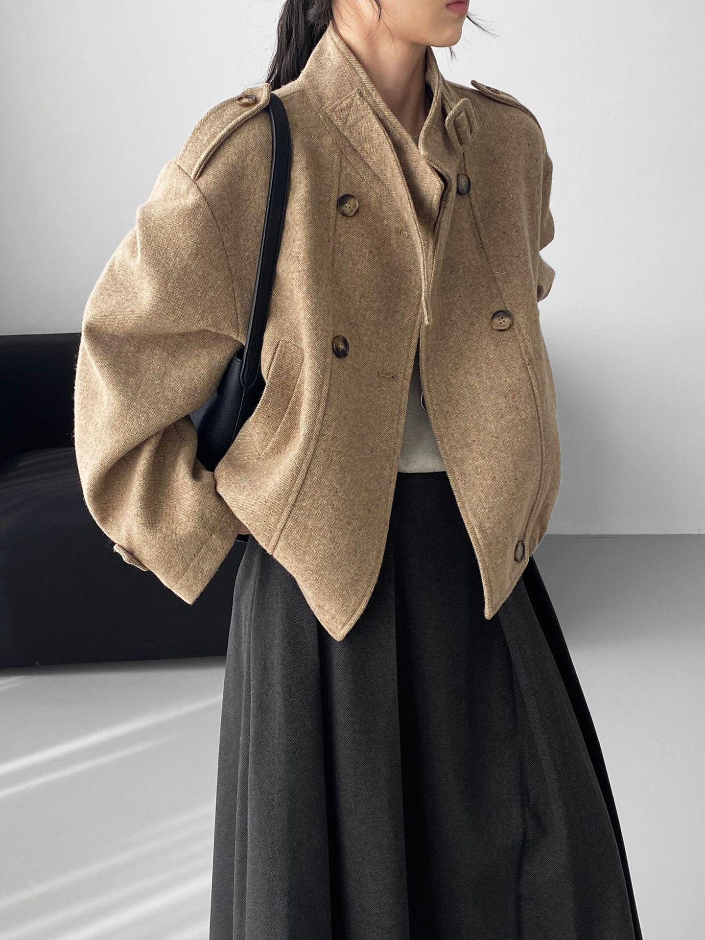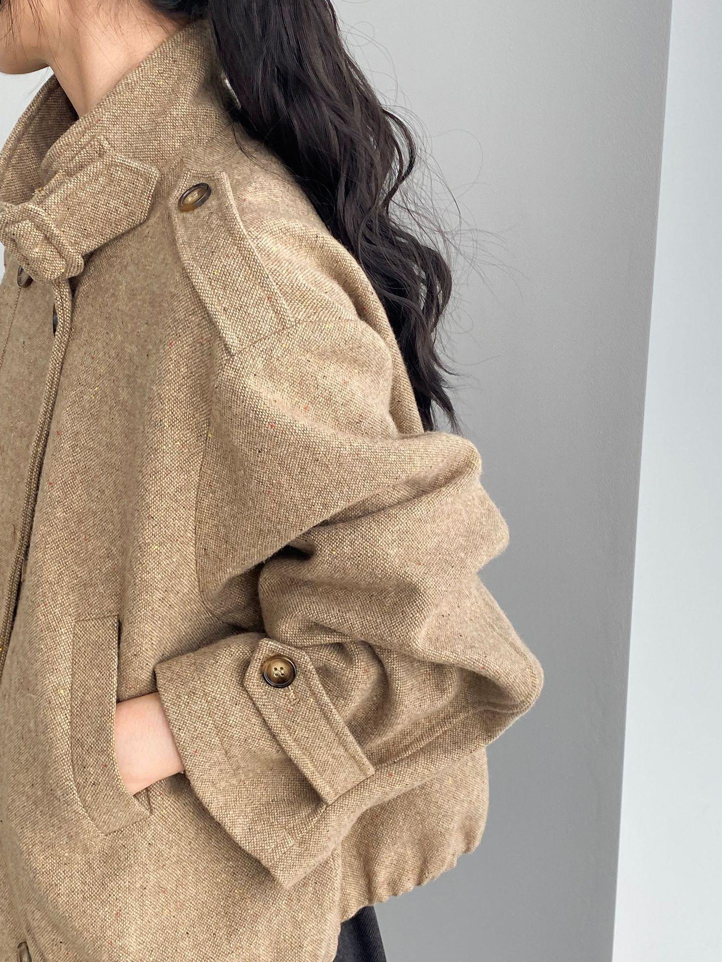 Abrigo coreano retro de alta gama de tweed moteado para mujer, petite, casual, versátil, con cuello alto, chaqueta 6155
