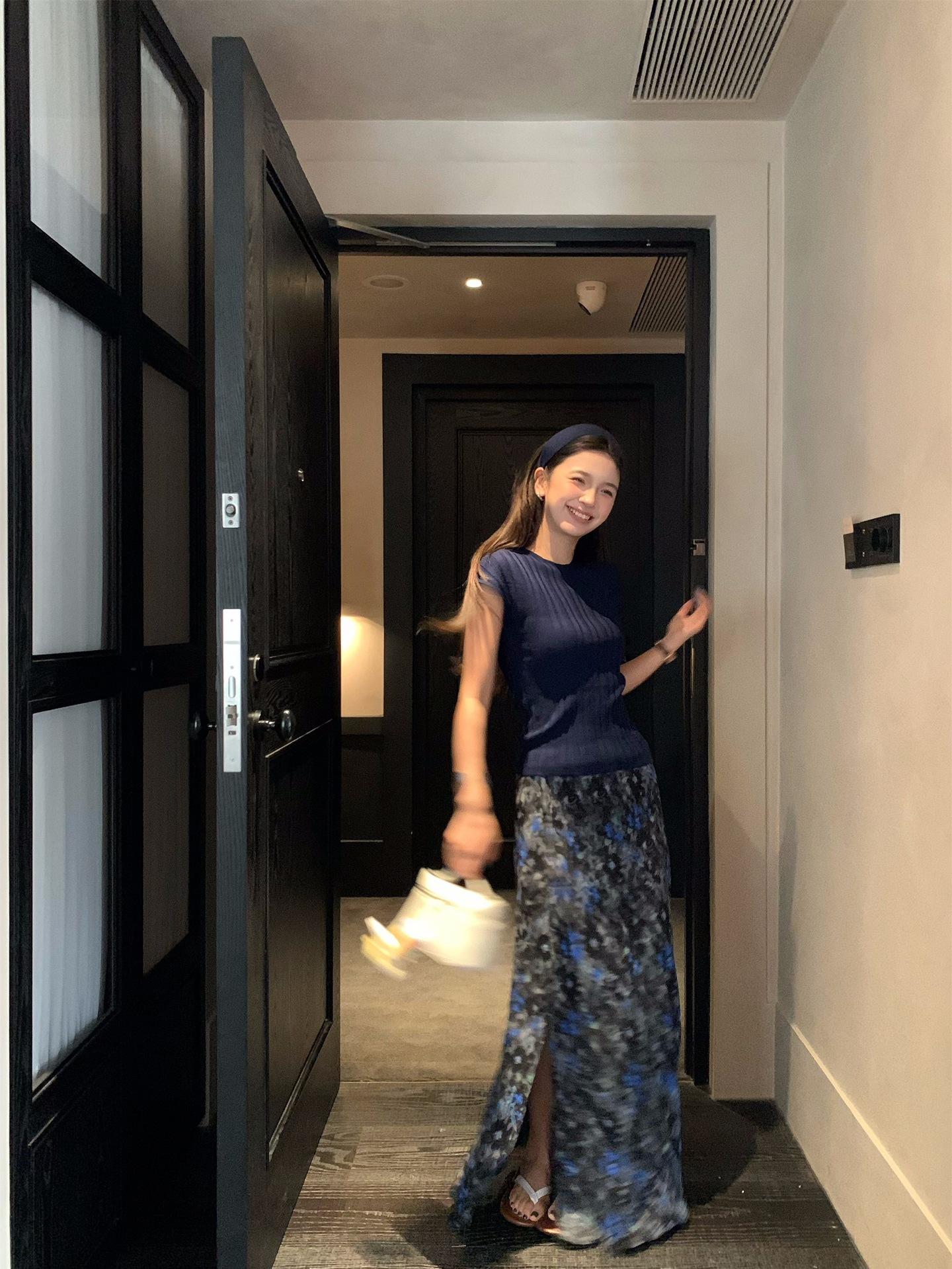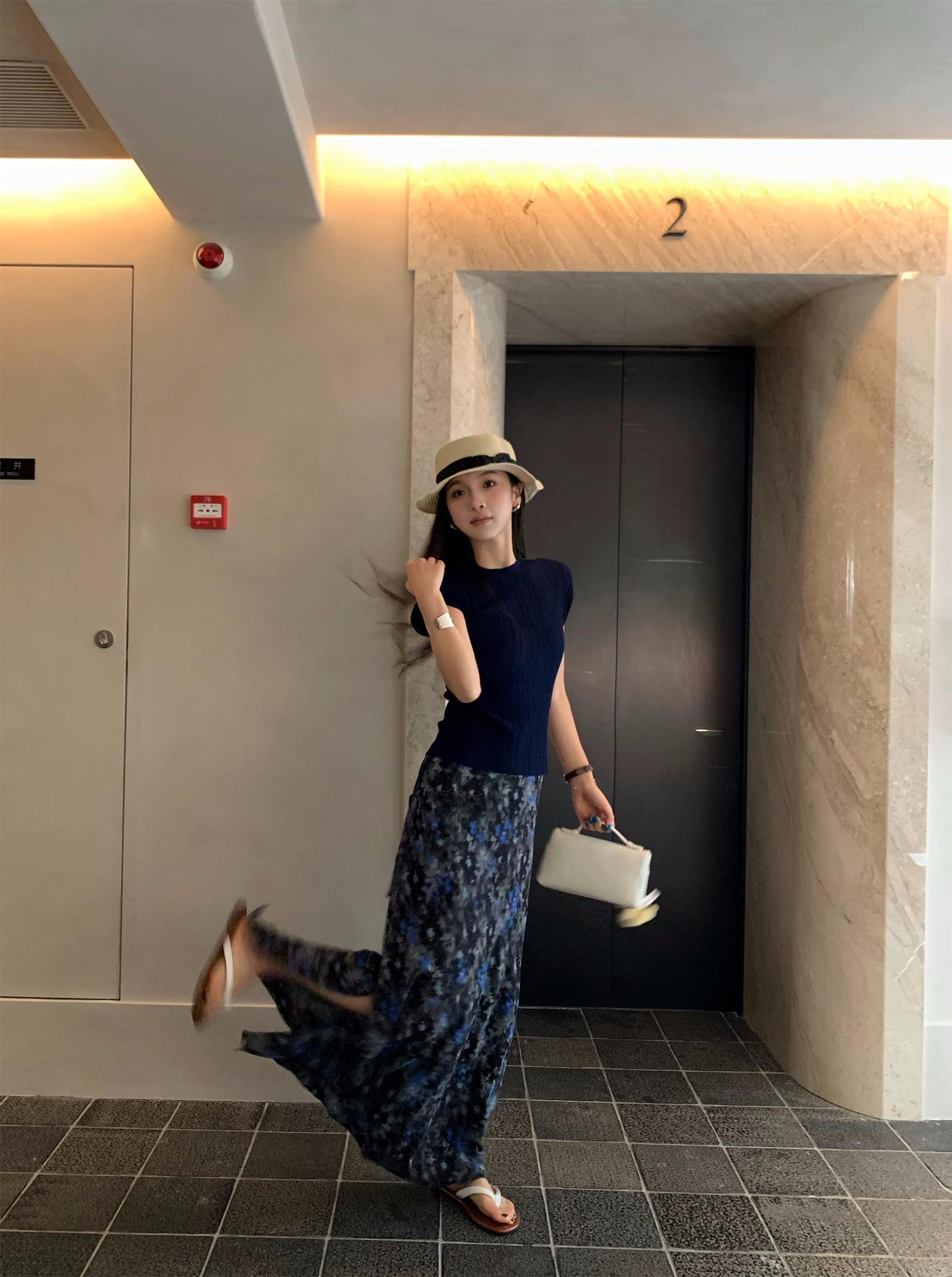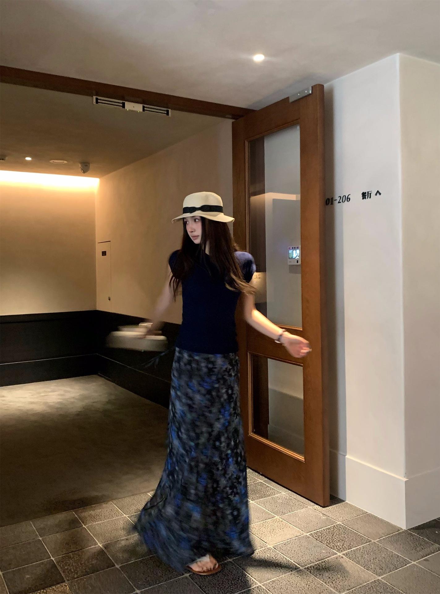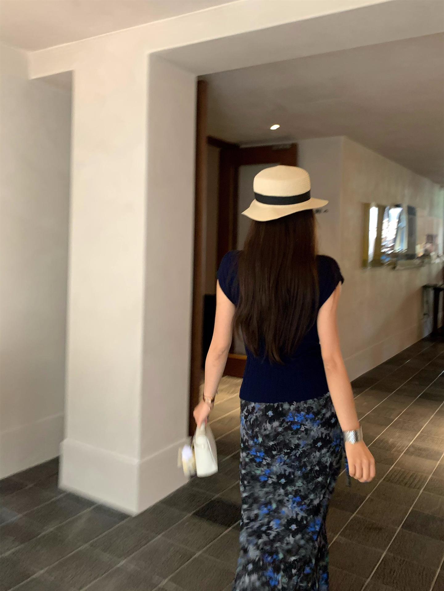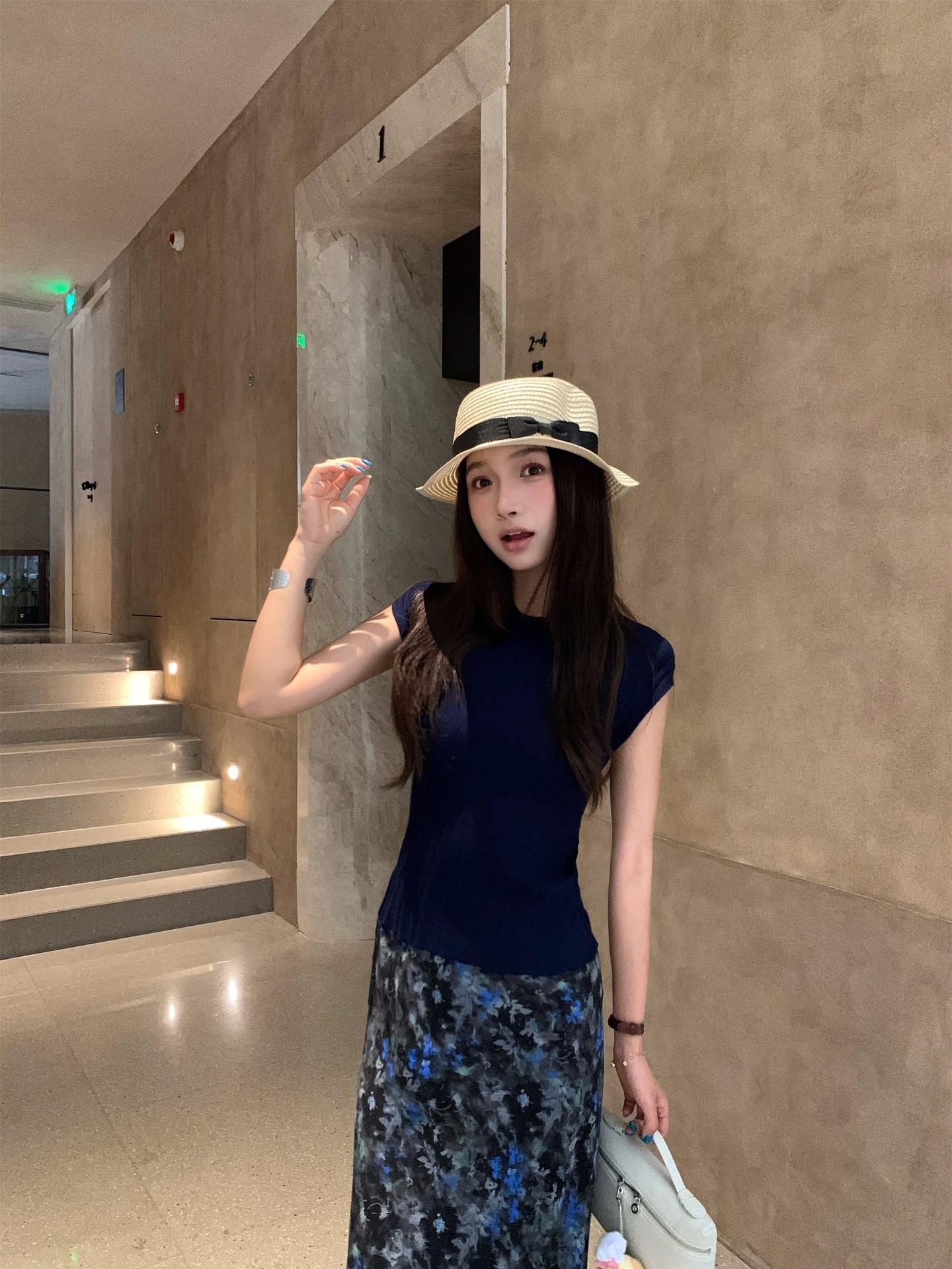 Conjunto de Moda de Temperamento Retro para Mujer Verano 2025 Nuevo Top Azul Marino de Manga Corta Falda Midi Estampado Floral Conjunto de Dos Piezas