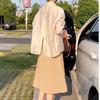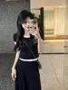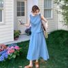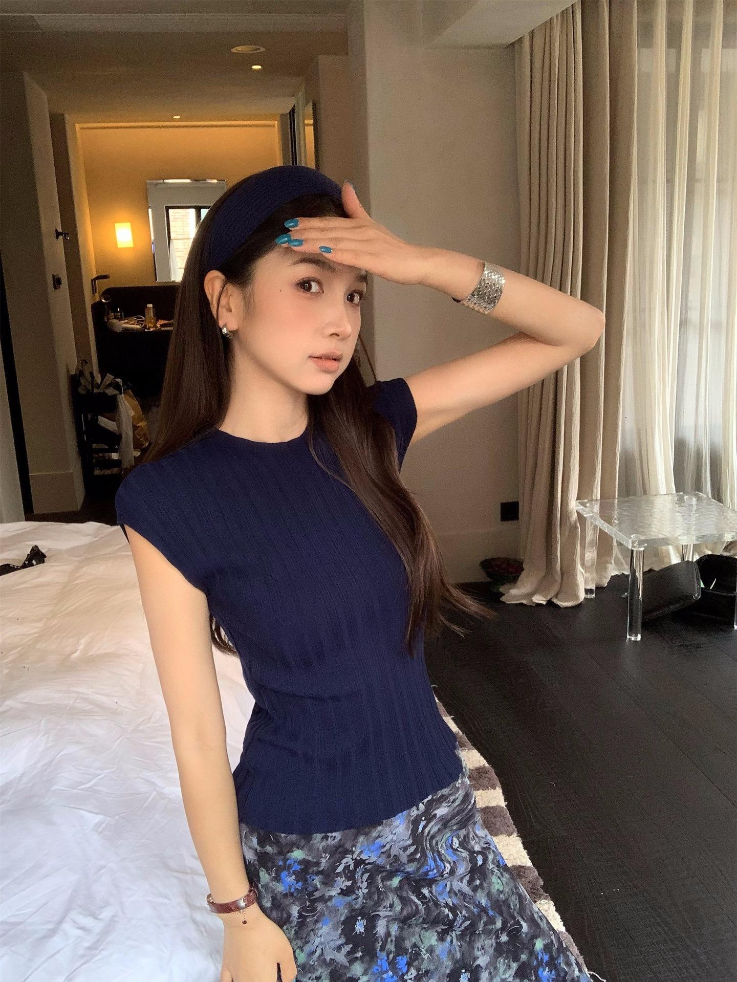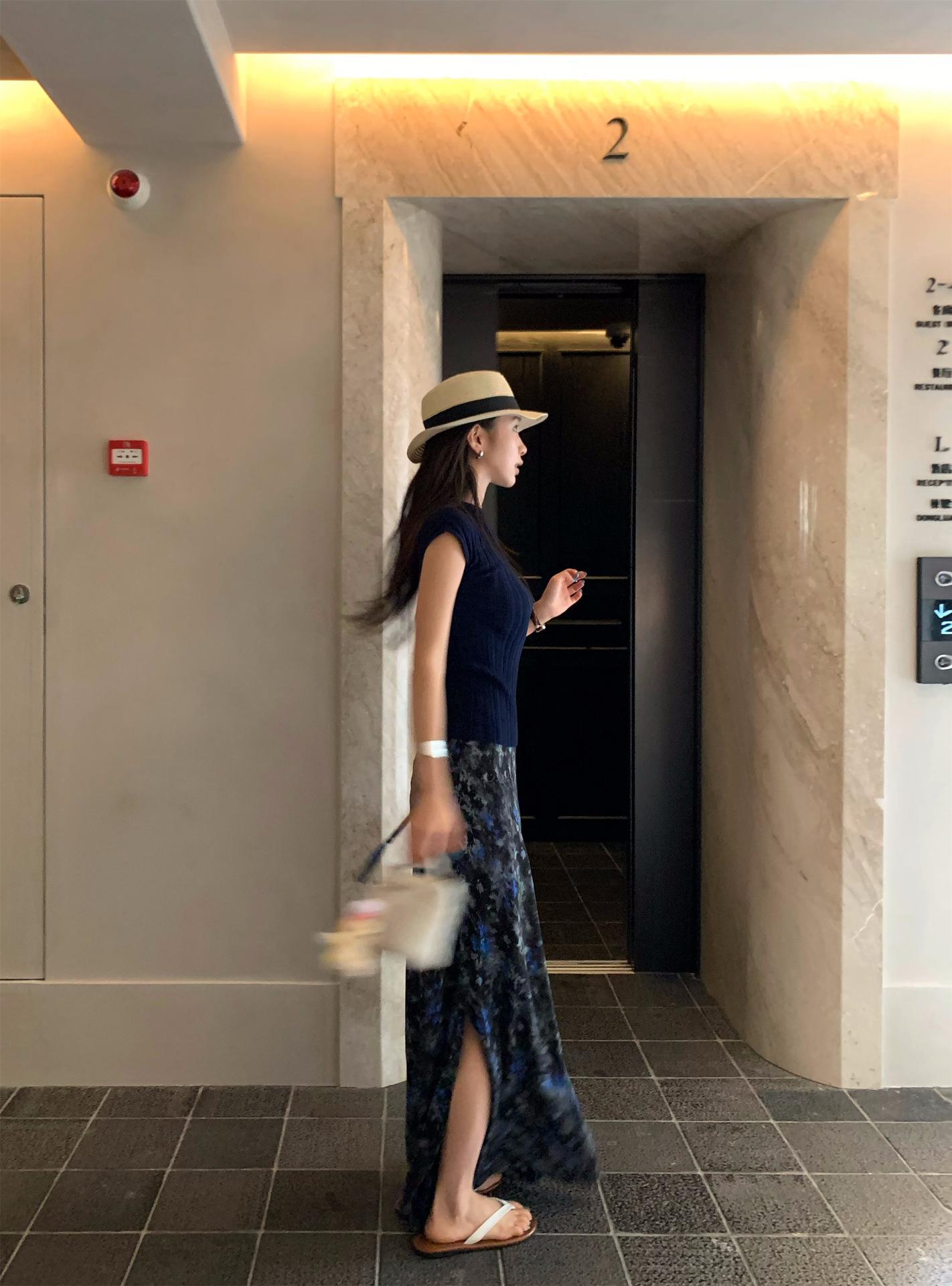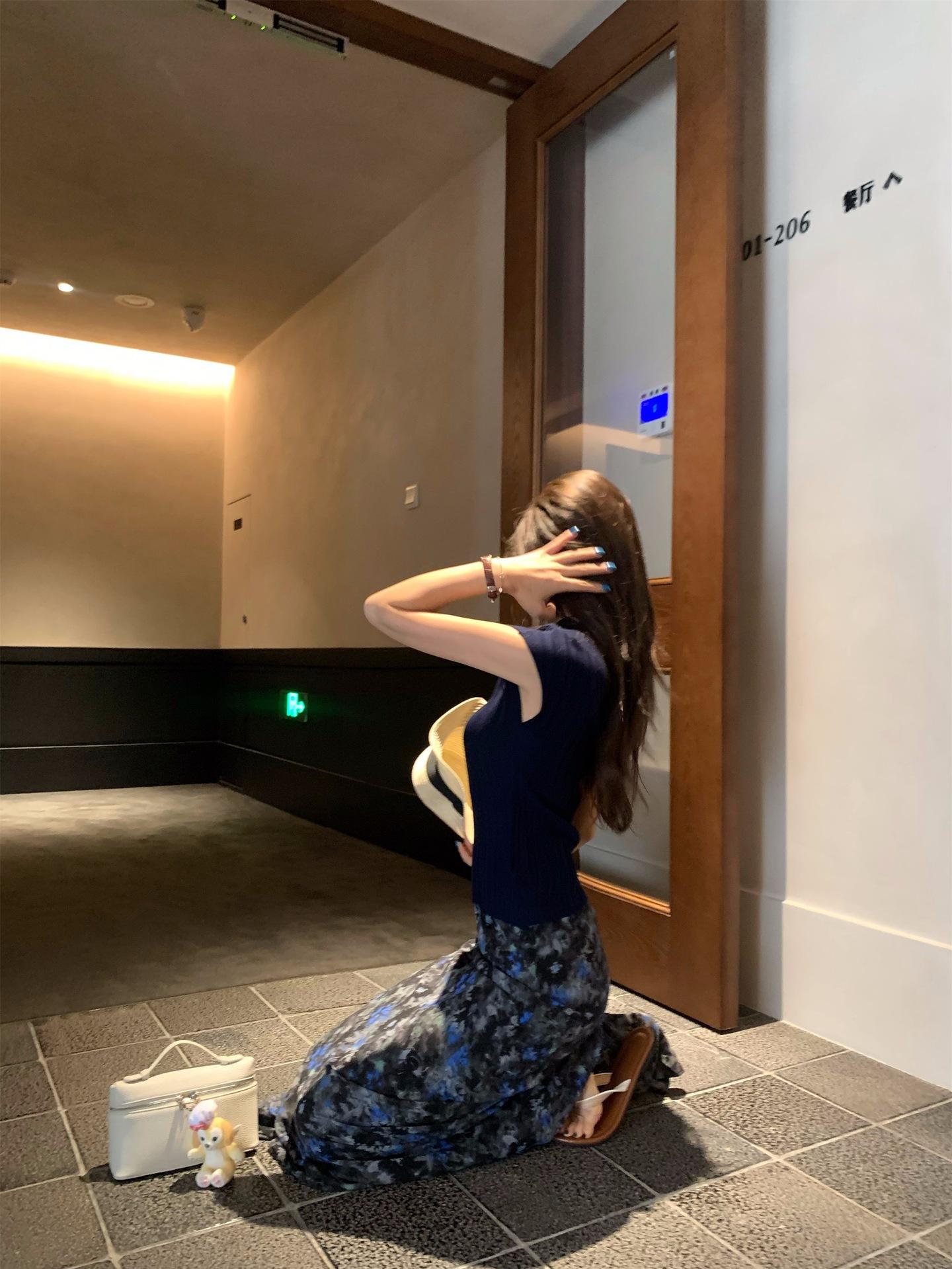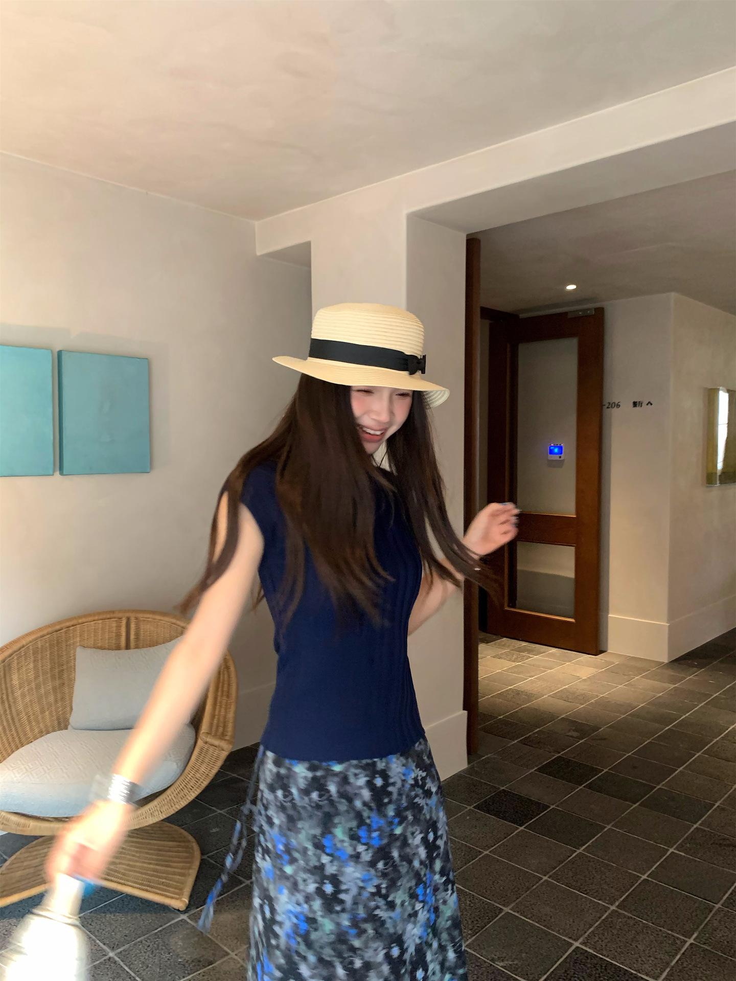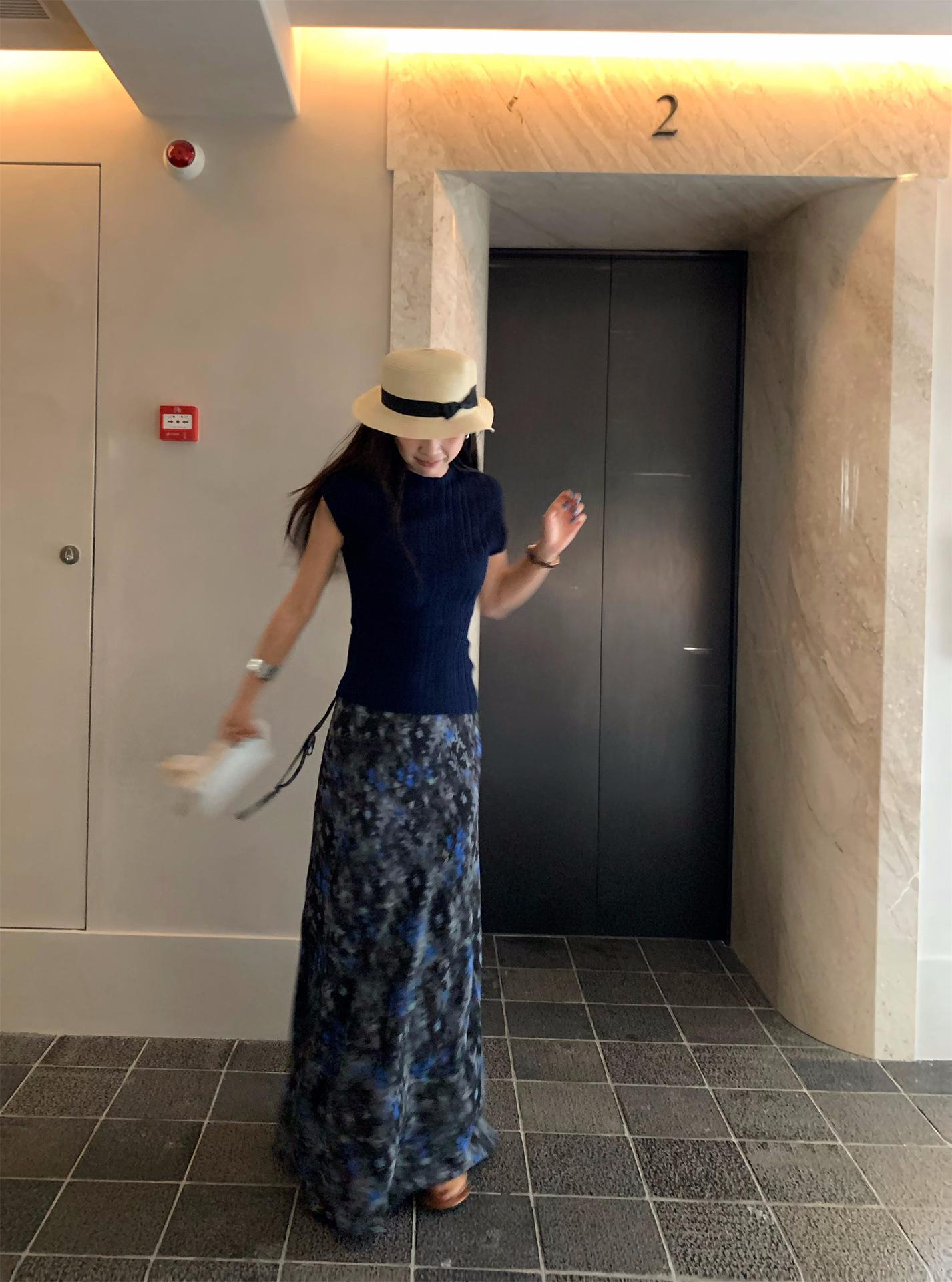 Conjunto de Moda de Temperamento Retro para Mujer Verano 2025 Nuevo Top Azul Marino de Manga Corta Falda Midi Estampado Floral Conjunto de Dos Piezas