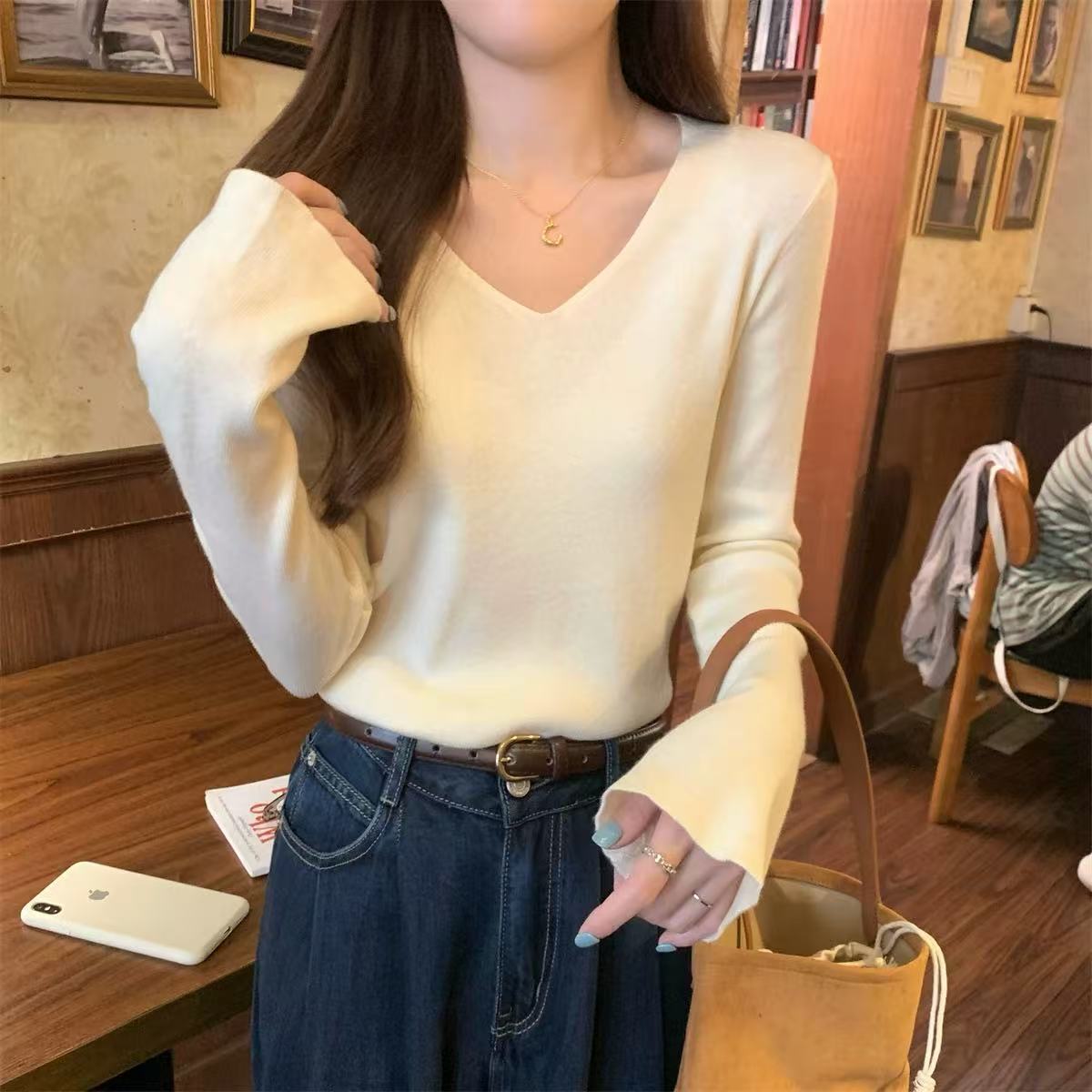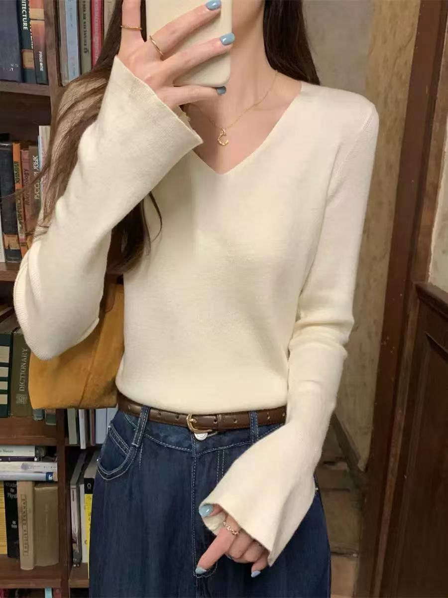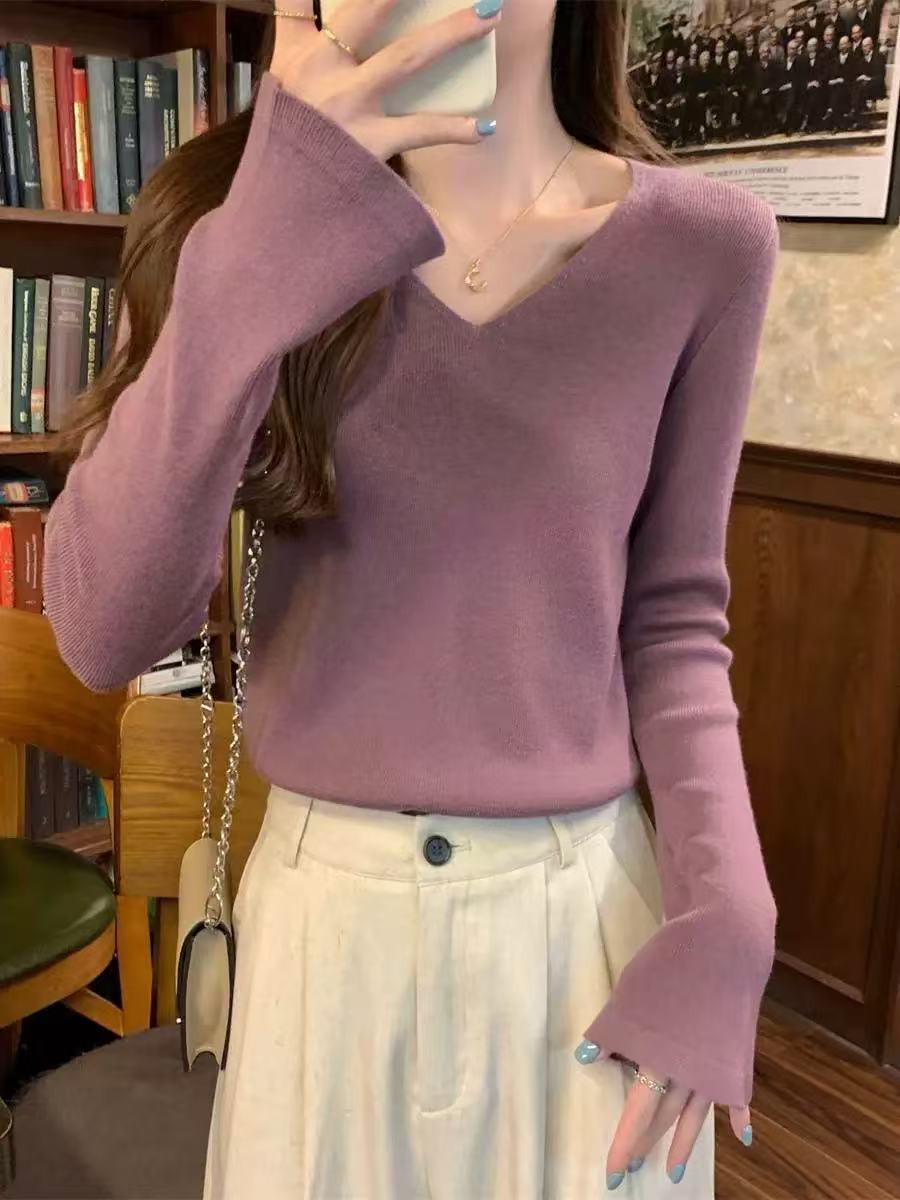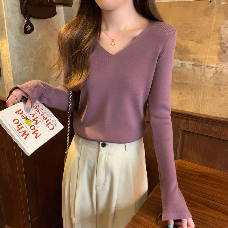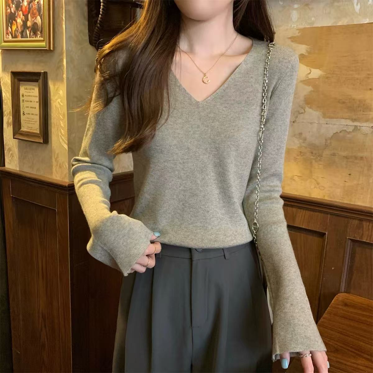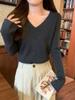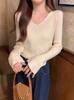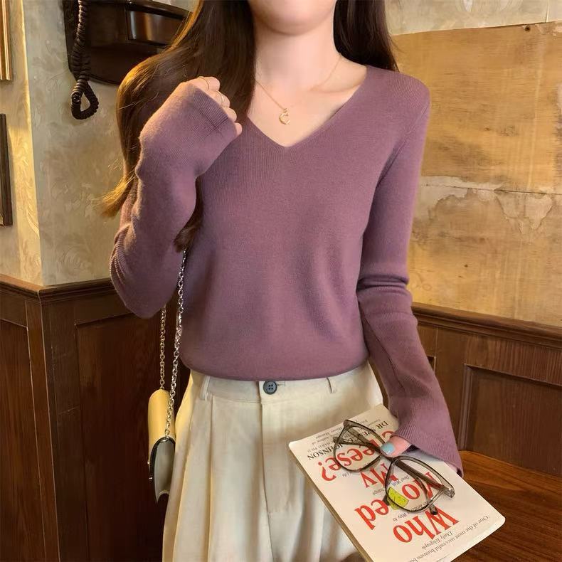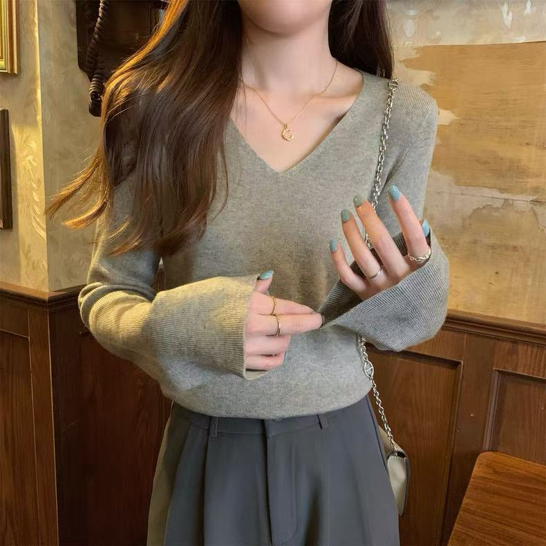 25 Suéter de Punto de Lana Pura para Mujer Nuevo Cuello en V Color Sólido Pulóver Temperamento Casual Sencillo Versátil Manga Larga Suéter Base
