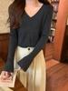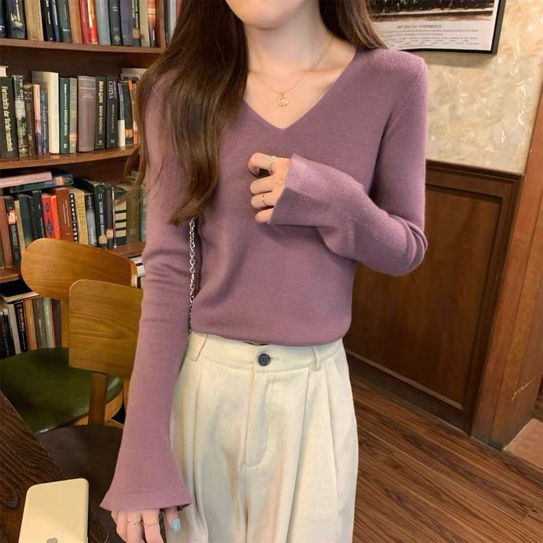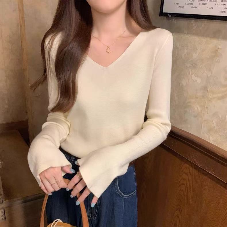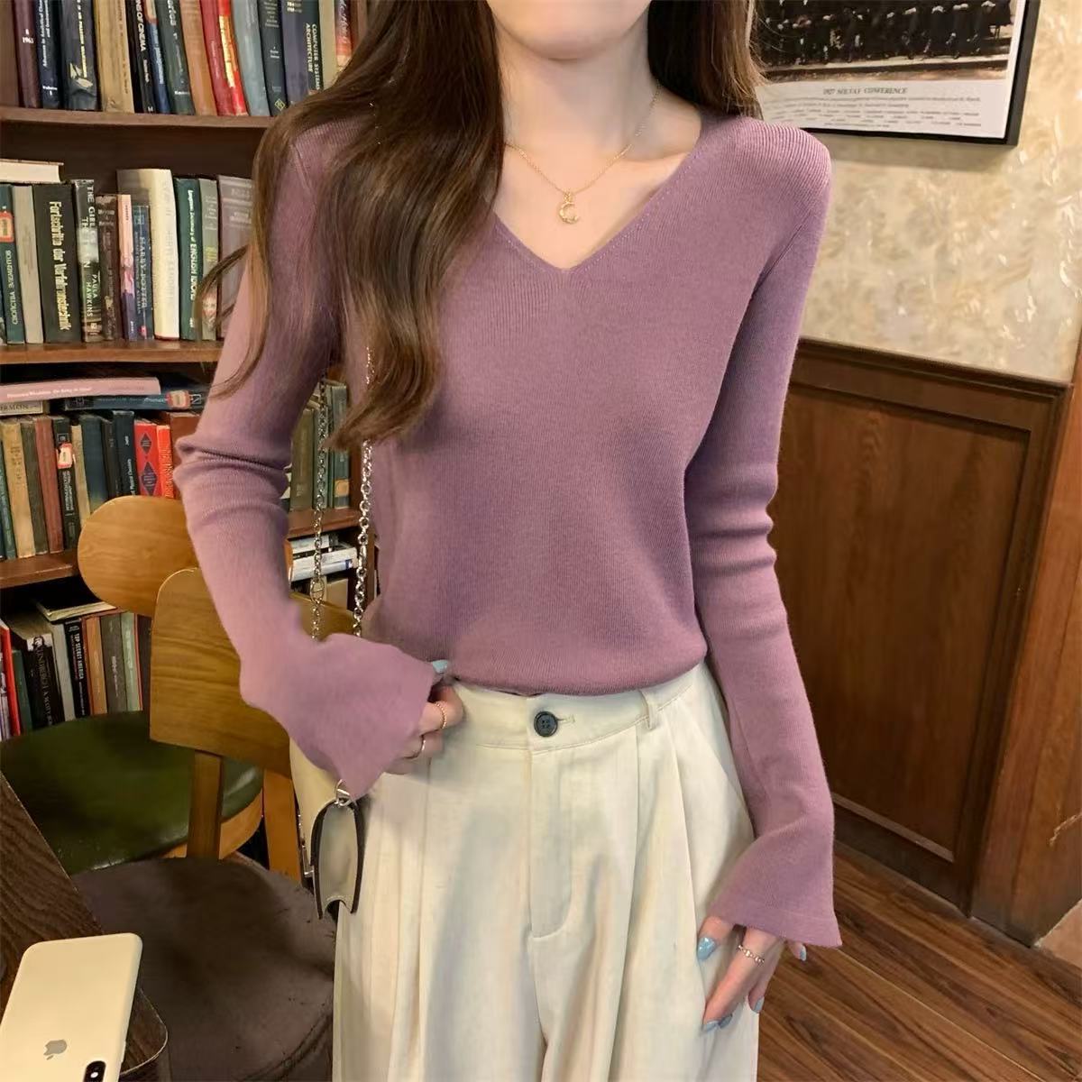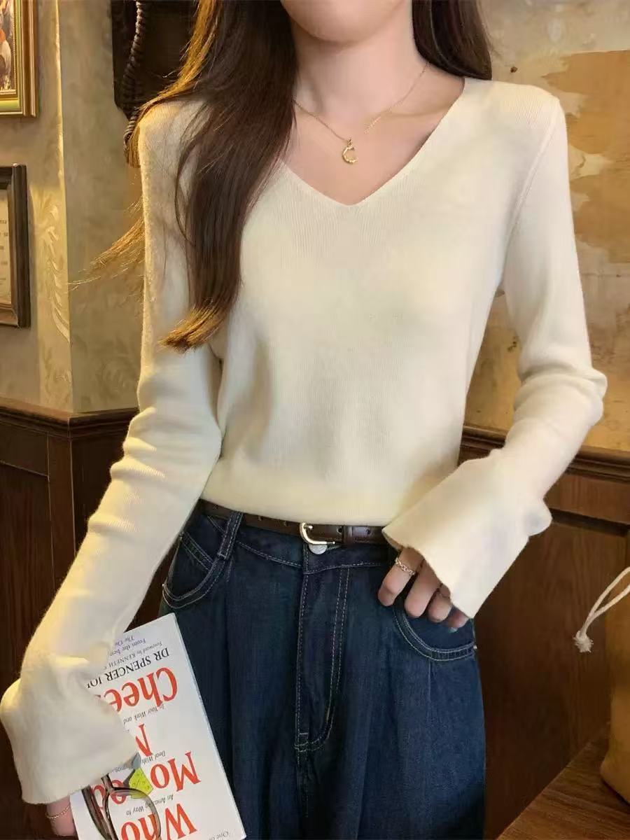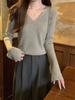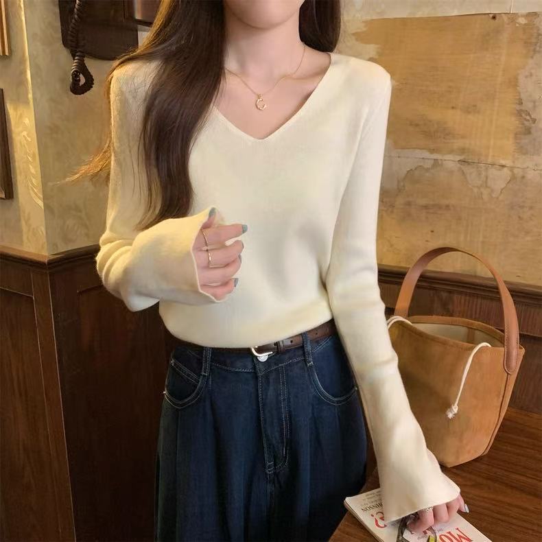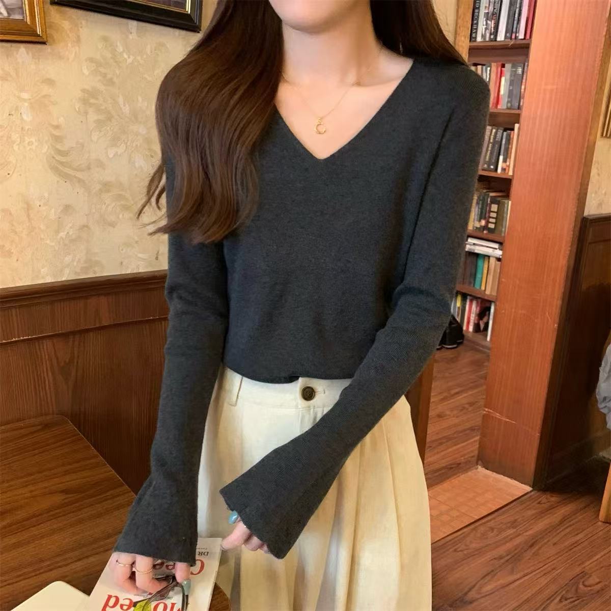 25 Suéter de Punto de Lana Pura para Mujer Nuevo Cuello en V Color Sólido Pulóver Temperamento Casual Sencillo Versátil Manga Larga Suéter Base