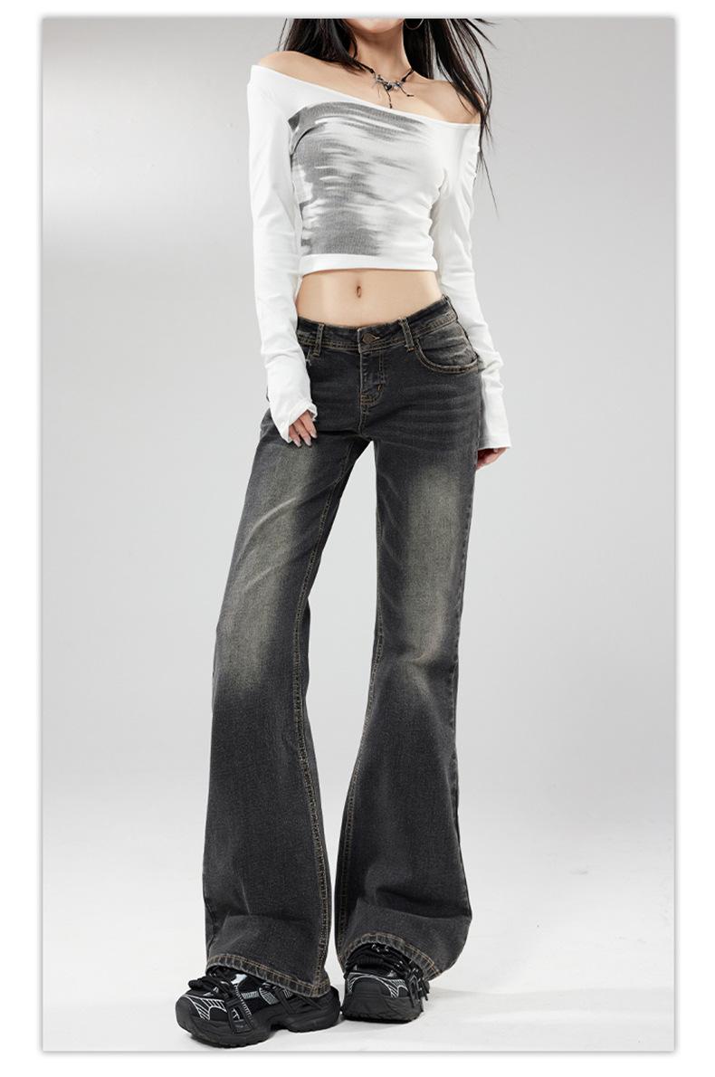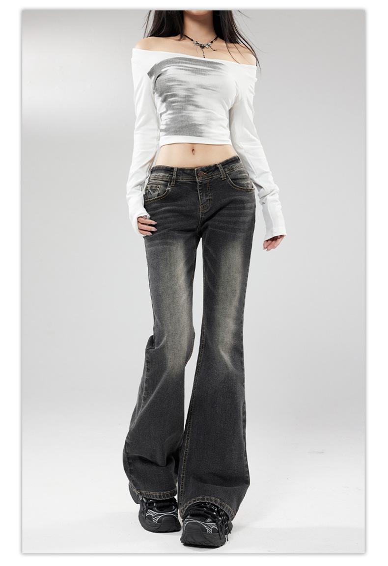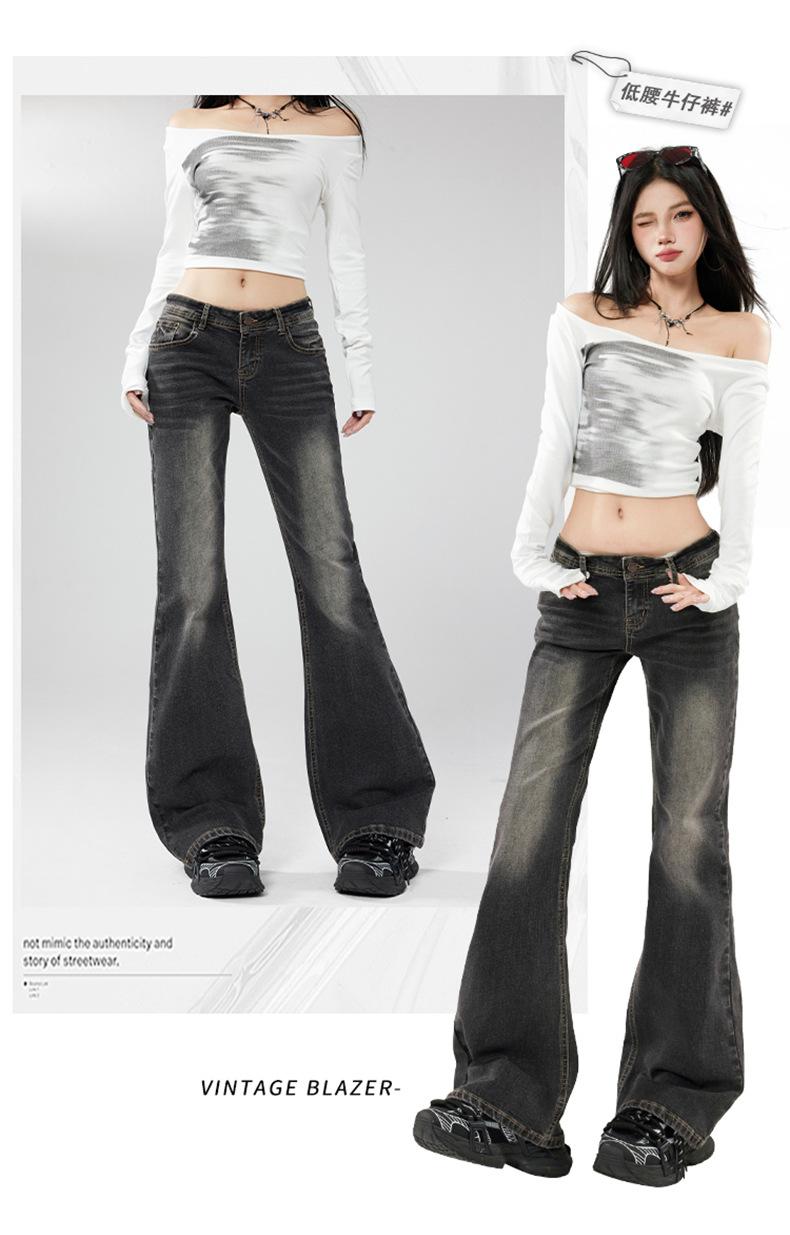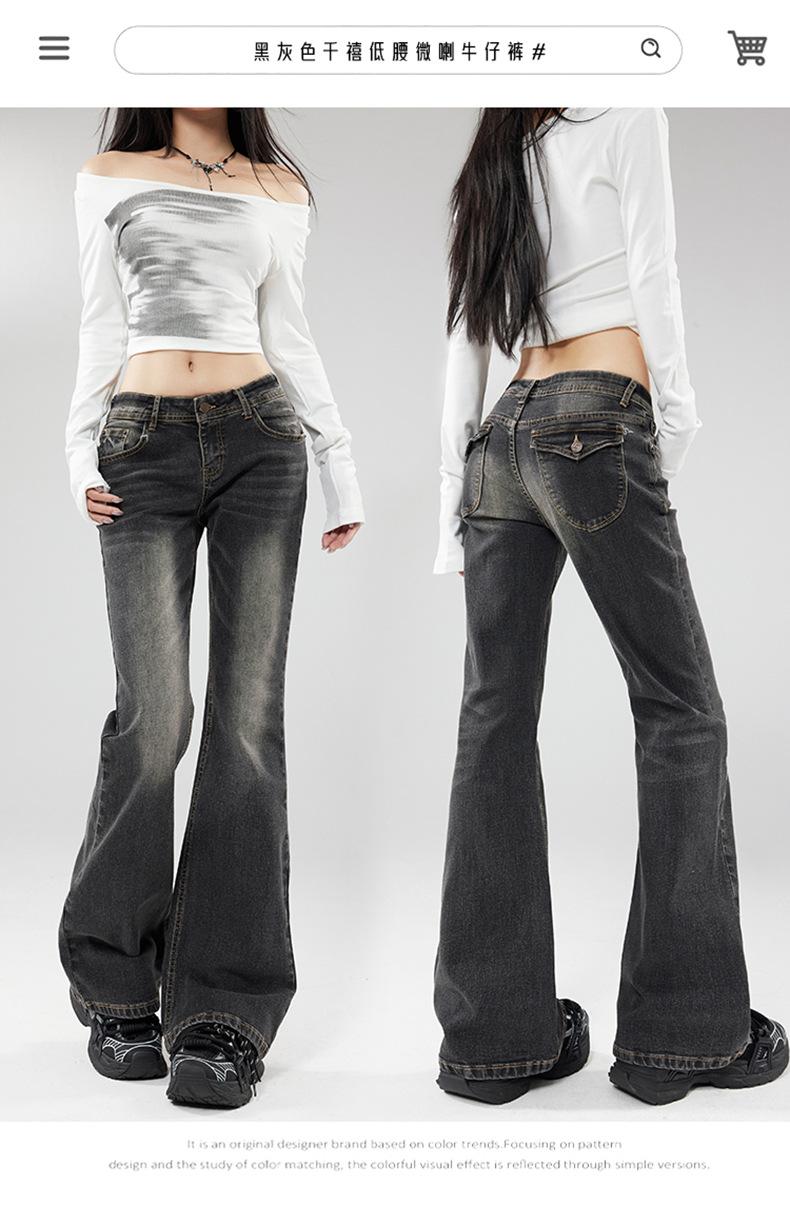 Ropa de mujer de seda naranja#jeans acampanados micro de talle bajo negro-gris para mujer, versátiles de otoño temprano, elásticos, lavados, acampanados, tipo herradura