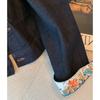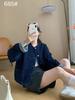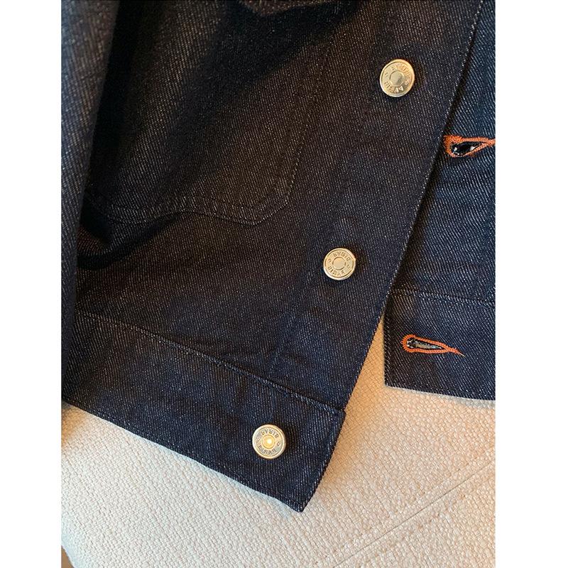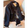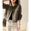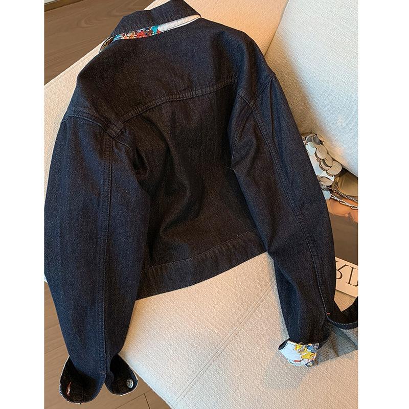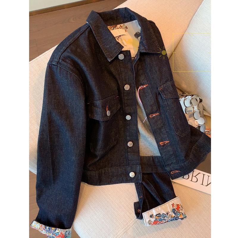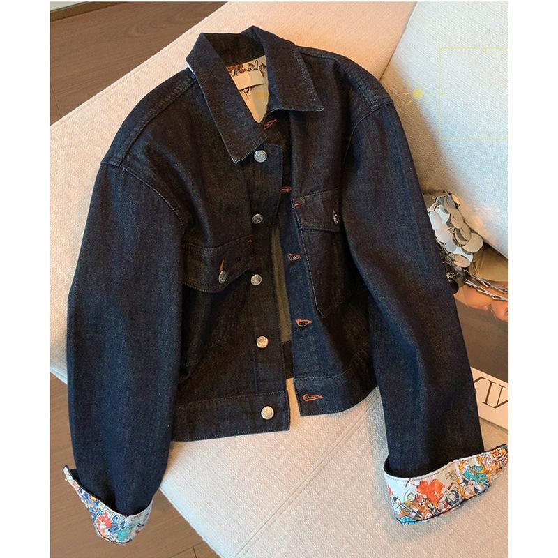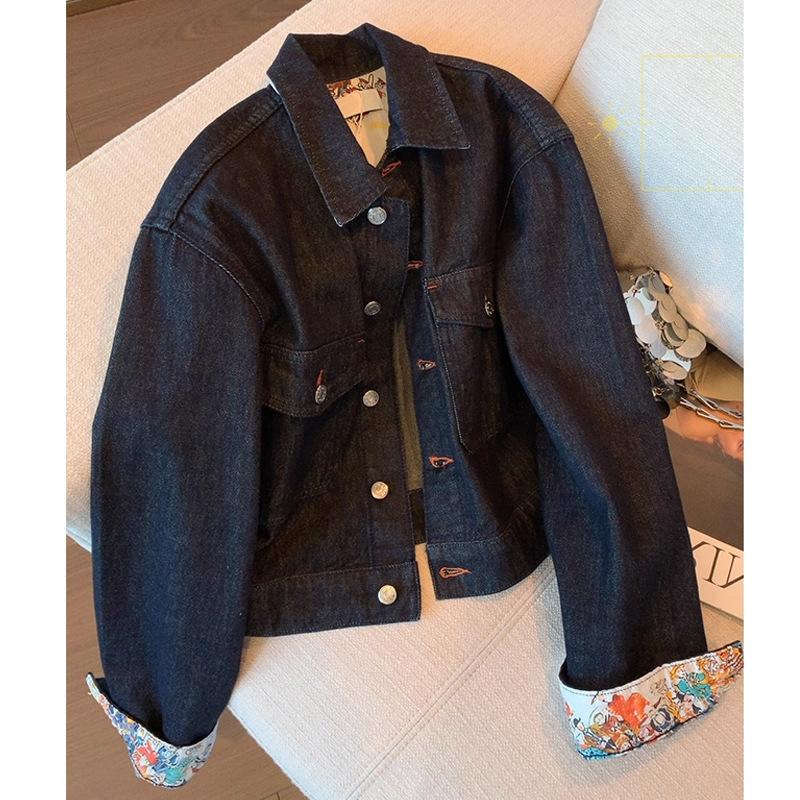 Chaqueta de mezclilla patchwork con estampado azul oscuro para mujer otoño nueva temperamento de alta gama nicho casual chaqueta corta top