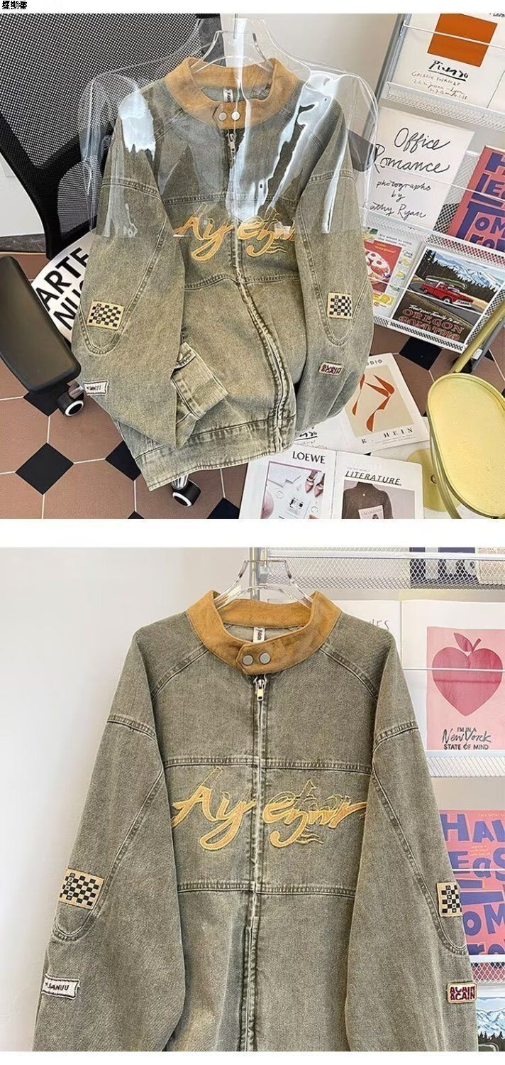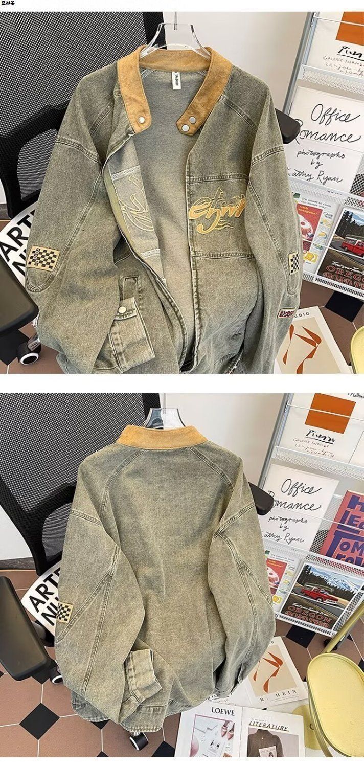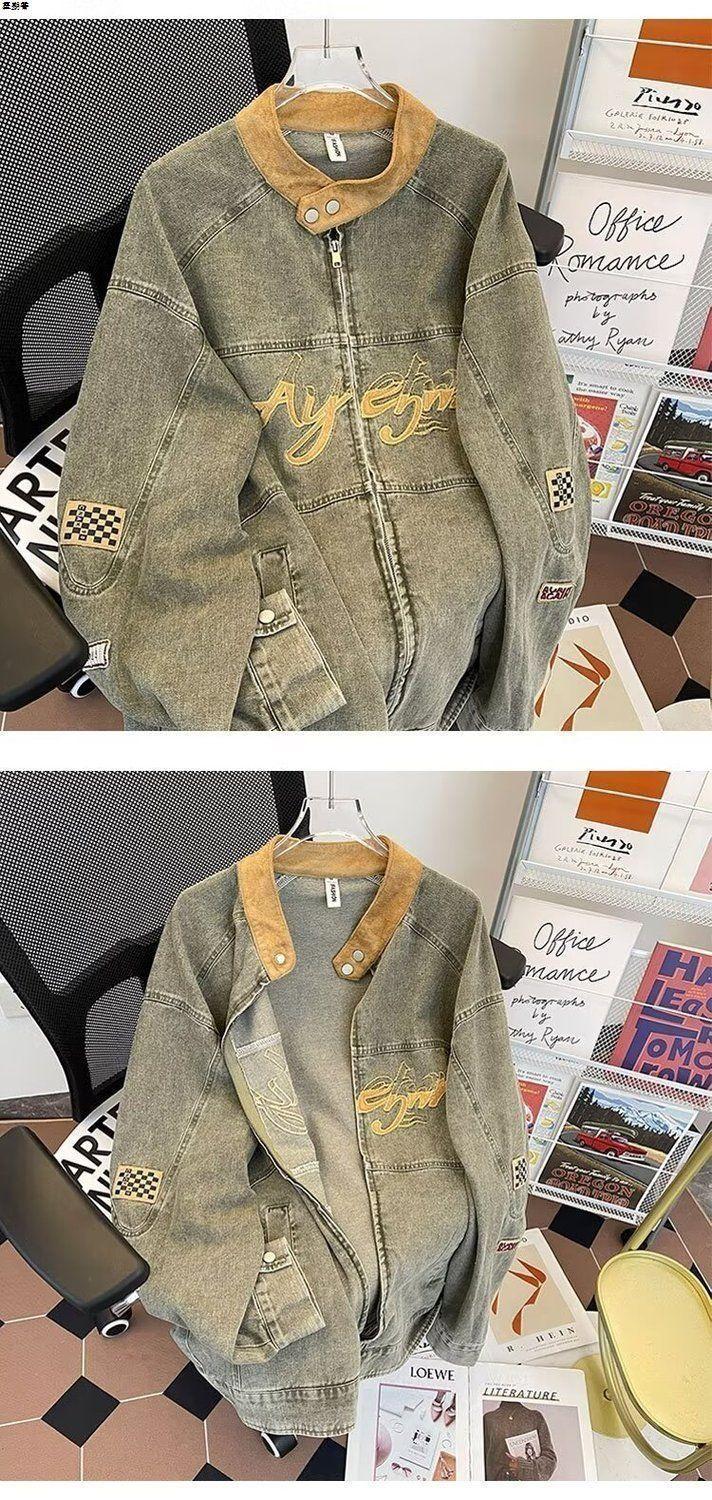 Chamarra Abrigo de Mezclilla Lavada Bordada Holgada Talla Grande Retro Americana de Cuello Mao para Mujer Primavera Otoño Versátil Top de Motocicleta