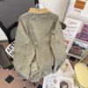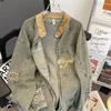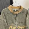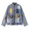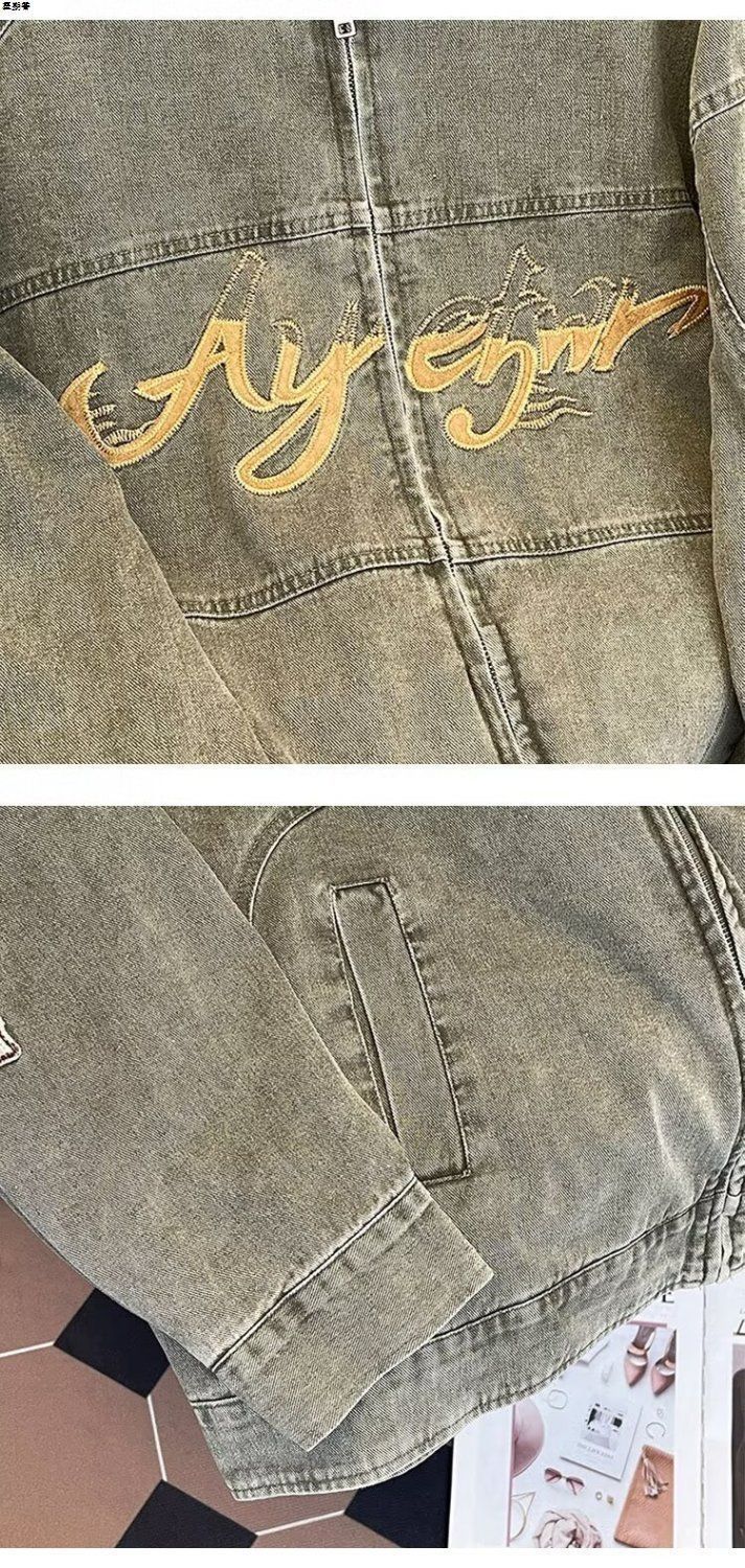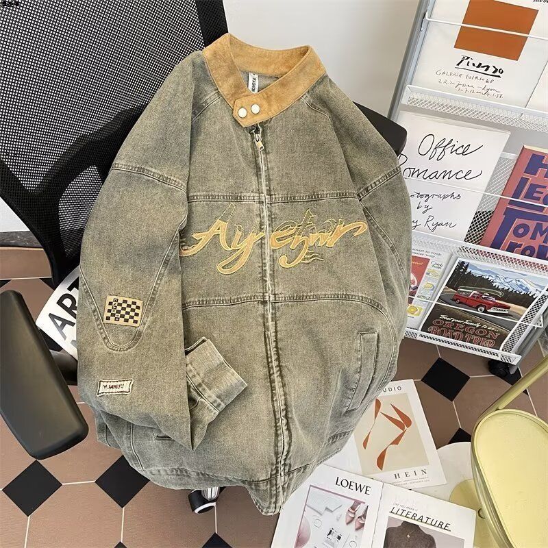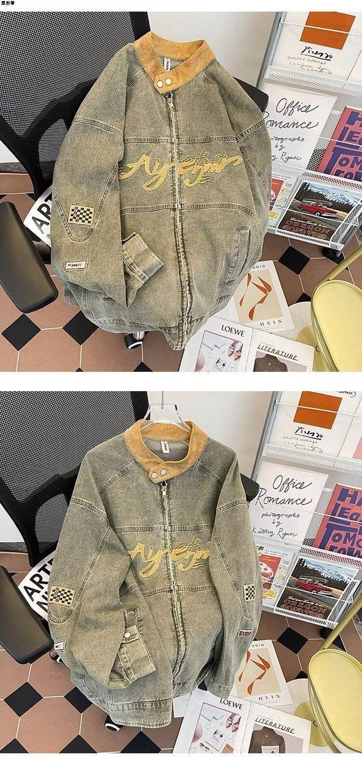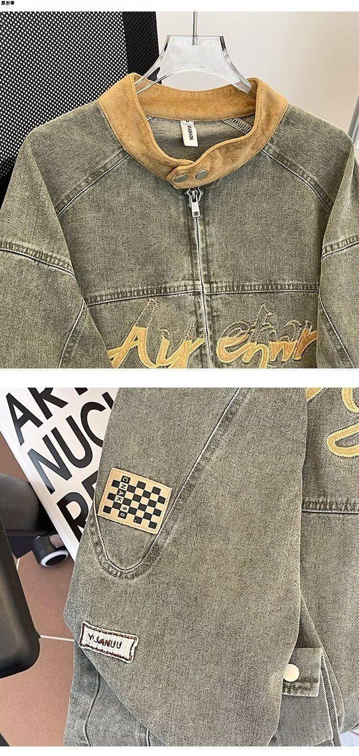 Chamarra Abrigo de Mezclilla Lavada Bordada Holgada Talla Grande Retro Americana de Cuello Mao para Mujer Primavera Otoño Versátil Top de Motocicleta