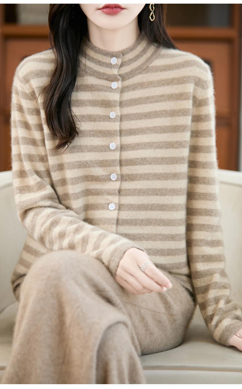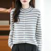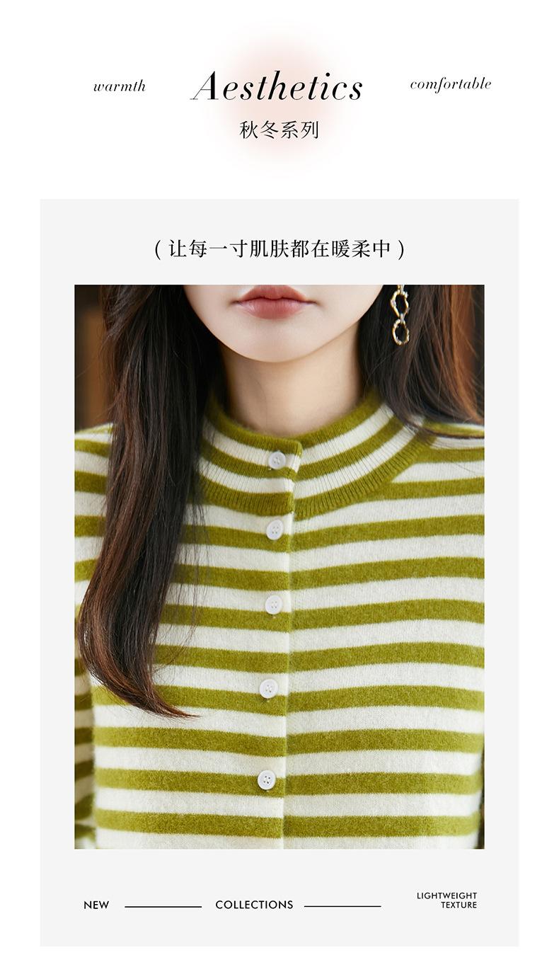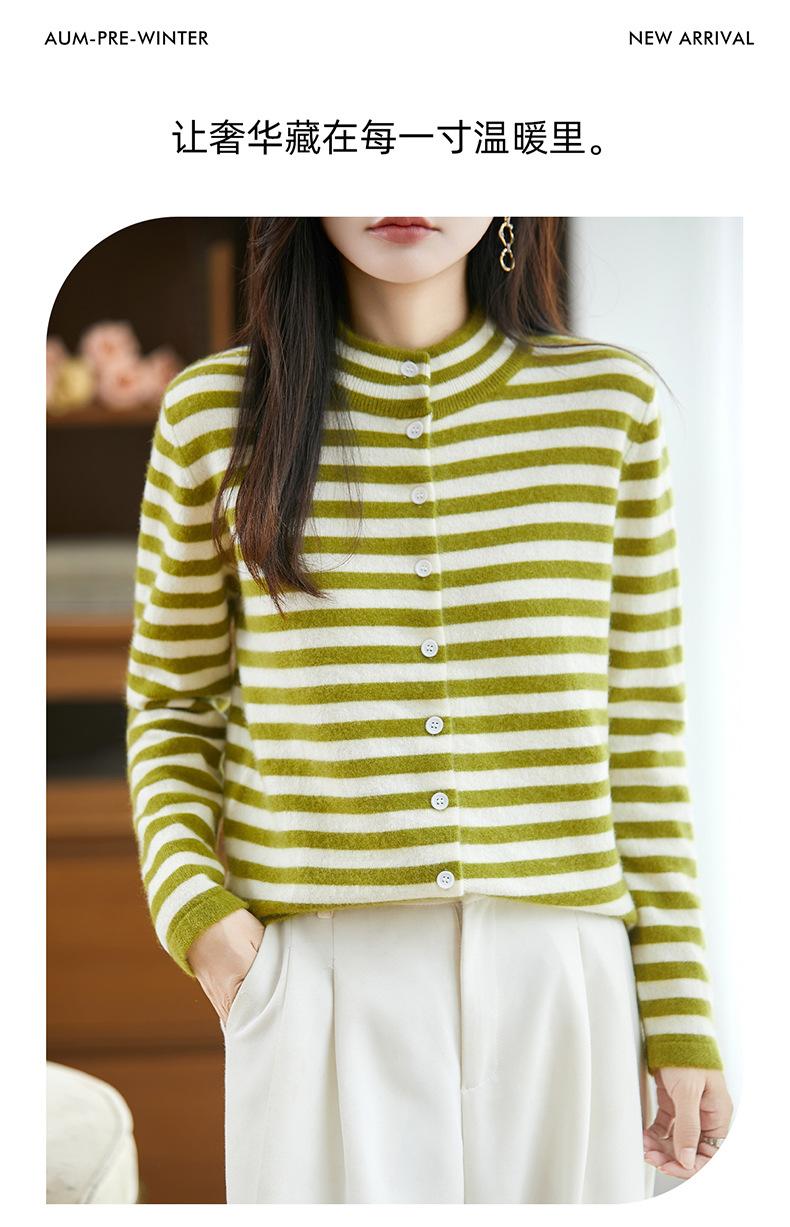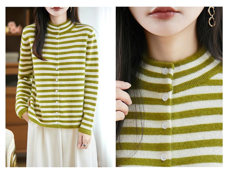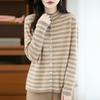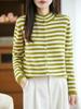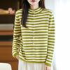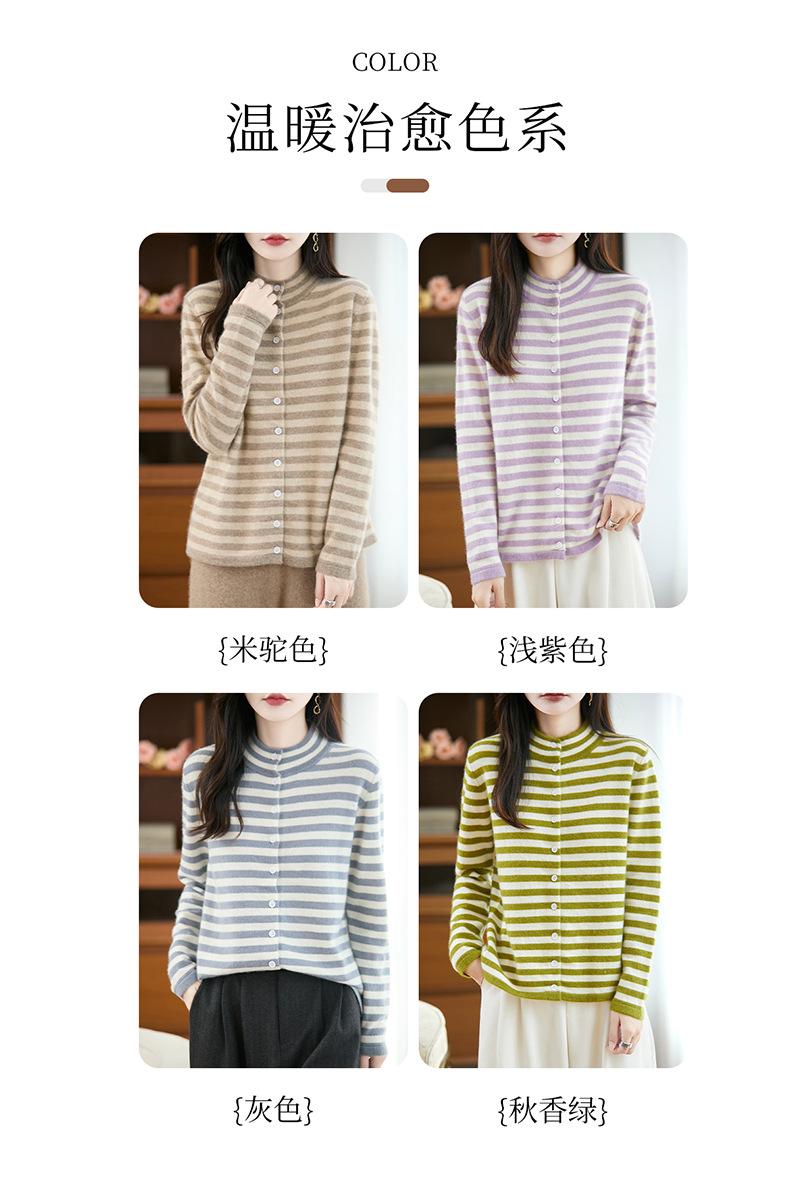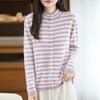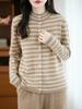 Cárdigan de Punto de Lana Pura de Cuello Medio Alto Nuevo Otoño/Invierno 2025 de Manga Larga para Mujer a Rayas con Bloques de Color Holgado Cálido
