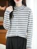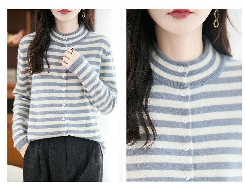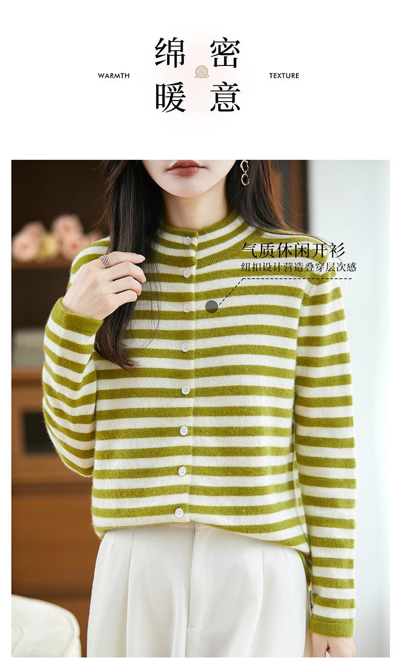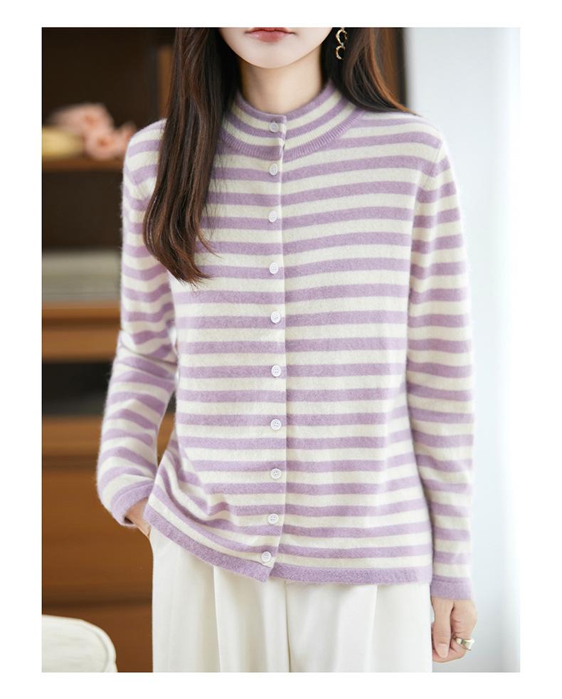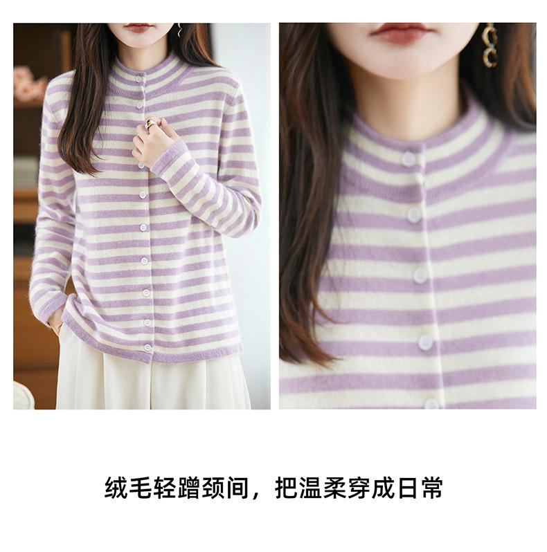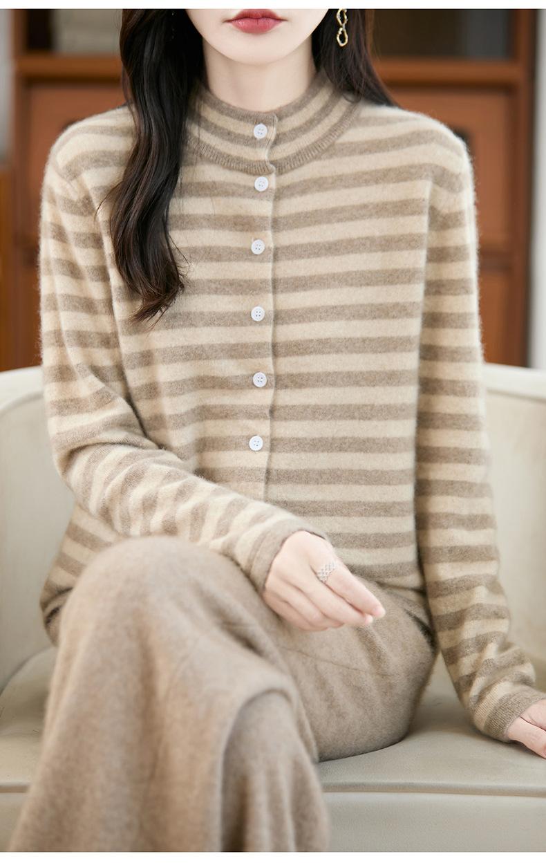 Cárdigan de Punto de Lana Pura de Cuello Medio Alto Nuevo Otoño/Invierno 2025 de Manga Larga para Mujer a Rayas con Bloques de Color Holgado Cálido