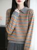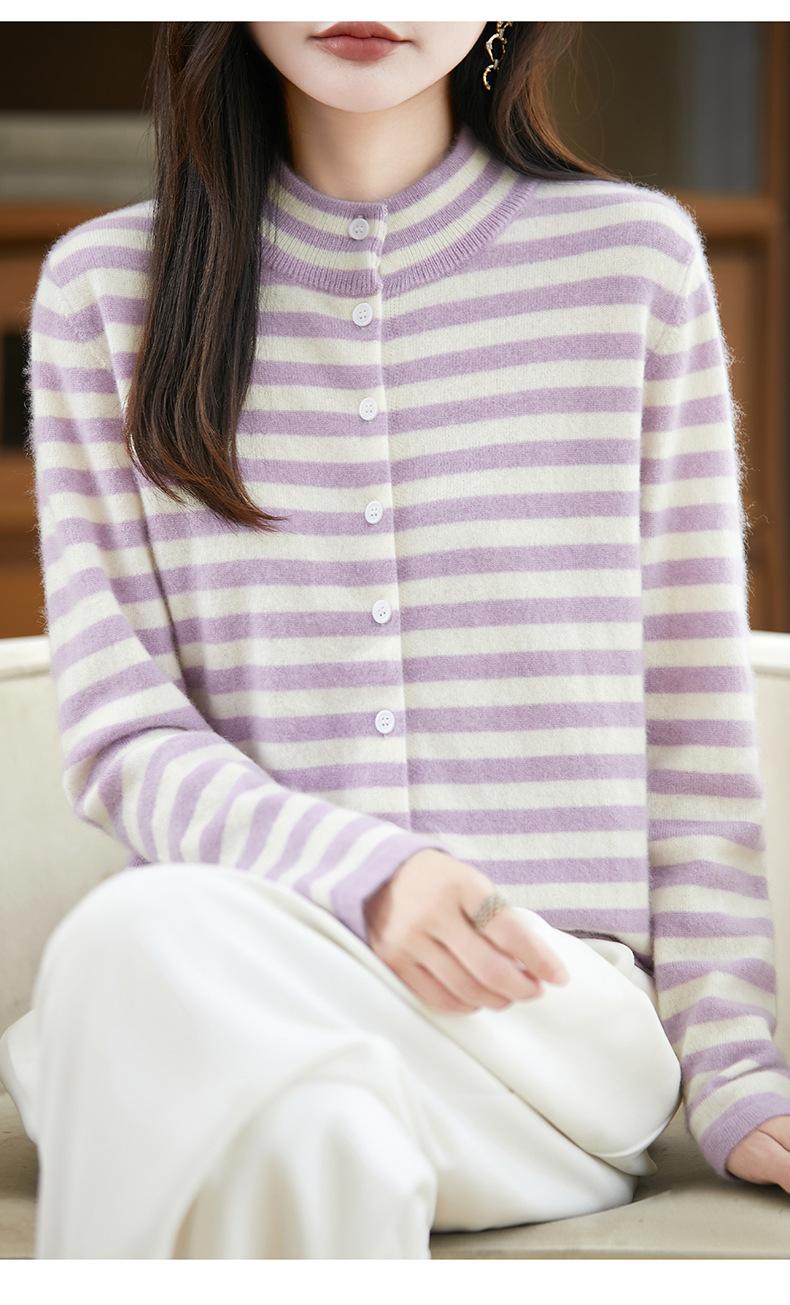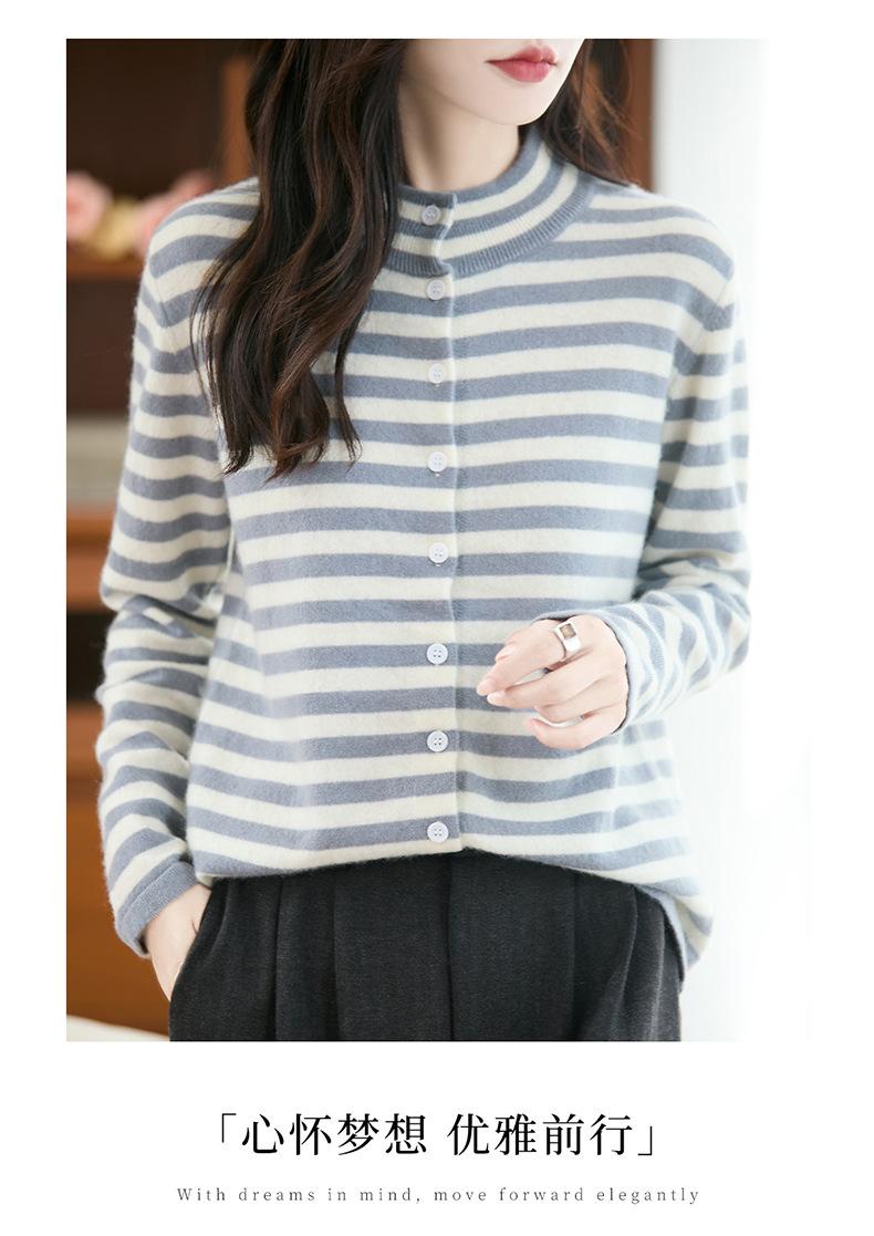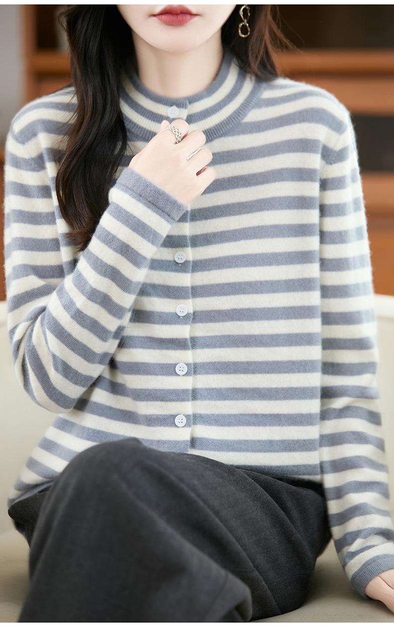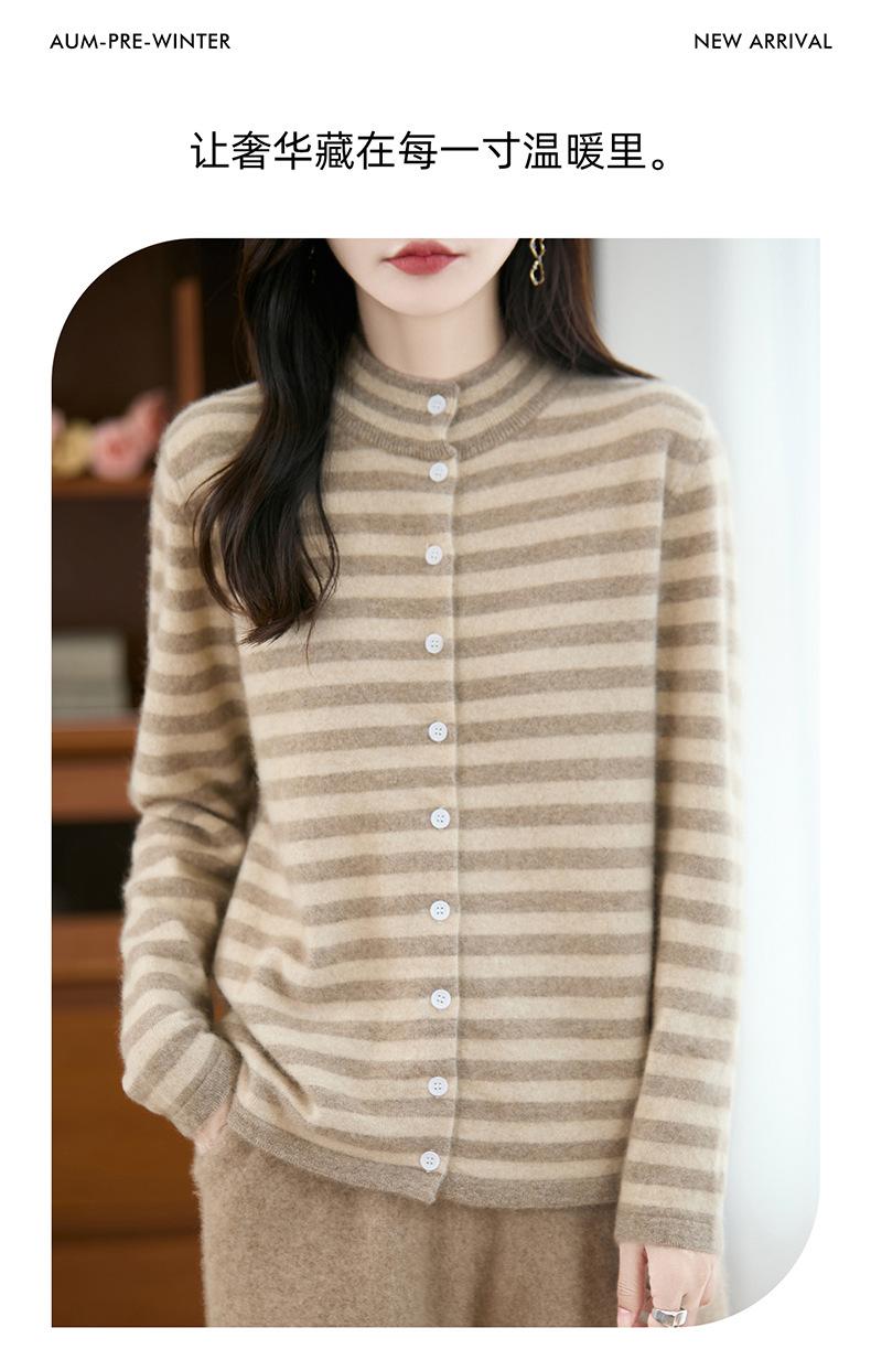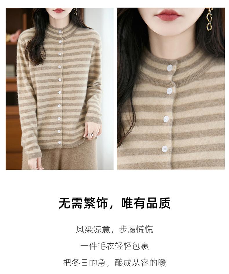 Cárdigan de Punto de Lana Pura de Cuello Medio Alto Nuevo Otoño/Invierno 2025 de Manga Larga para Mujer a Rayas con Bloques de Color Holgado Cálido