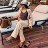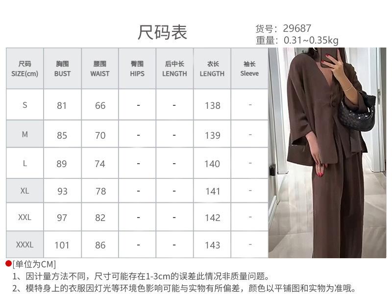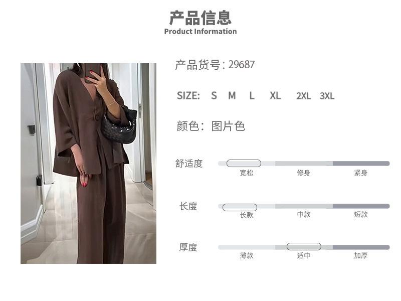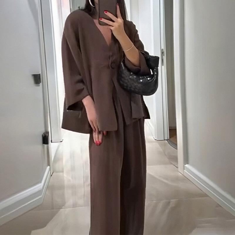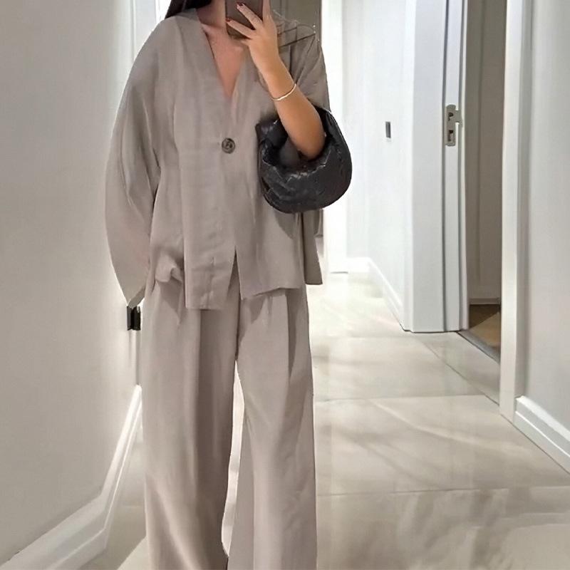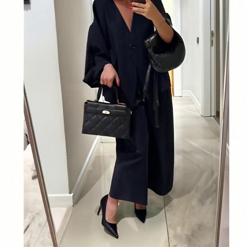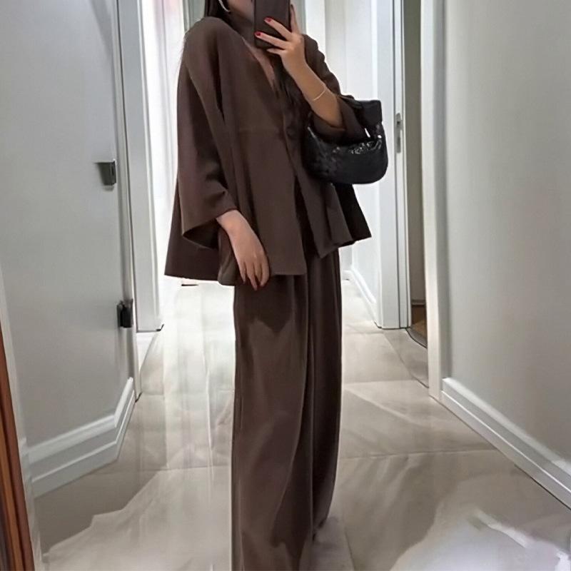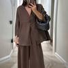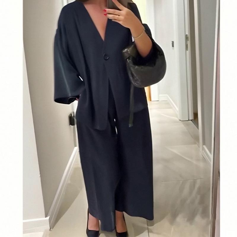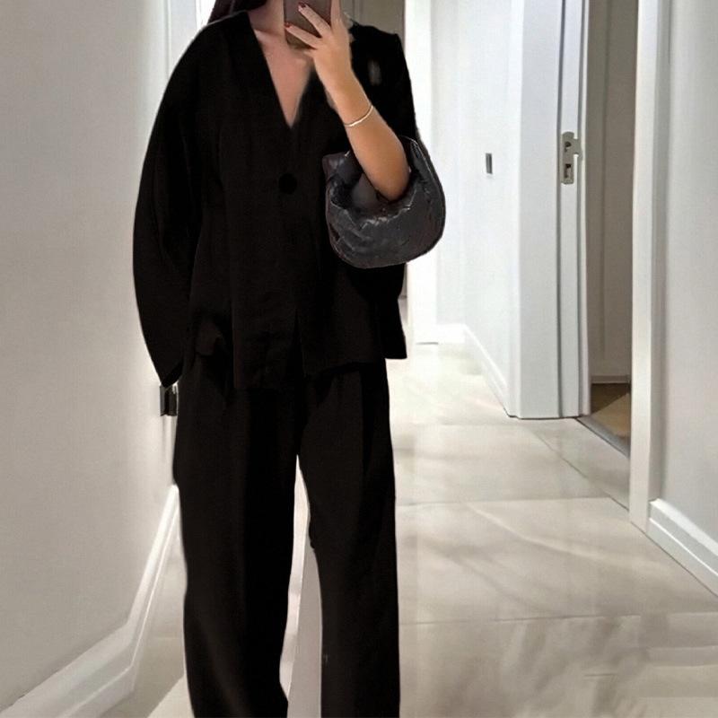 2025 Otoño Nuevo Transfronterizo Moda Europea y Americana Casual Color Sólido Cuello en V Manga Larga Botón Pantalones de Pierna Ancha Set