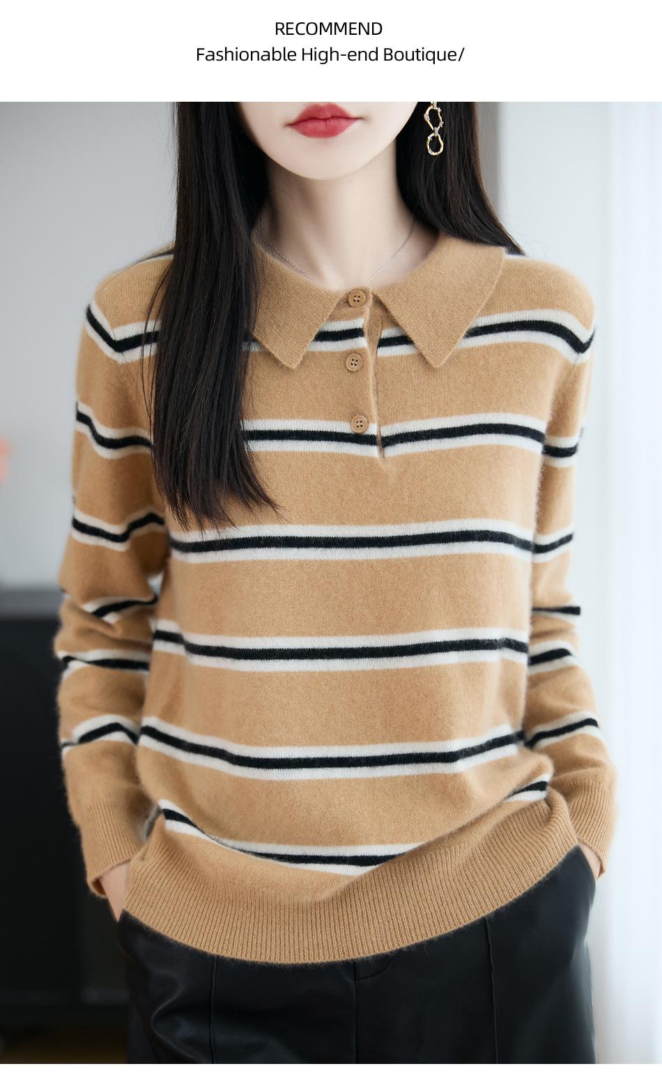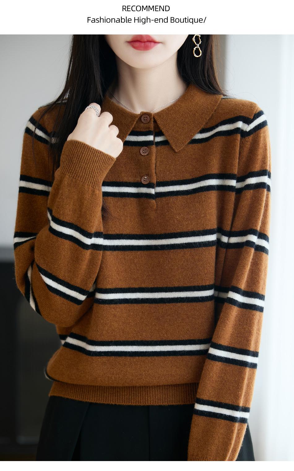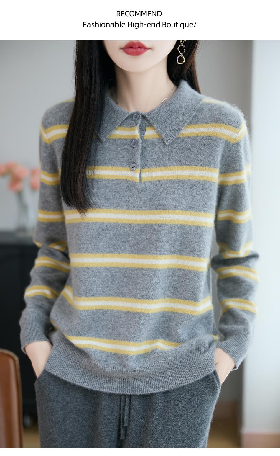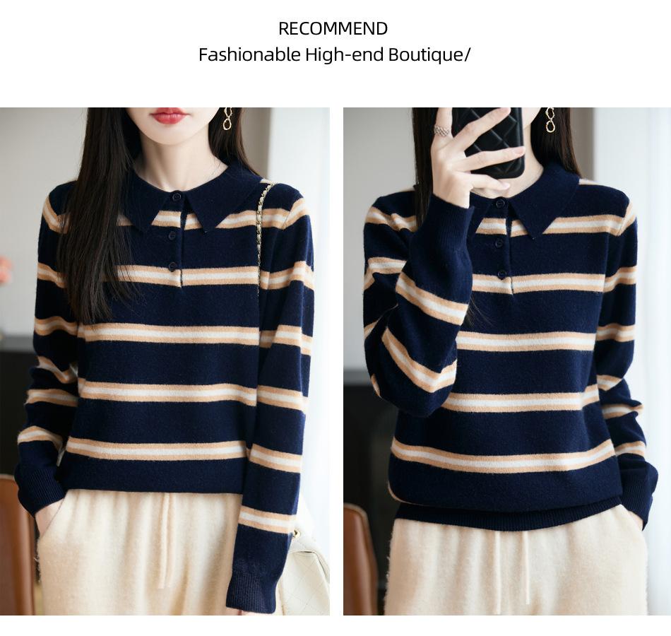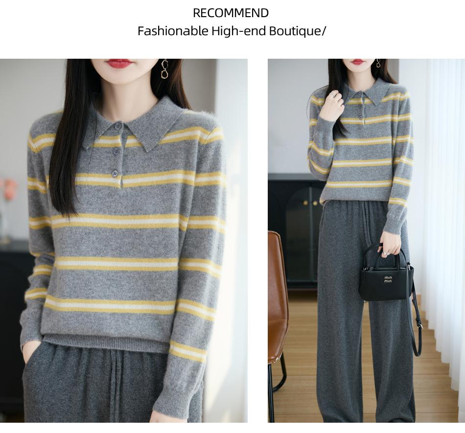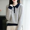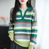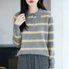 Otoño/Invierno 2025 Nueva Prendas de Punto de Lana Pura Jersey de Mujer Cuello POLO Bloque de Color Raya Suelto Manga Larga Suéter Básico