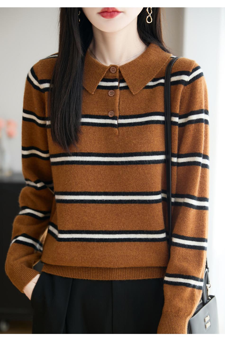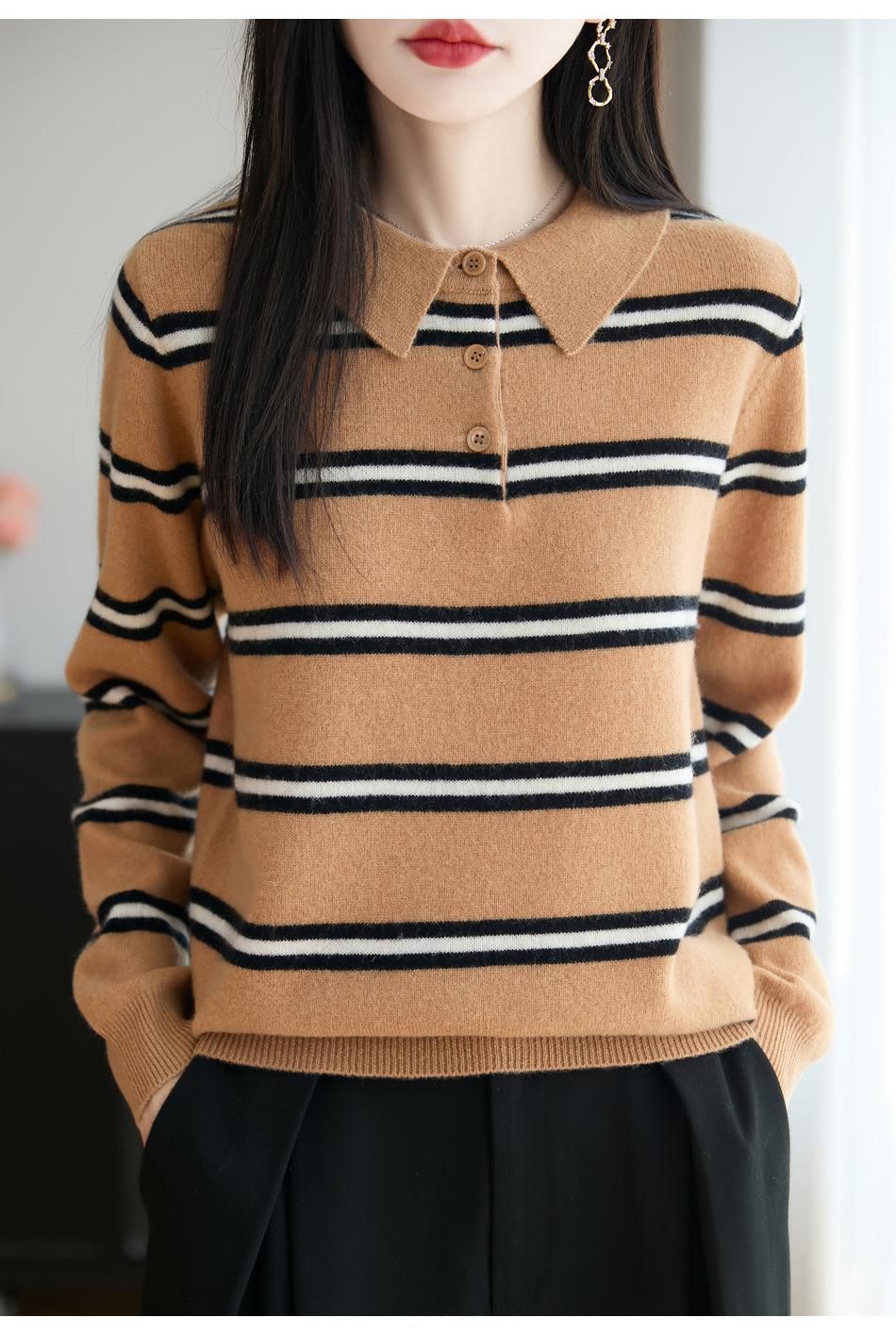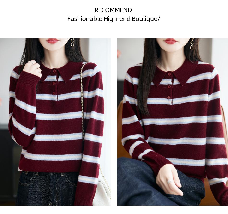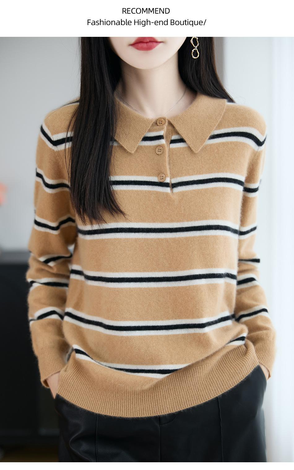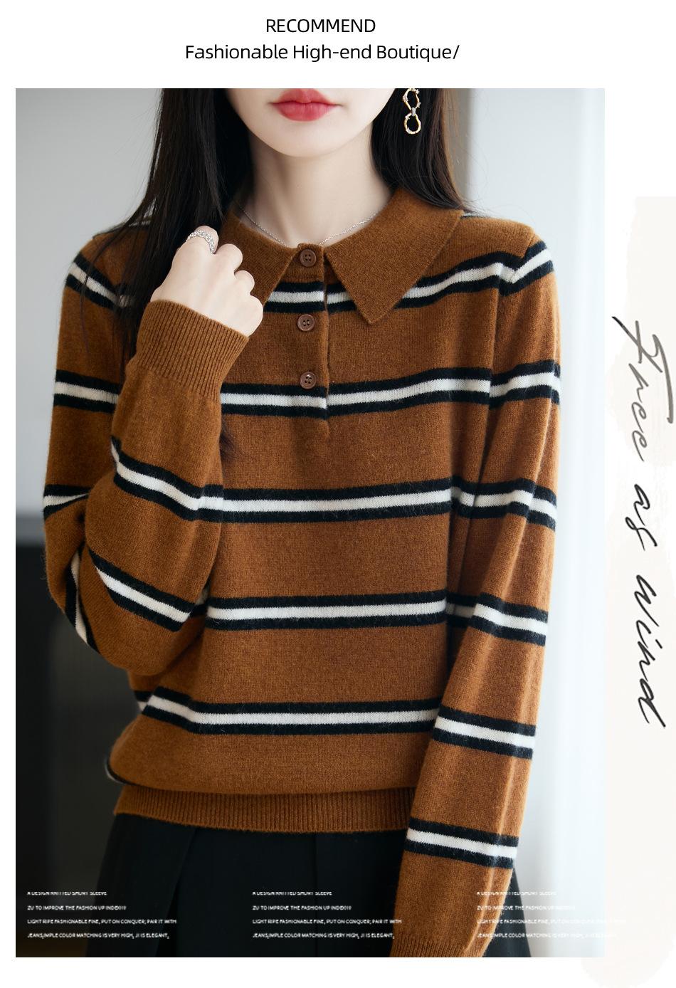 Otoño/Invierno 2025 Nueva Prendas de Punto de Lana Pura Jersey de Mujer Cuello POLO Bloque de Color Raya Suelto Manga Larga Suéter Básico