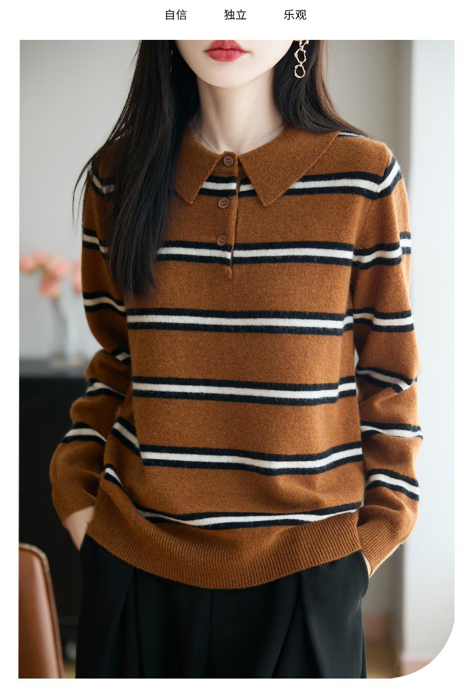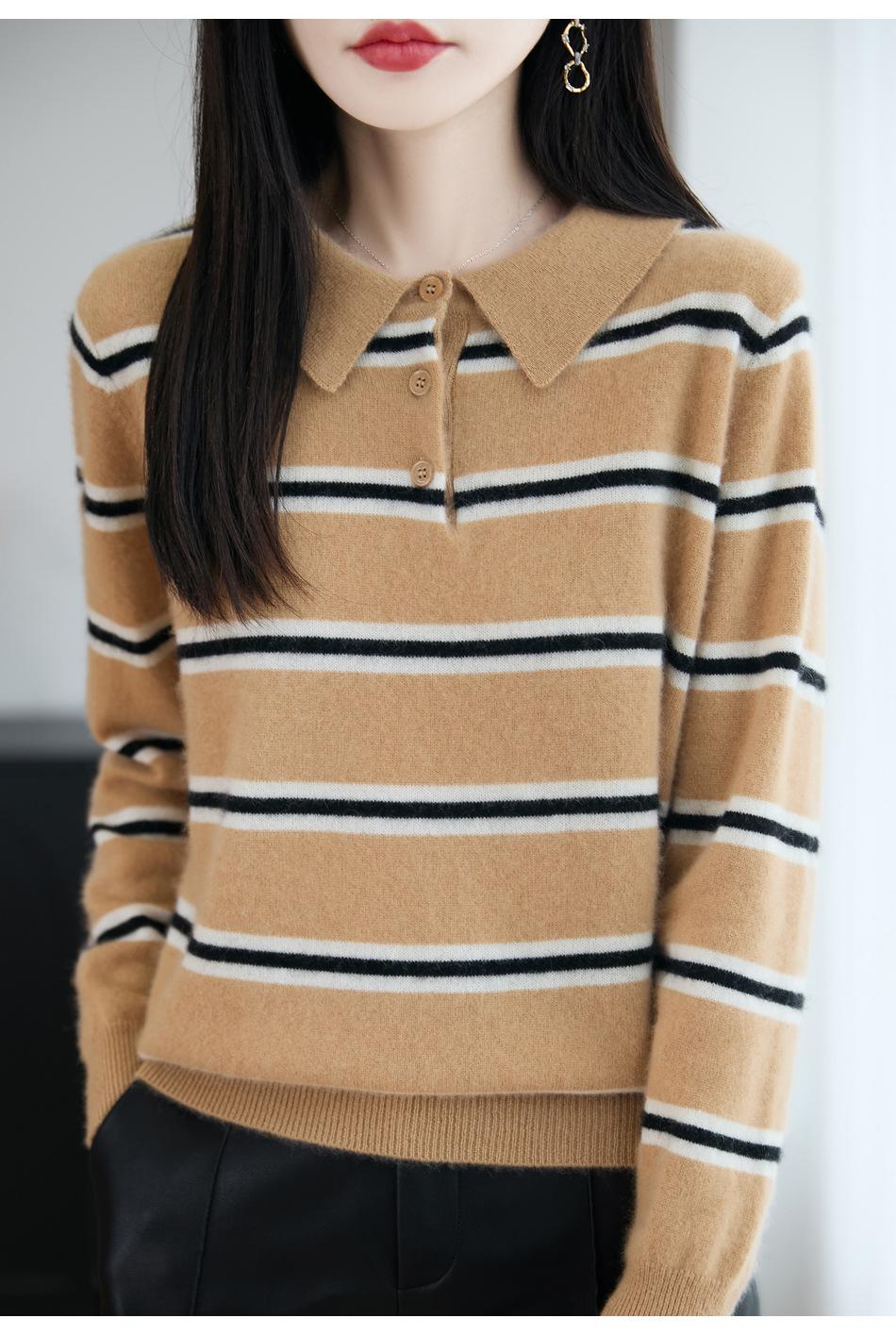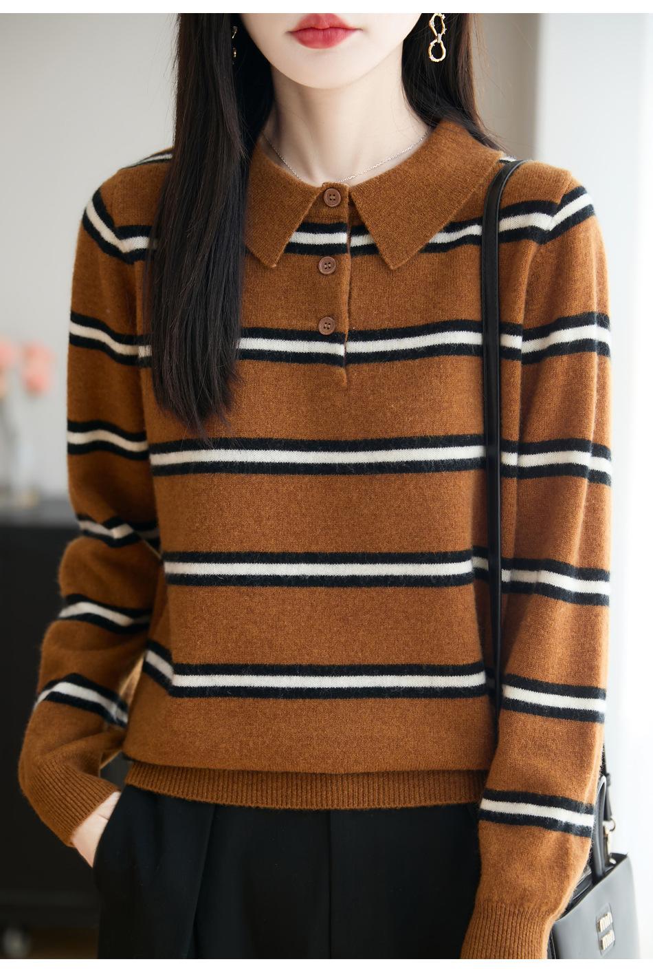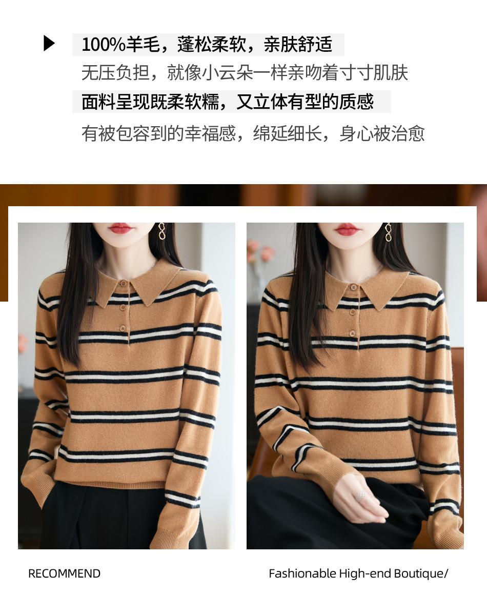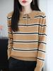 Otoño/Invierno 2025 Nueva Prendas de Punto de Lana Pura Jersey de Mujer Cuello POLO Bloque de Color Raya Suelto Manga Larga Suéter Básico
