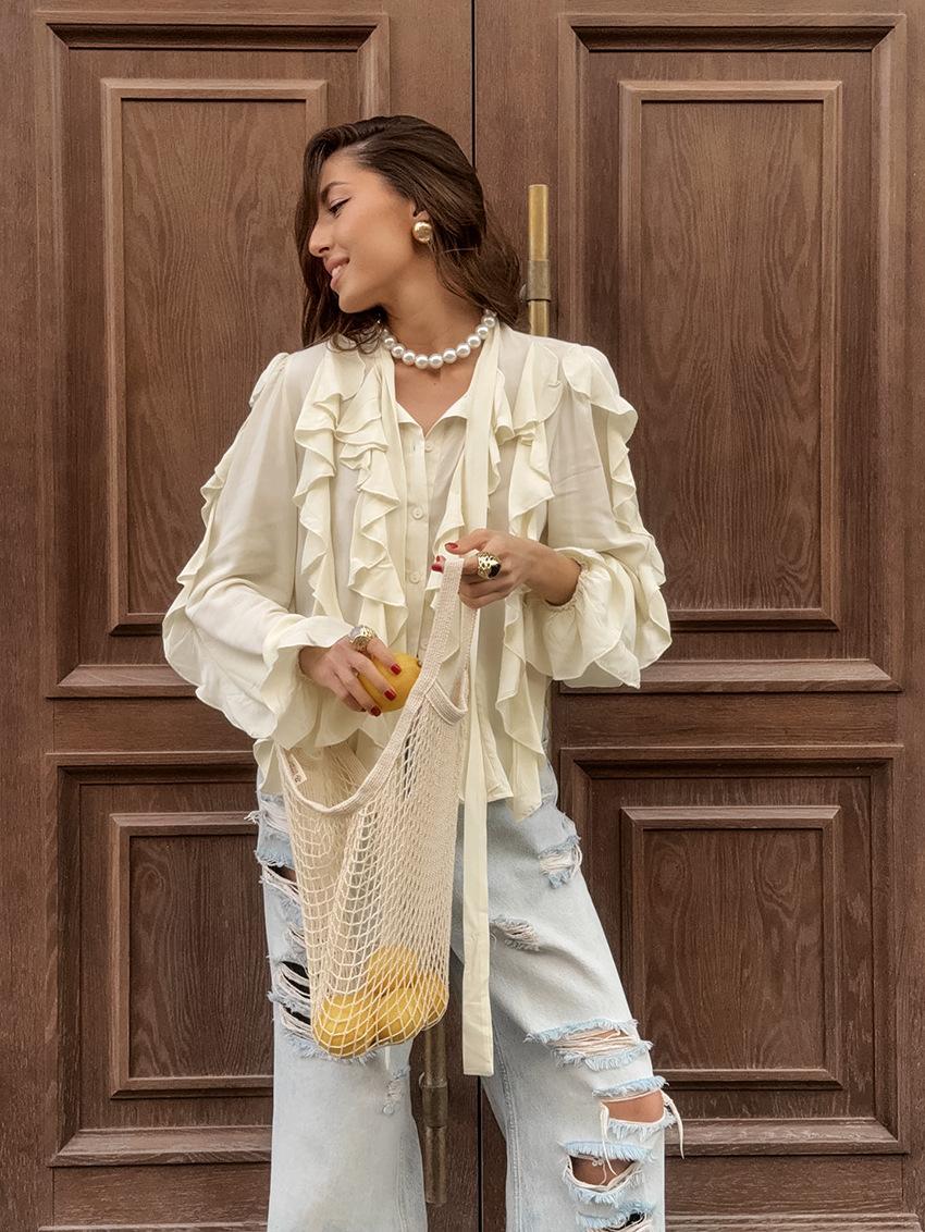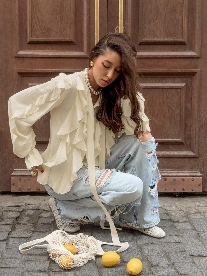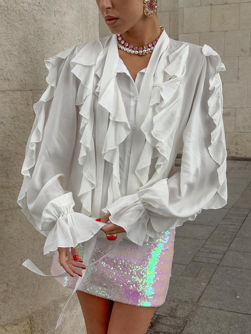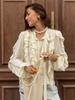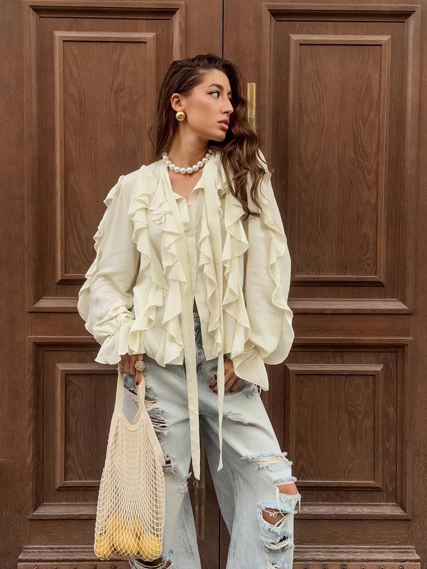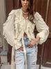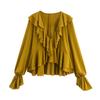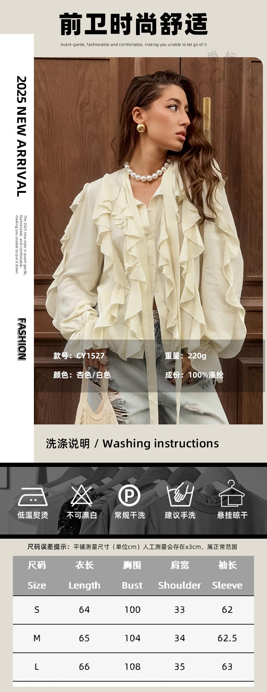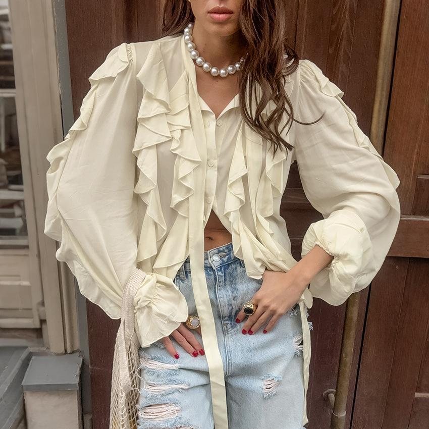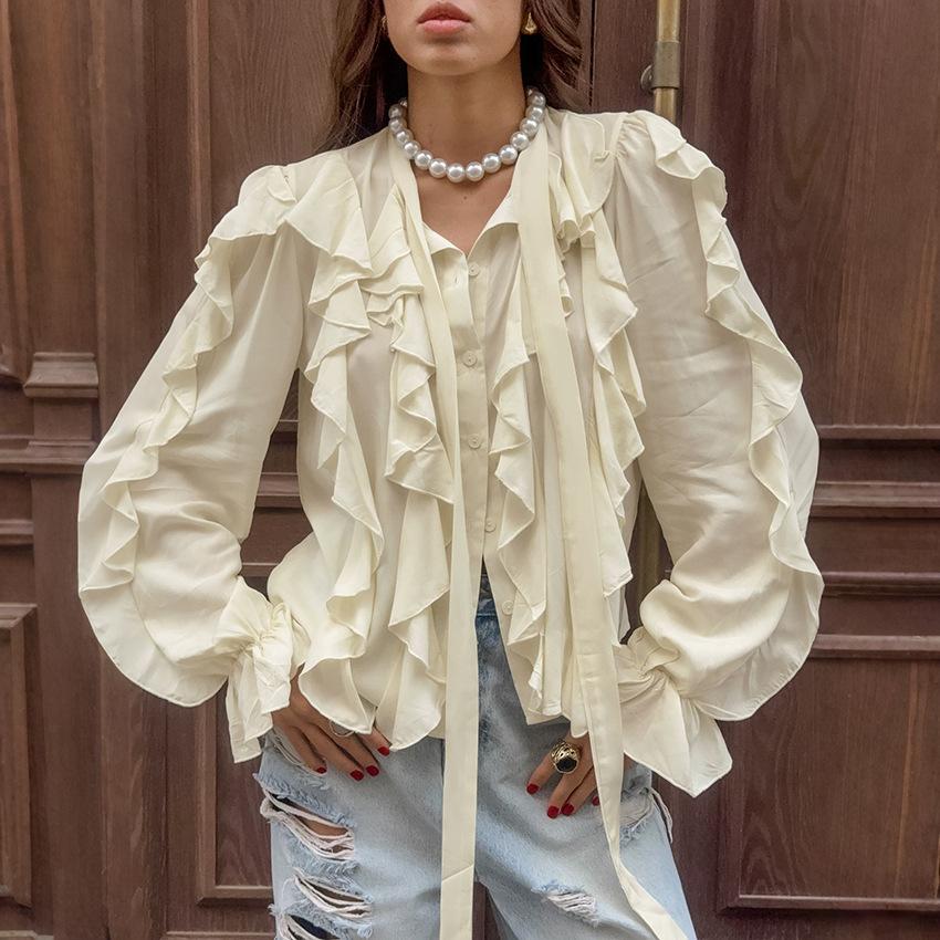 Camisa de volantes en capas albaricoque de industria pesada transfronteriza europea y americana para mujer otoño 2025 temperamento cuello en V manga larga top de encaje