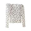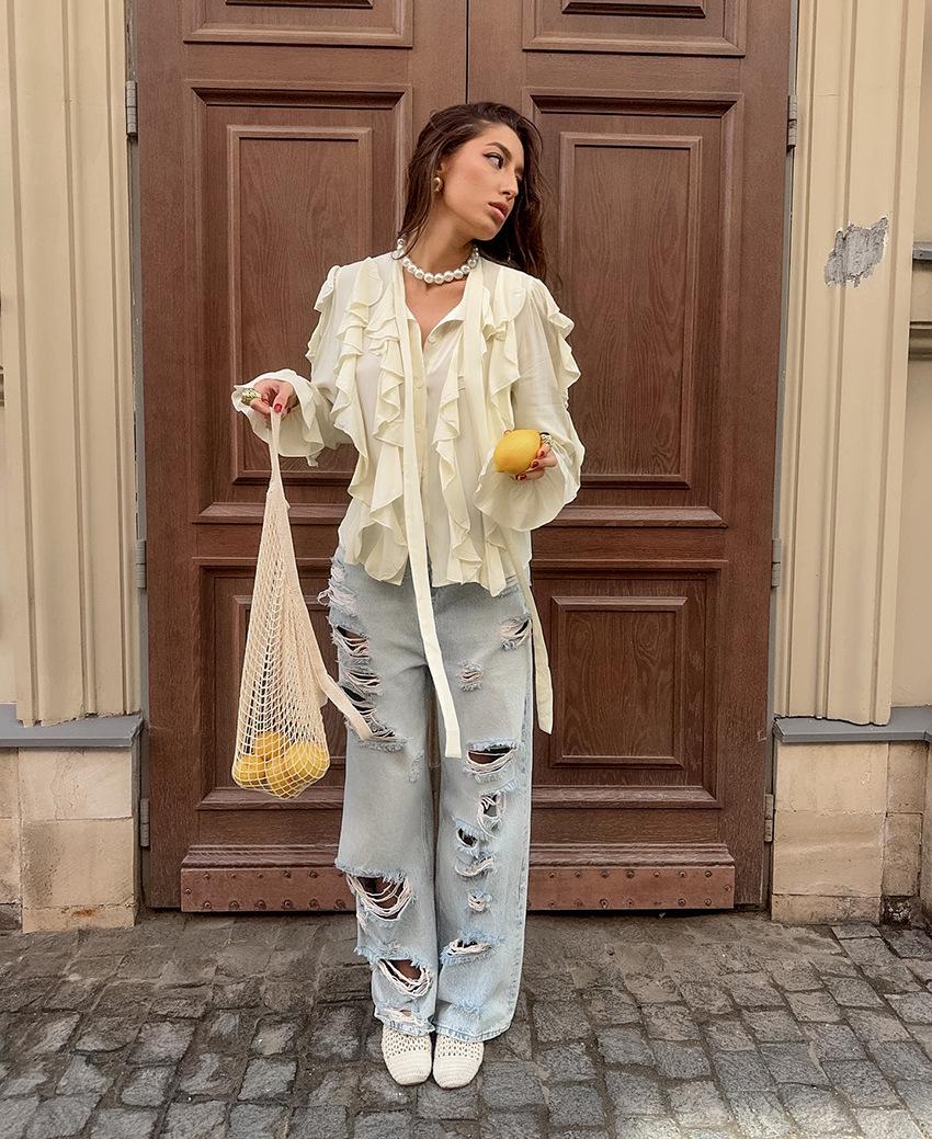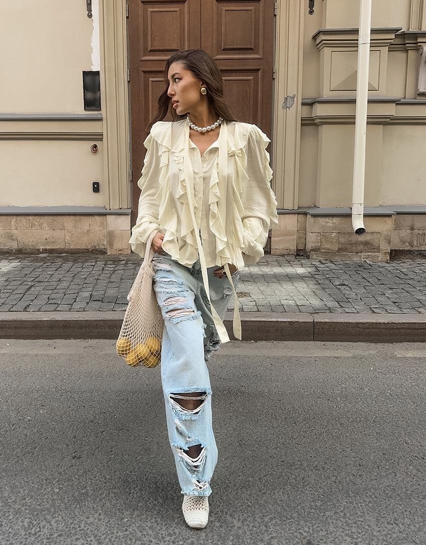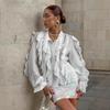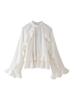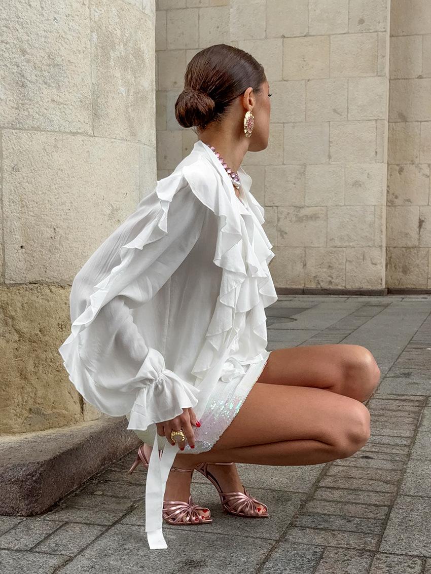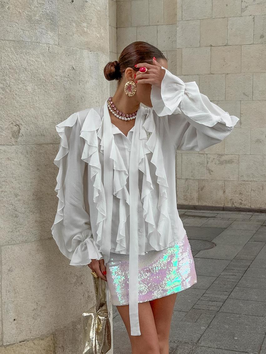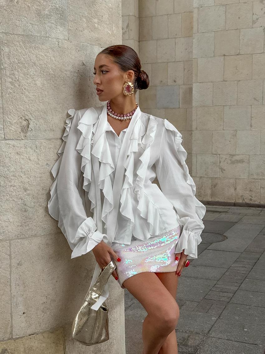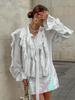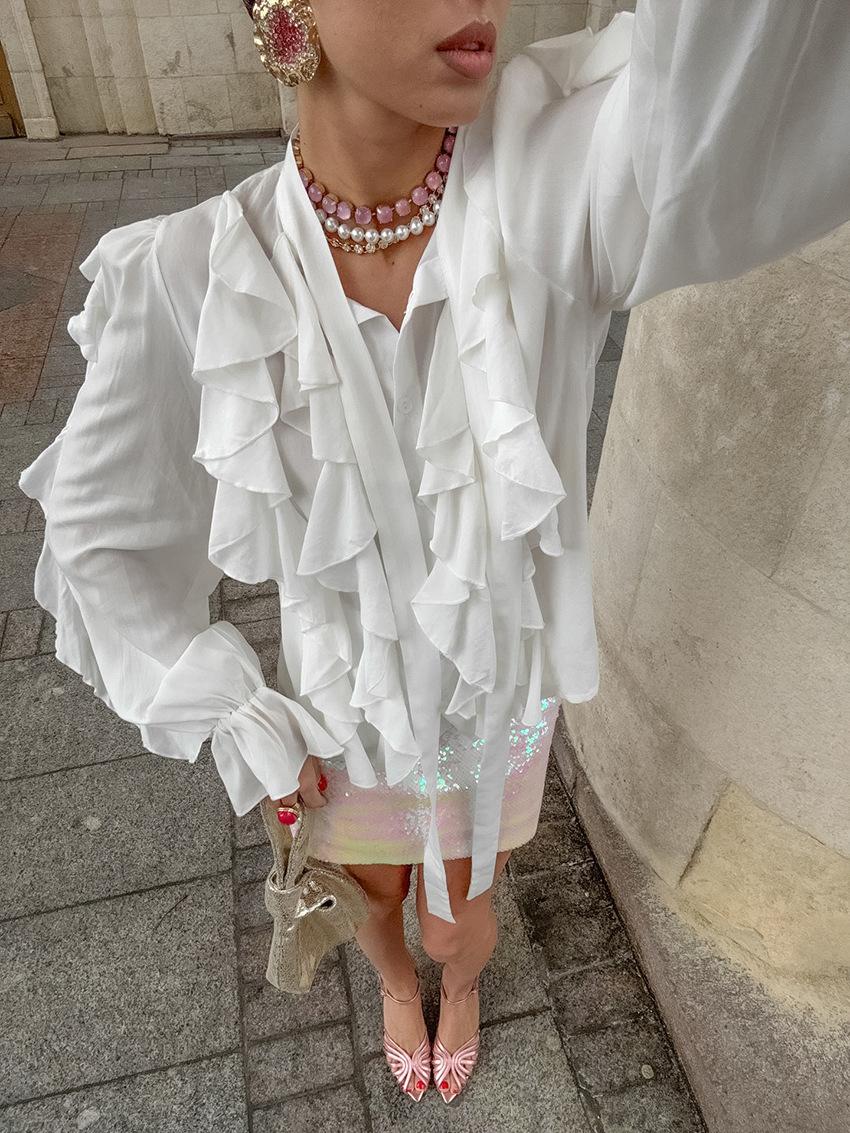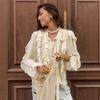 Camisa de volantes en capas albaricoque de industria pesada transfronteriza europea y americana para mujer otoño 2025 temperamento cuello en V manga larga top de encaje