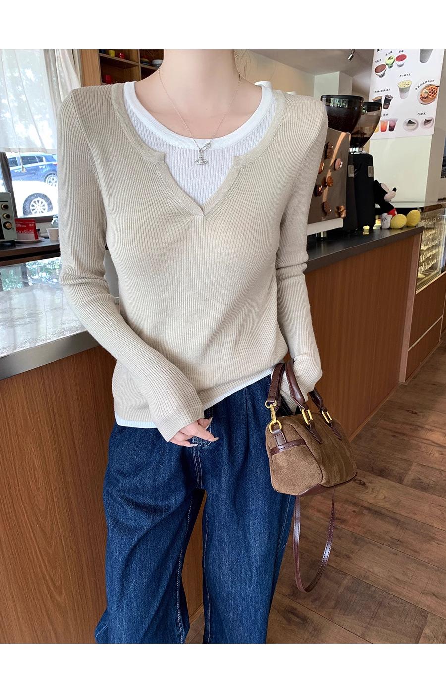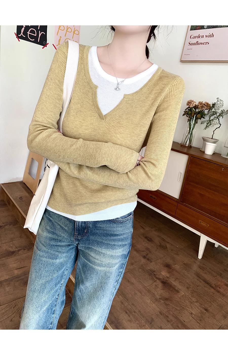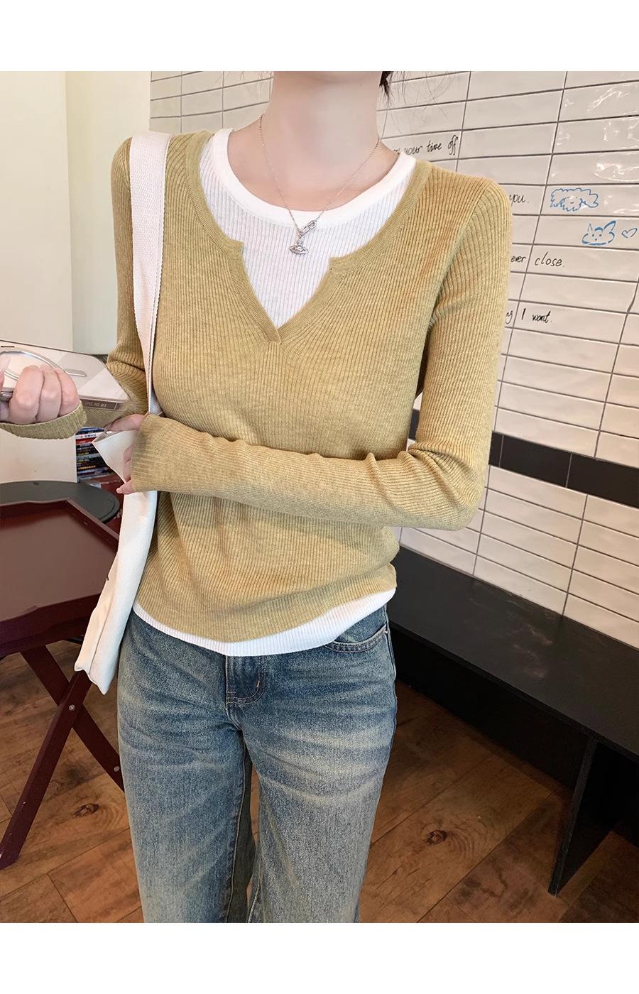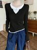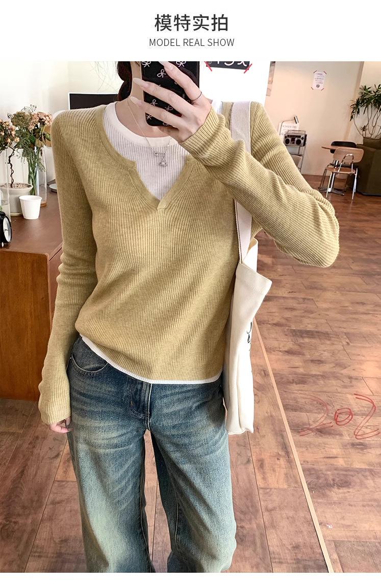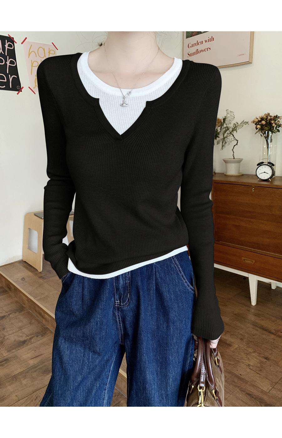 Camiseta Básica de Punto de Manga Larga con Cuello en V de Dos Piezas Falsas en Color Contraste Estilo Coreano para Mujer Otoño 2024 Suéter Sencillo Estilo Lazy