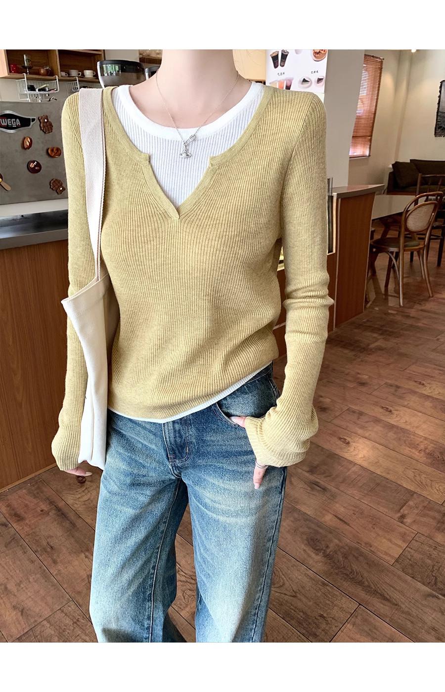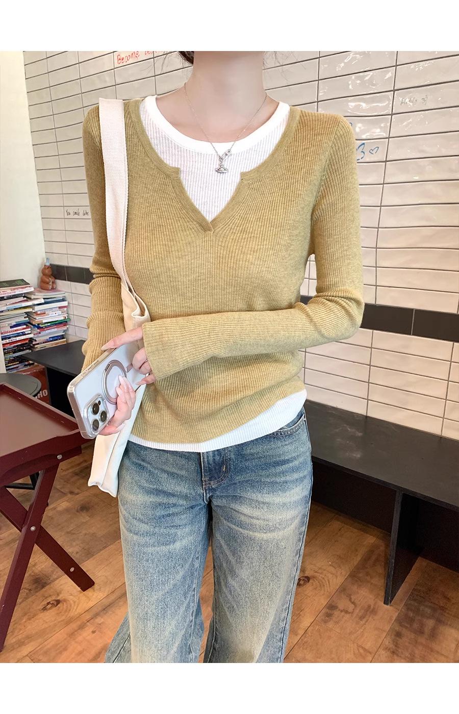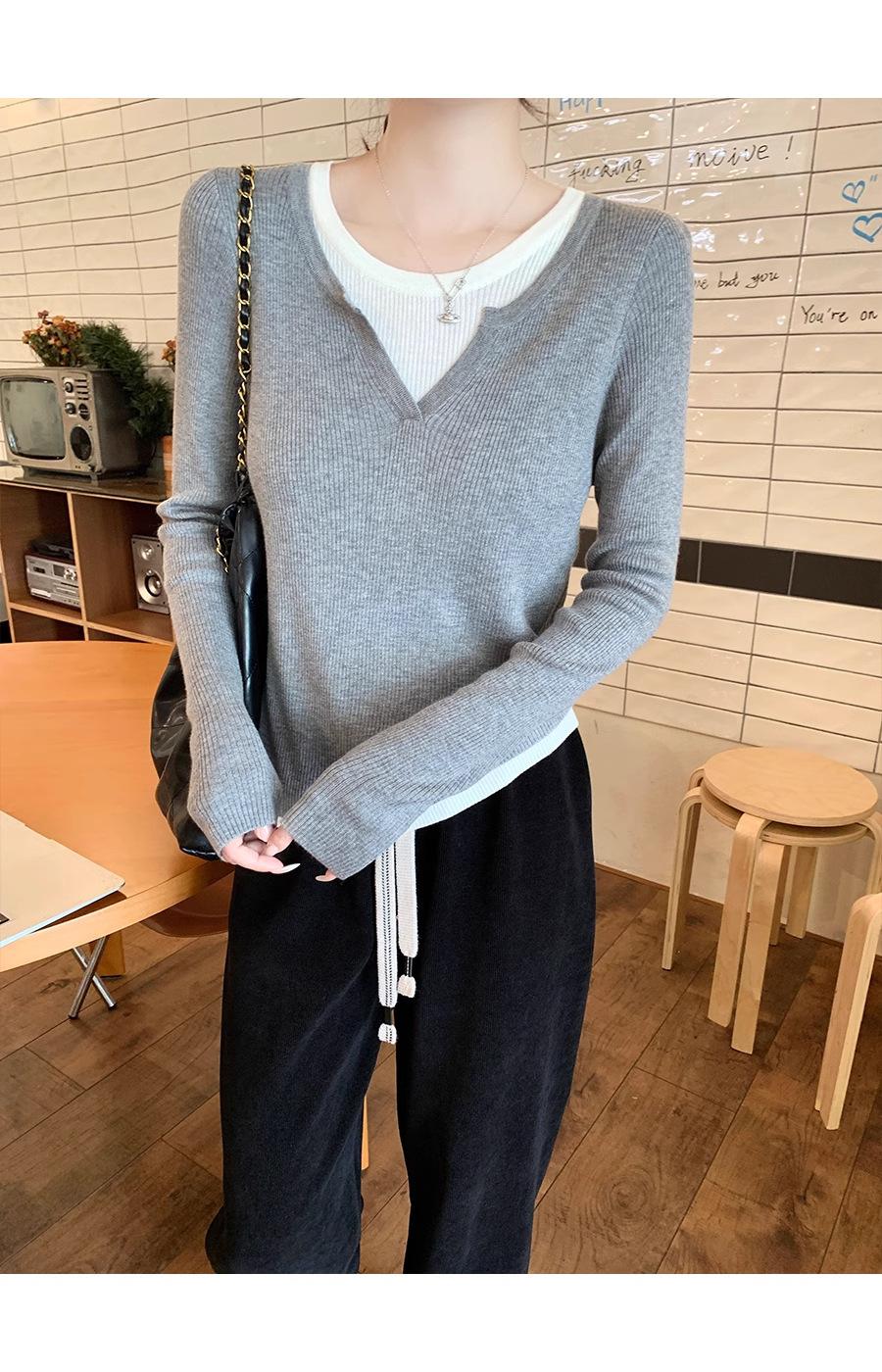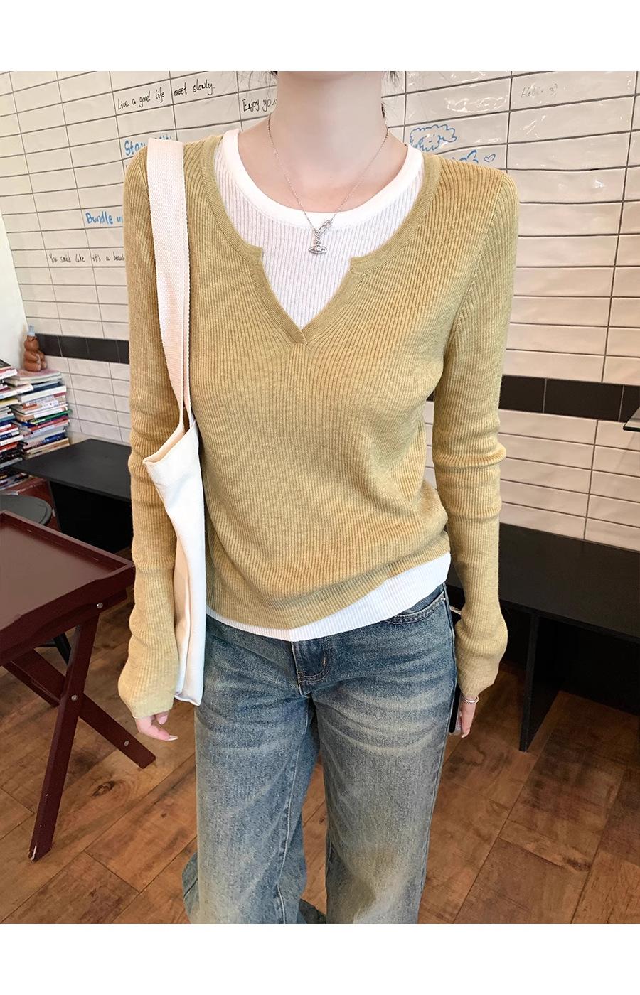 Camiseta Básica de Punto de Manga Larga con Cuello en V de Dos Piezas Falsas en Color Contraste Estilo Coreano para Mujer Otoño 2024 Suéter Sencillo Estilo Lazy