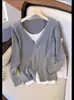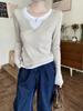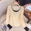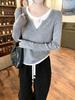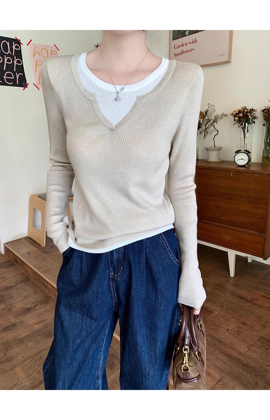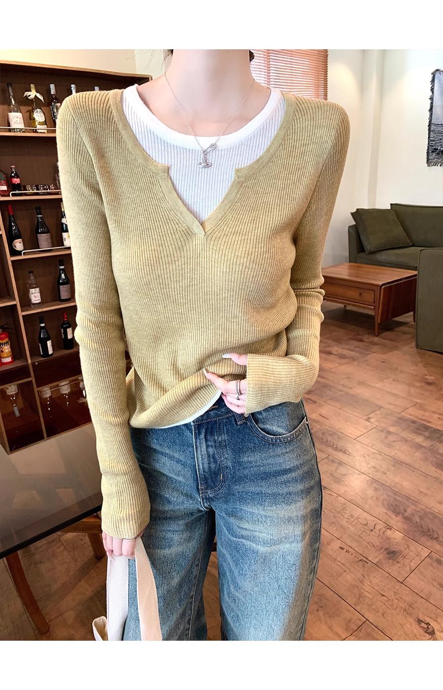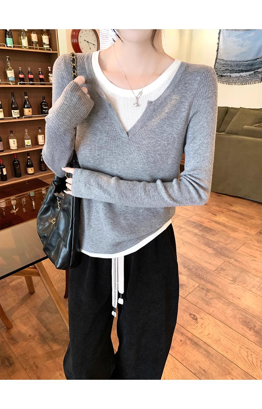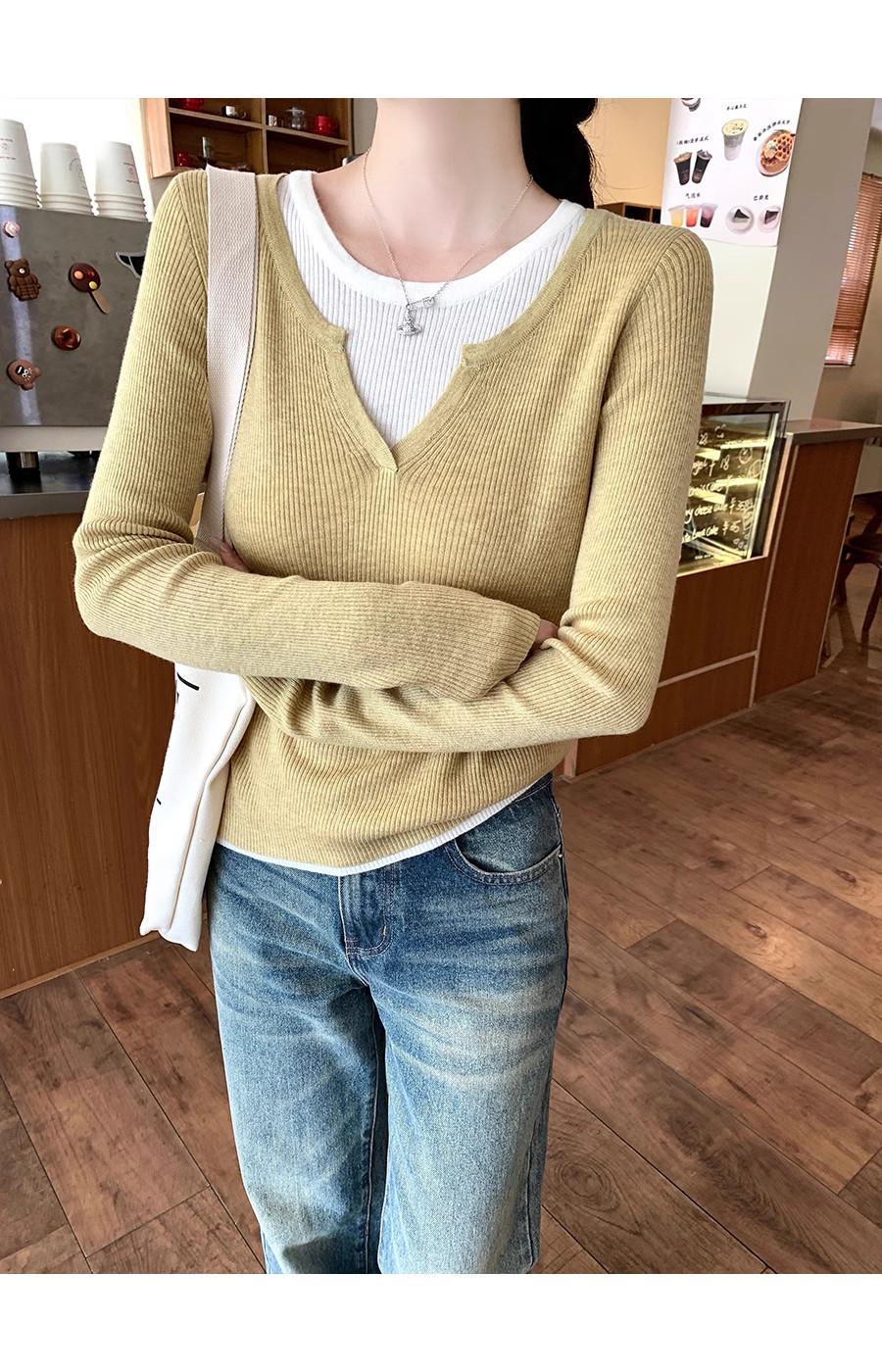 Camiseta Básica de Punto de Manga Larga con Cuello en V de Dos Piezas Falsas en Color Contraste Estilo Coreano para Mujer Otoño 2024 Suéter Sencillo Estilo Lazy