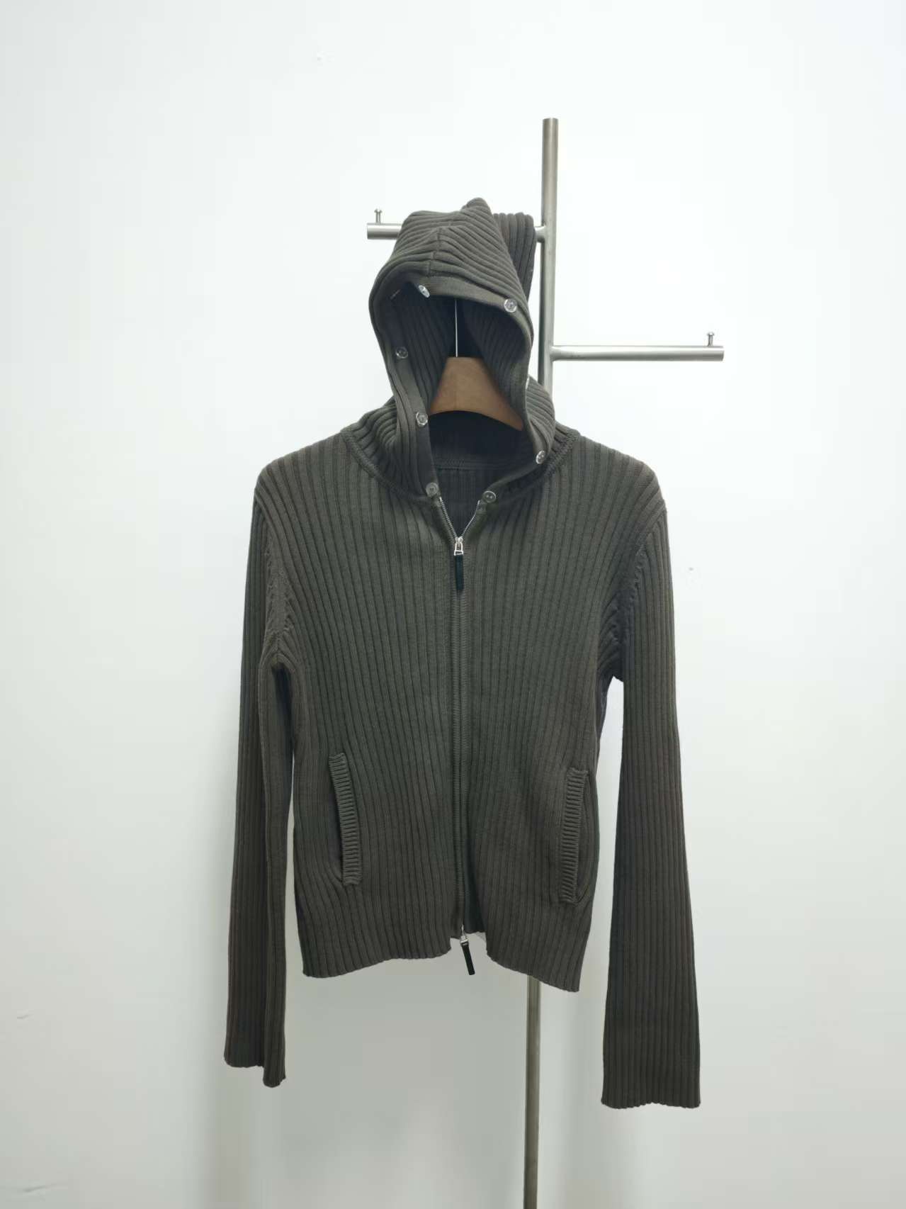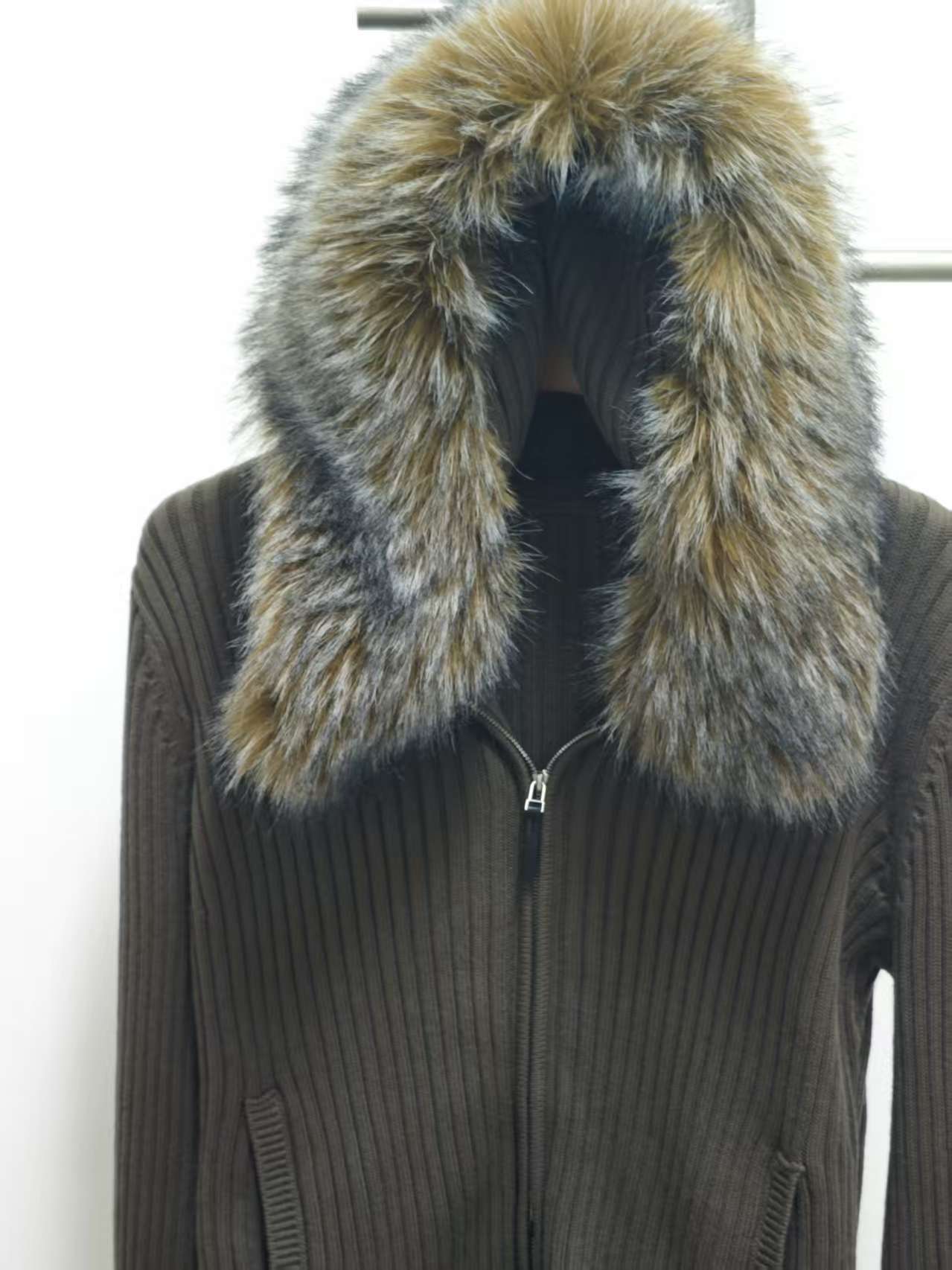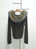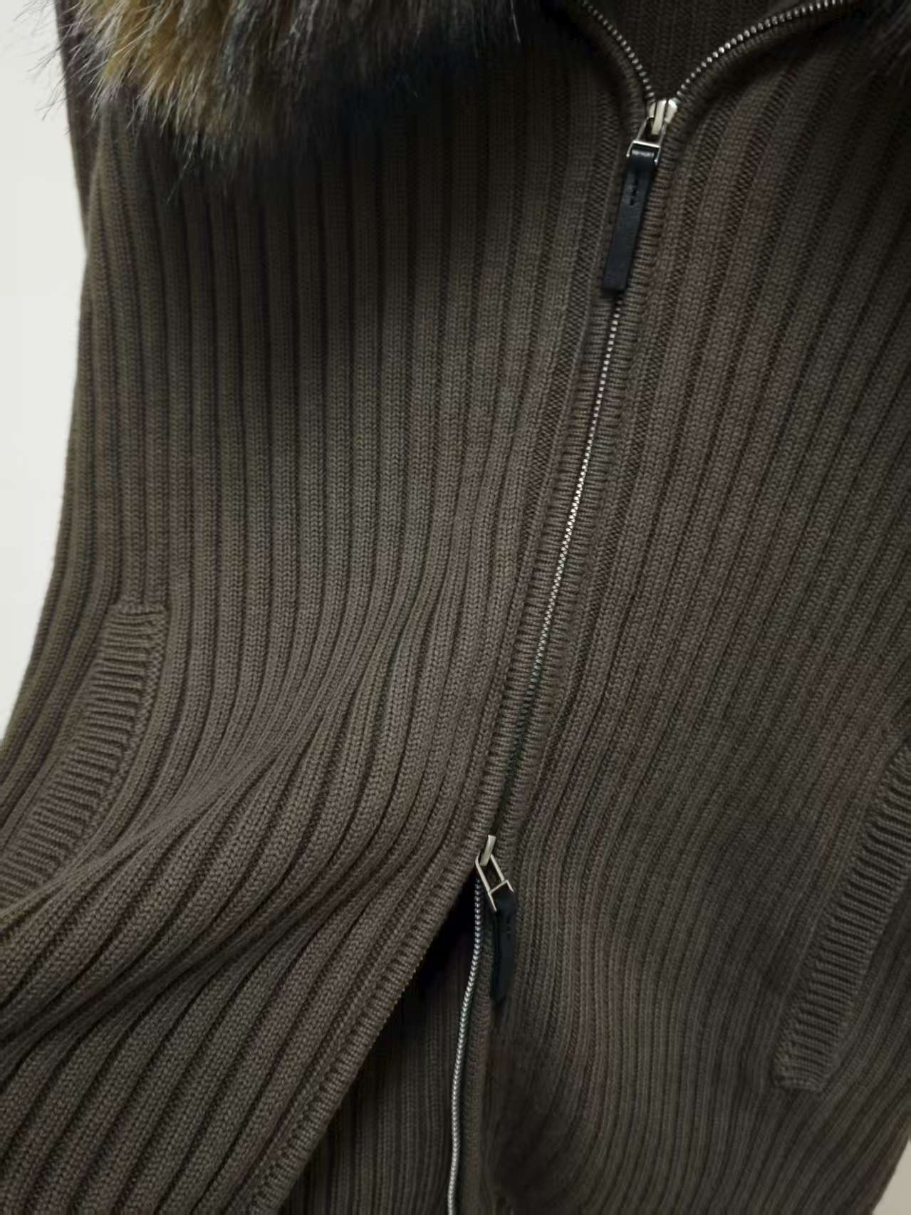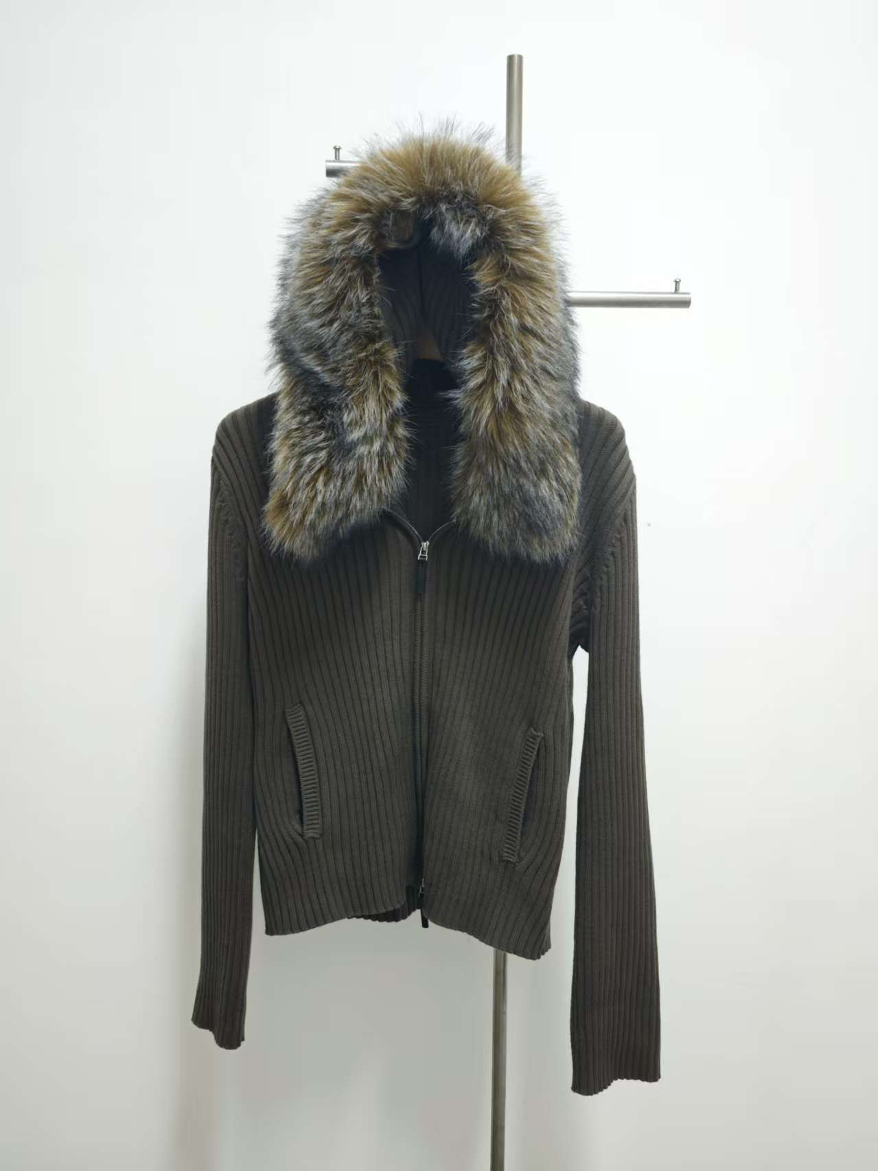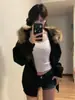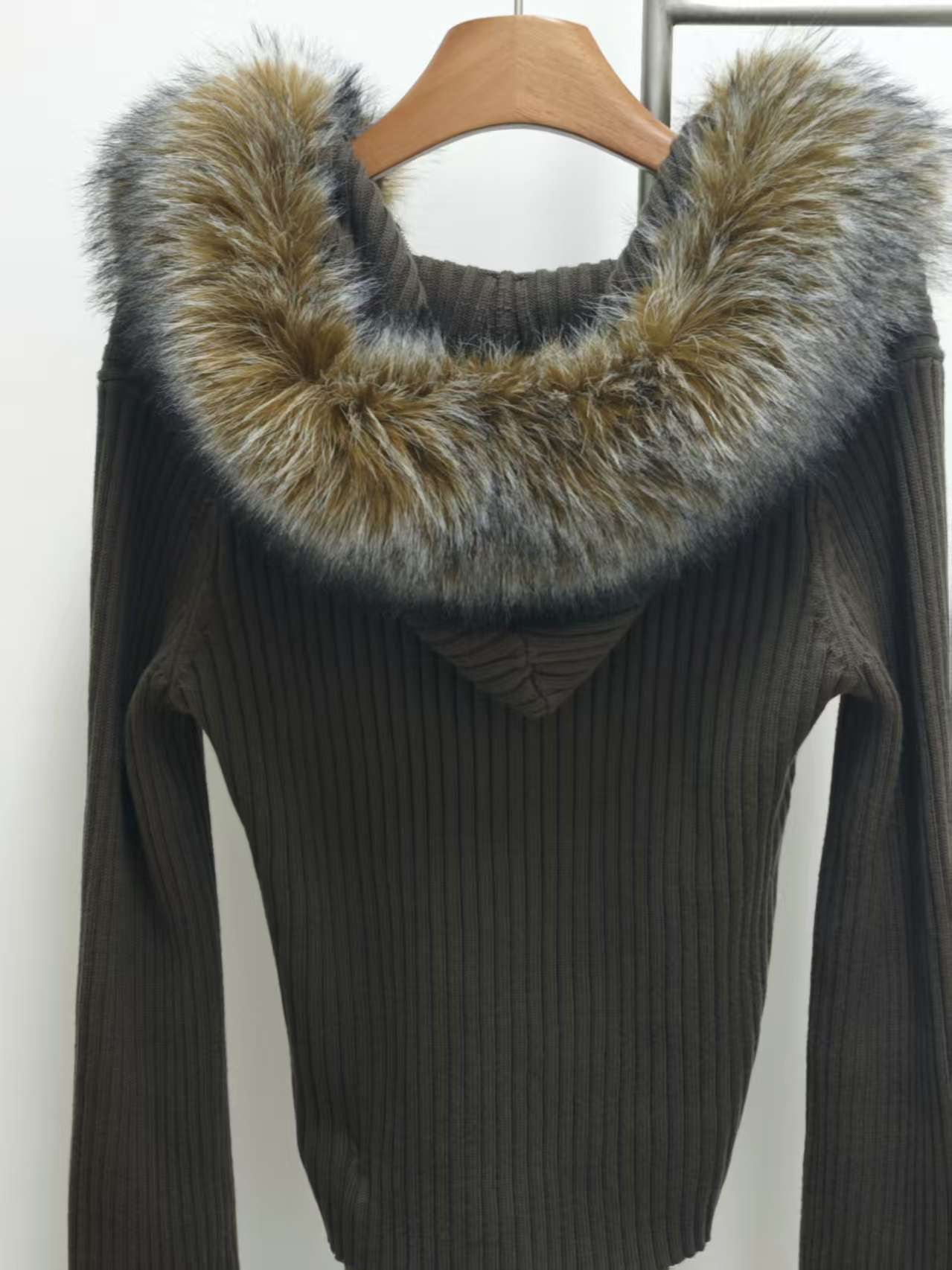 Diseño Nicho Otoño Invierno con Capucha Cuello Grande de Piel Cierre de Cremallera Chaqueta Cárdigan de Punto Verde Militar