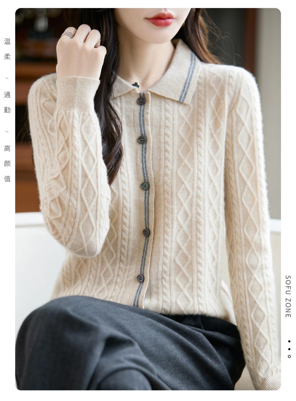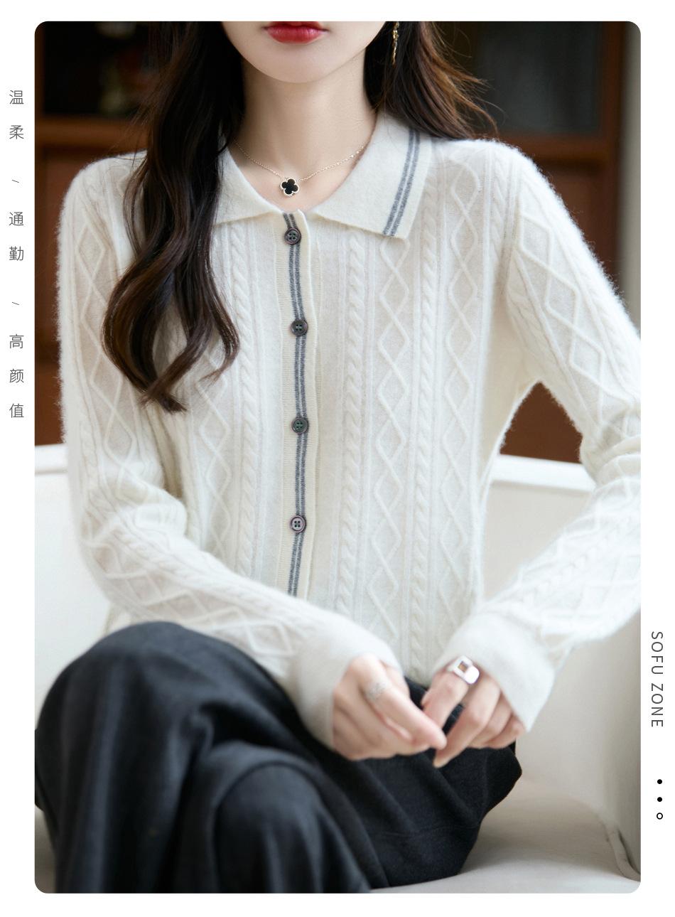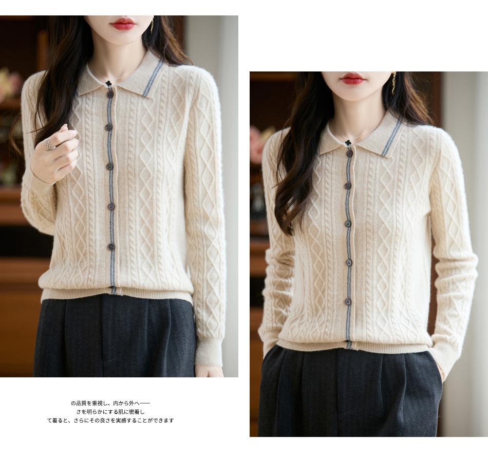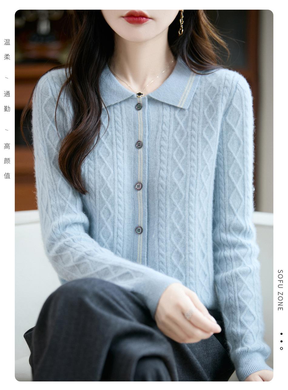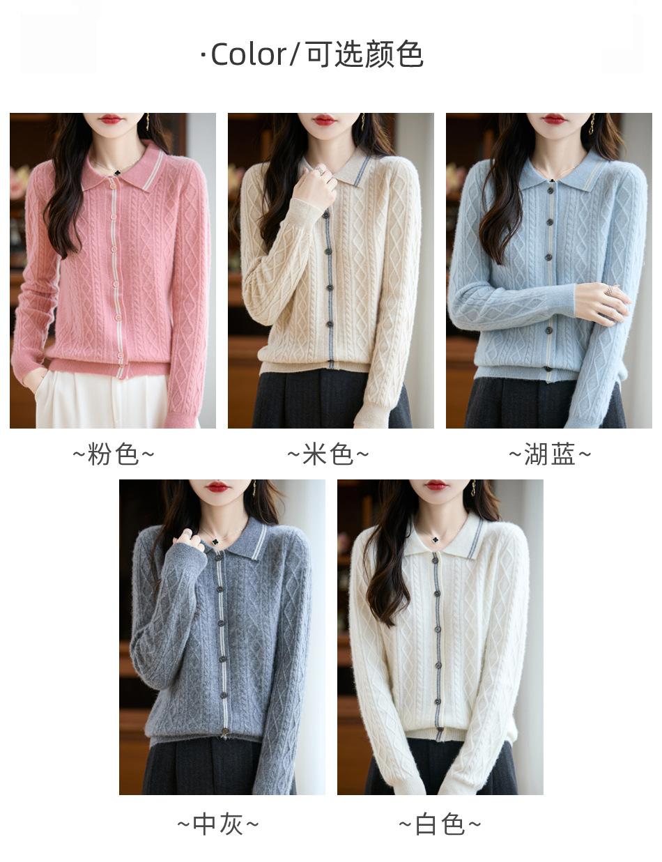 2025 Otoño/Invierno Nuevo Cárdigan de Punto con Cuello POLO de Lana Pura Manga Larga para Mujer Punto Cable Bloque de Color Suelto Versátil Top