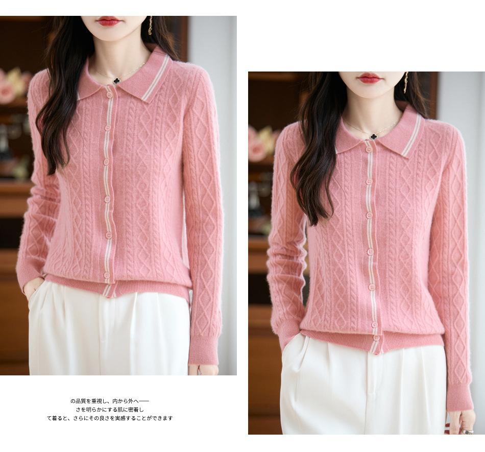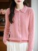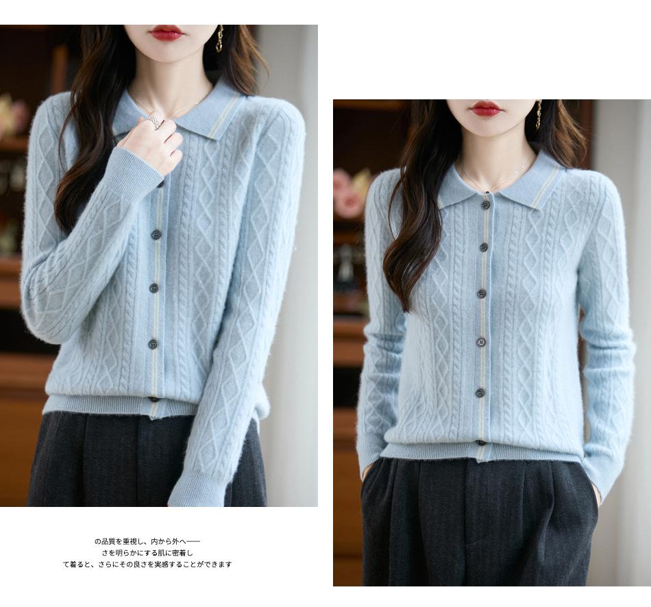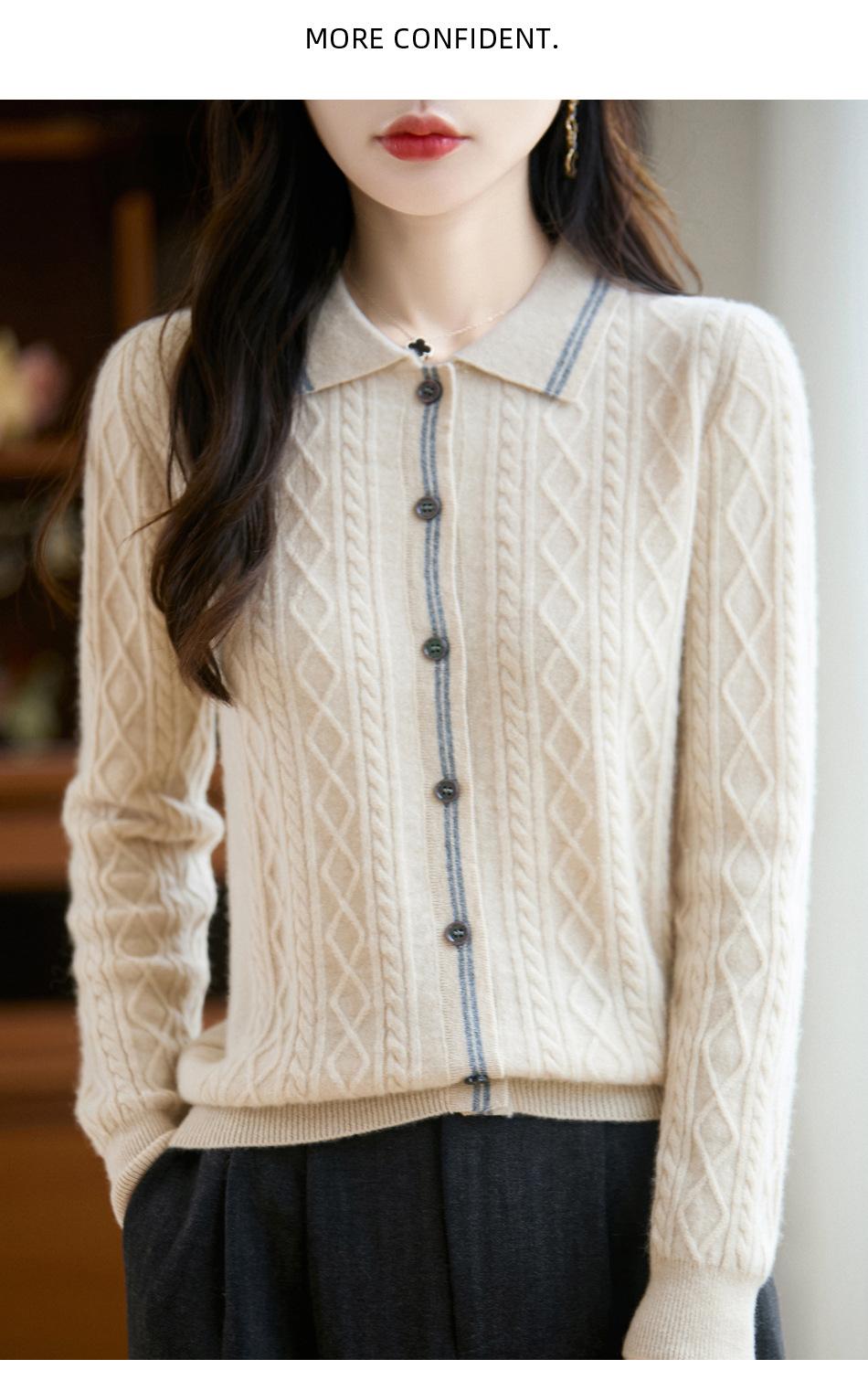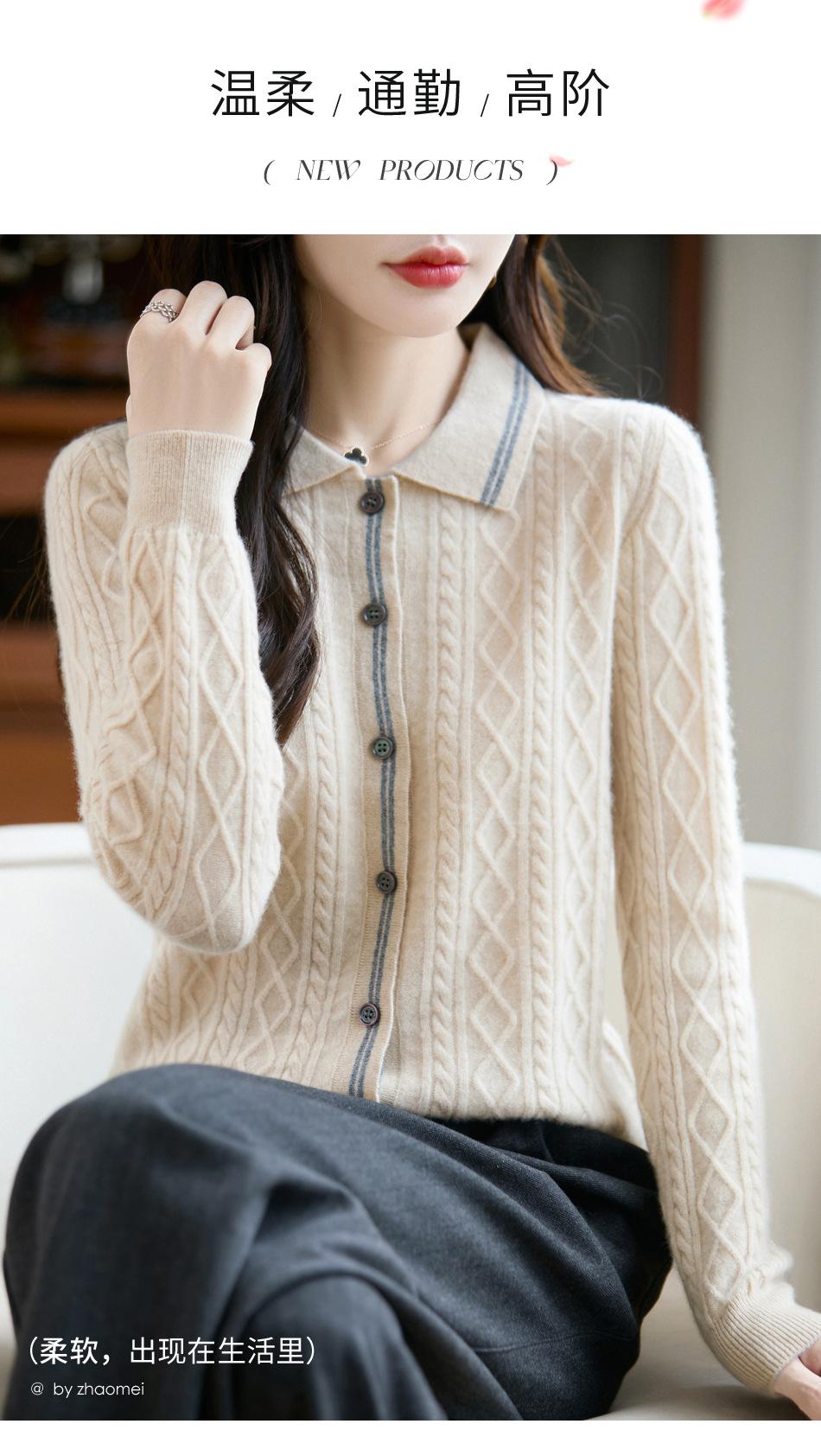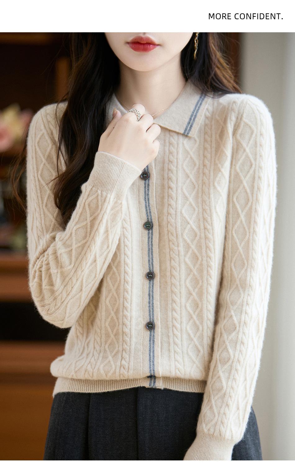 2025 Otoño/Invierno Nuevo Cárdigan de Punto con Cuello POLO de Lana Pura Manga Larga para Mujer Punto Cable Bloque de Color Suelto Versátil Top