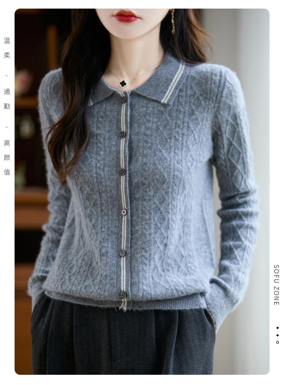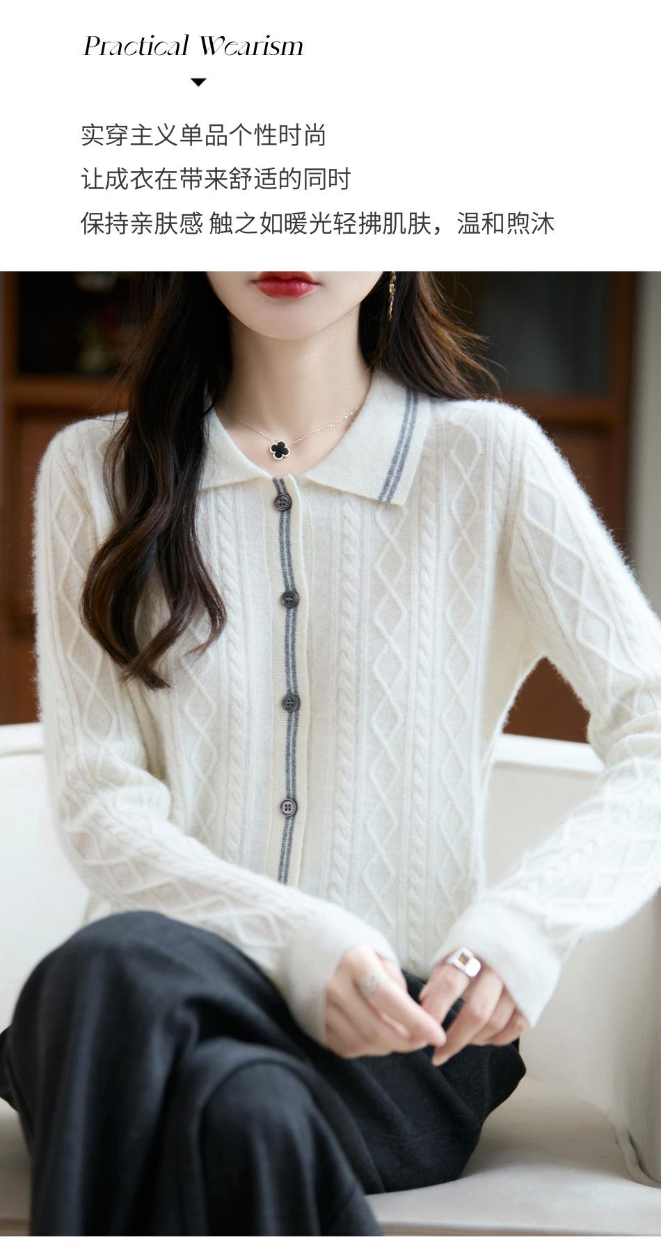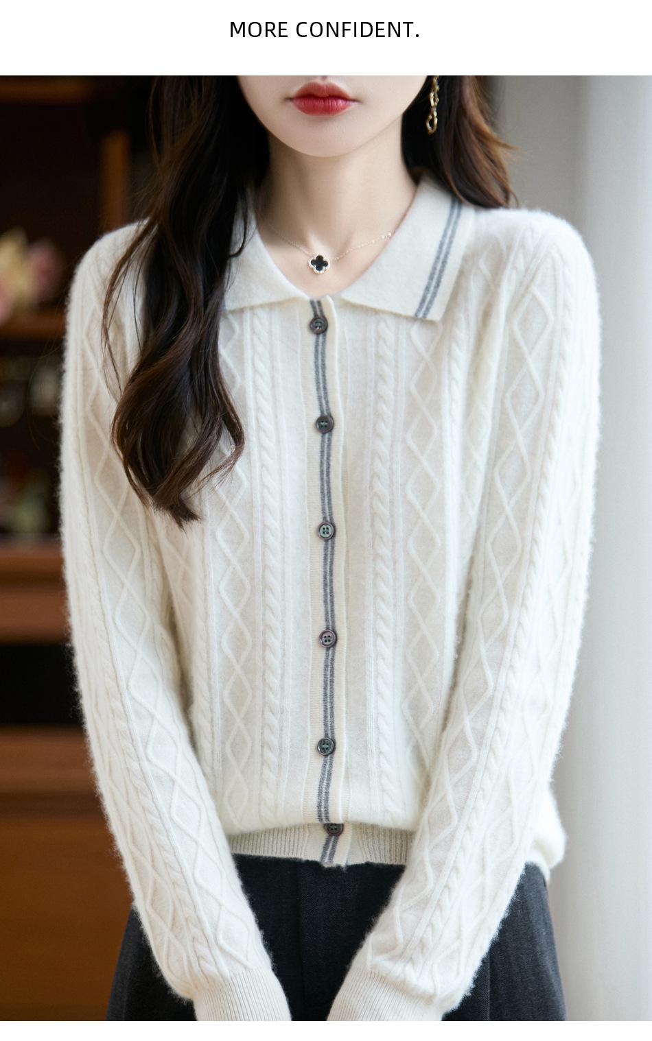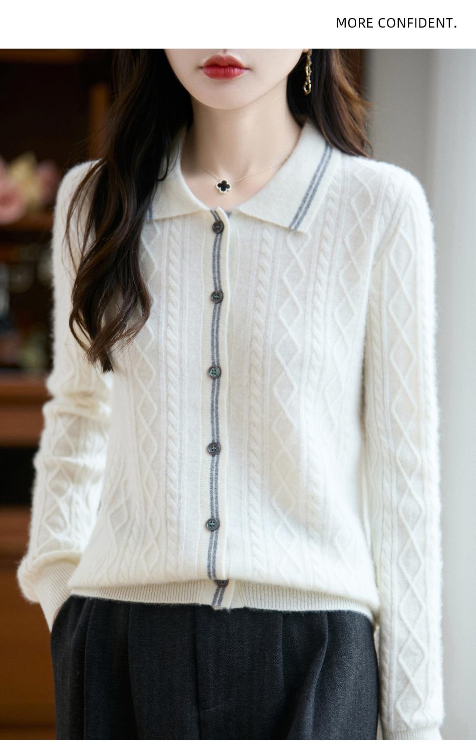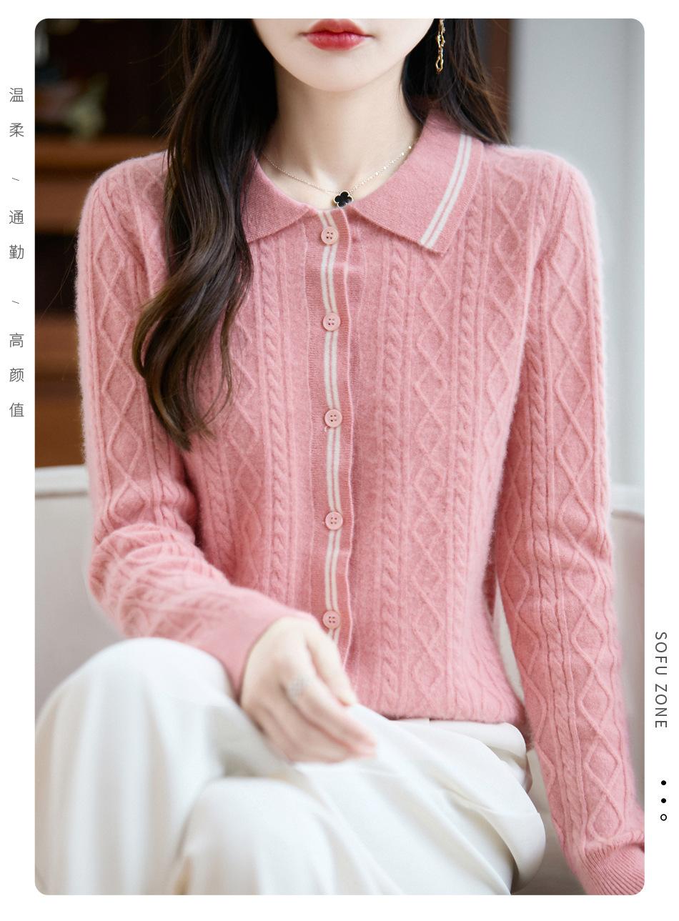 2025 Otoño/Invierno Nuevo Cárdigan de Punto con Cuello POLO de Lana Pura Manga Larga para Mujer Punto Cable Bloque de Color Suelto Versátil Top