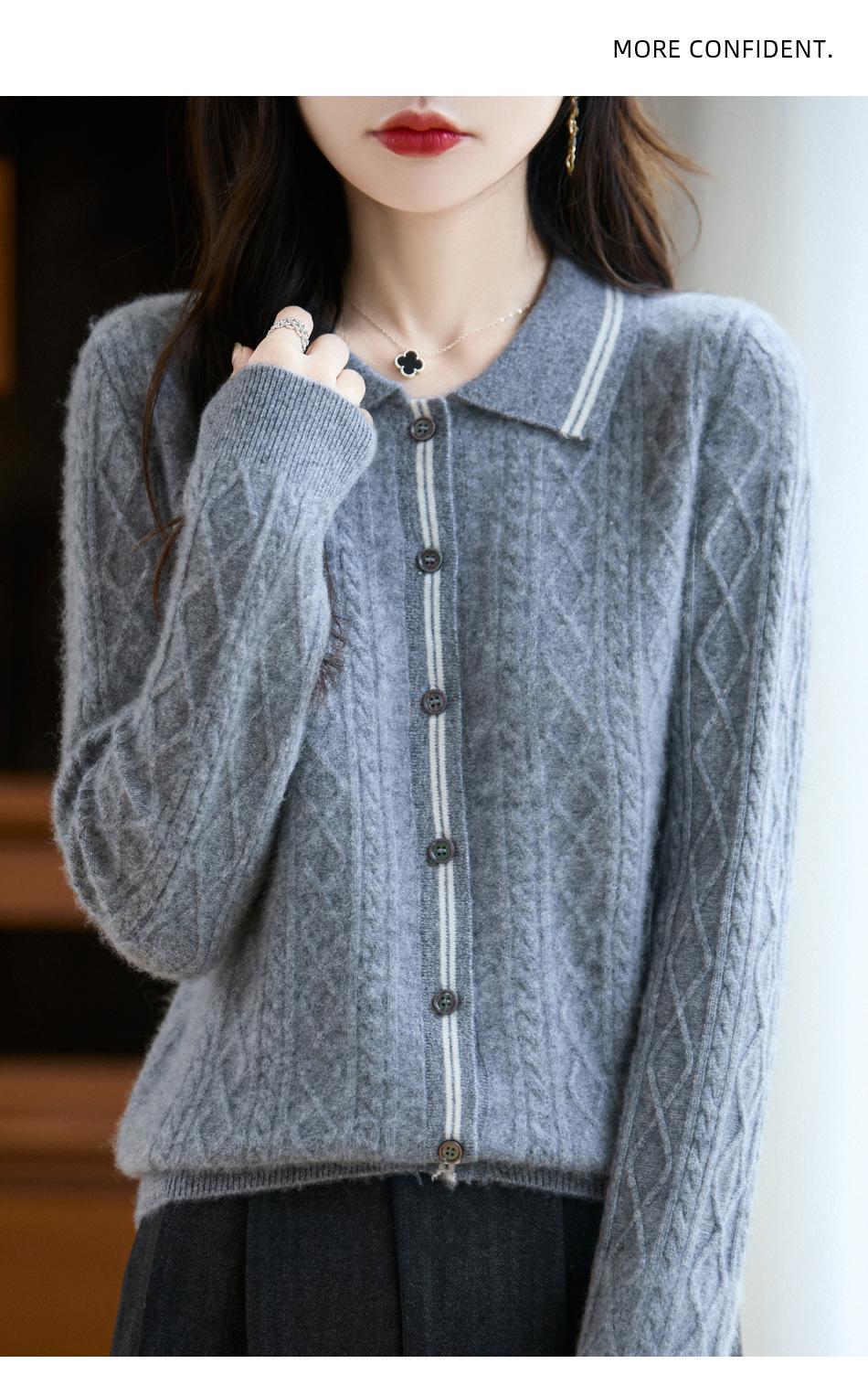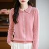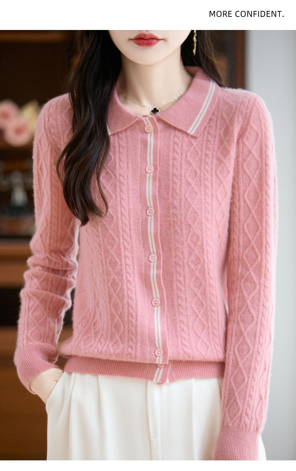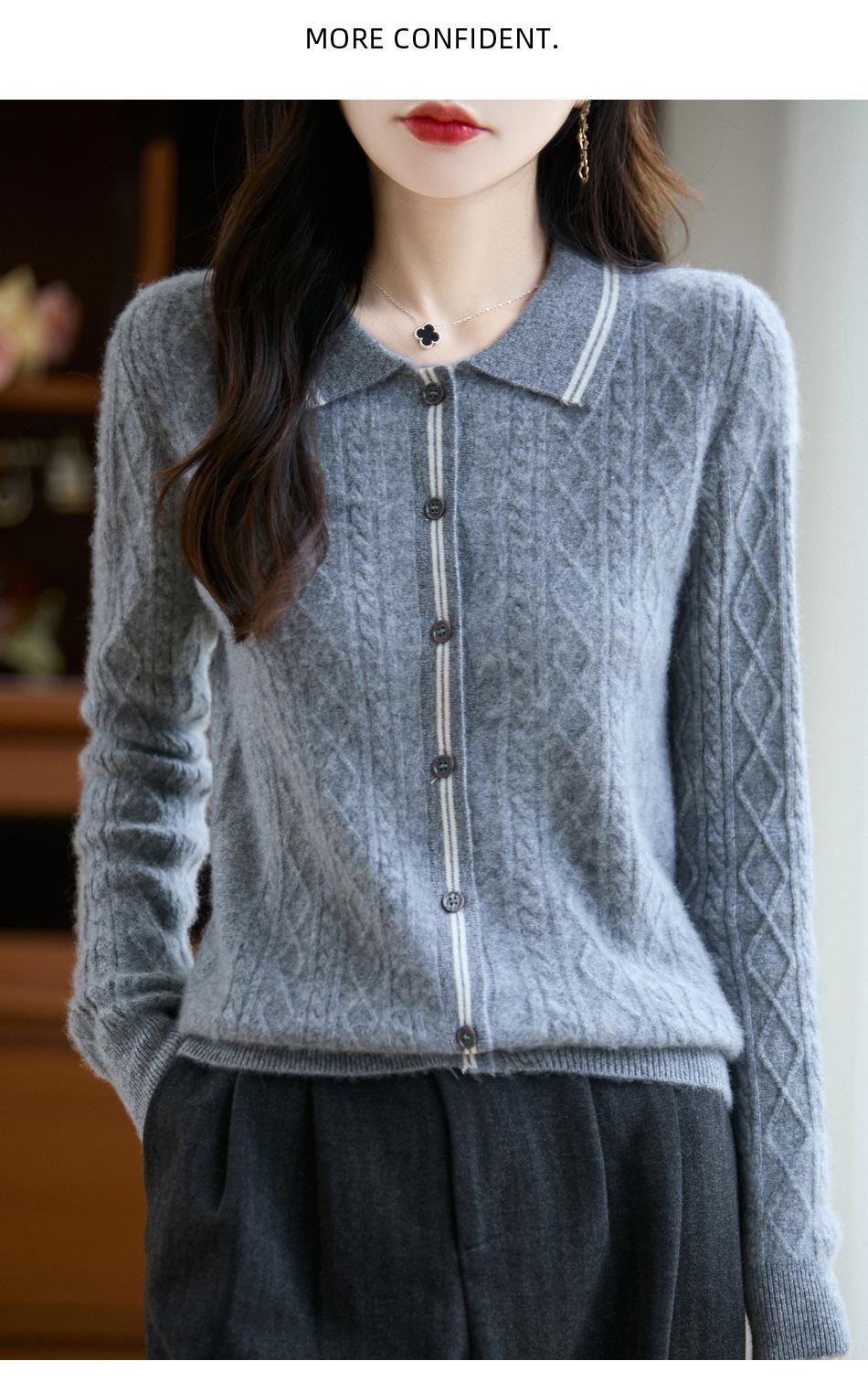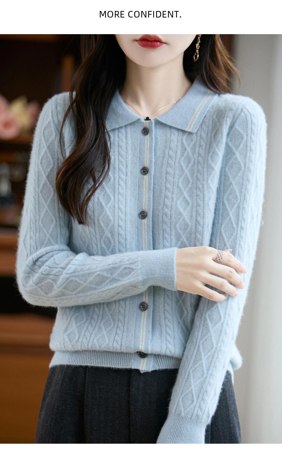 2025 Otoño/Invierno Nuevo Cárdigan de Punto con Cuello POLO de Lana Pura Manga Larga para Mujer Punto Cable Bloque de Color Suelto Versátil Top