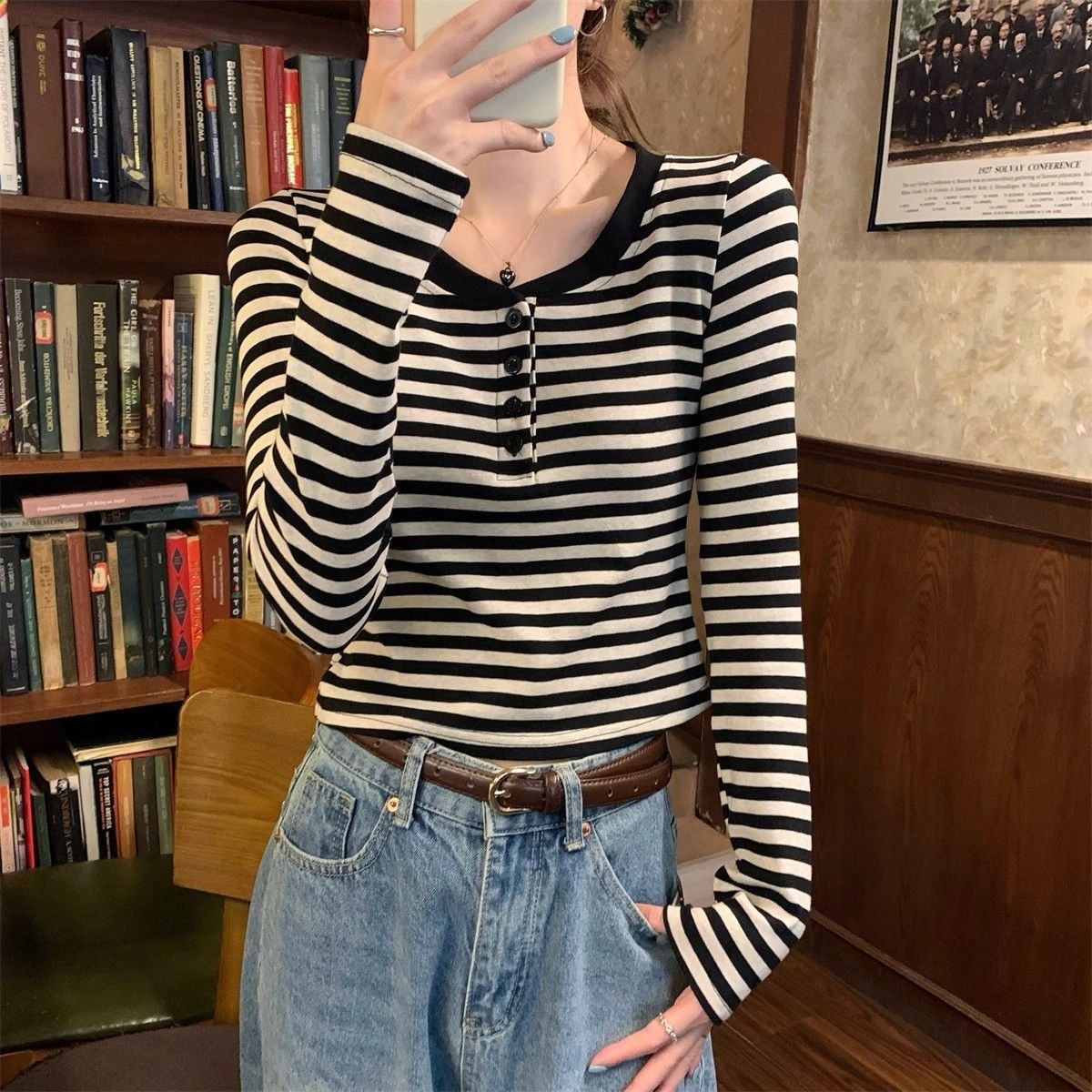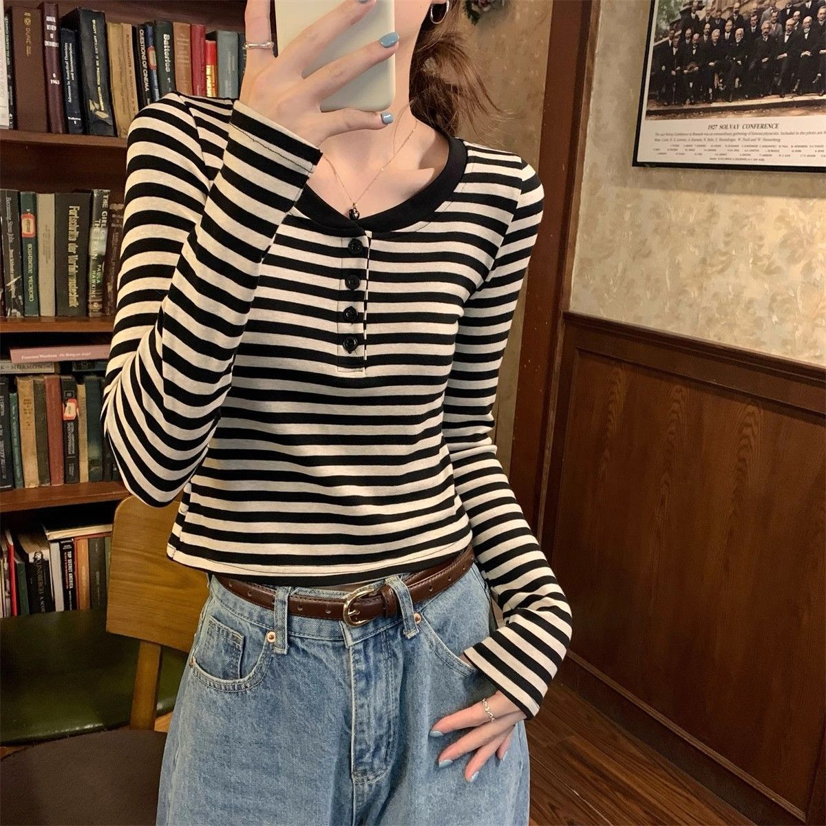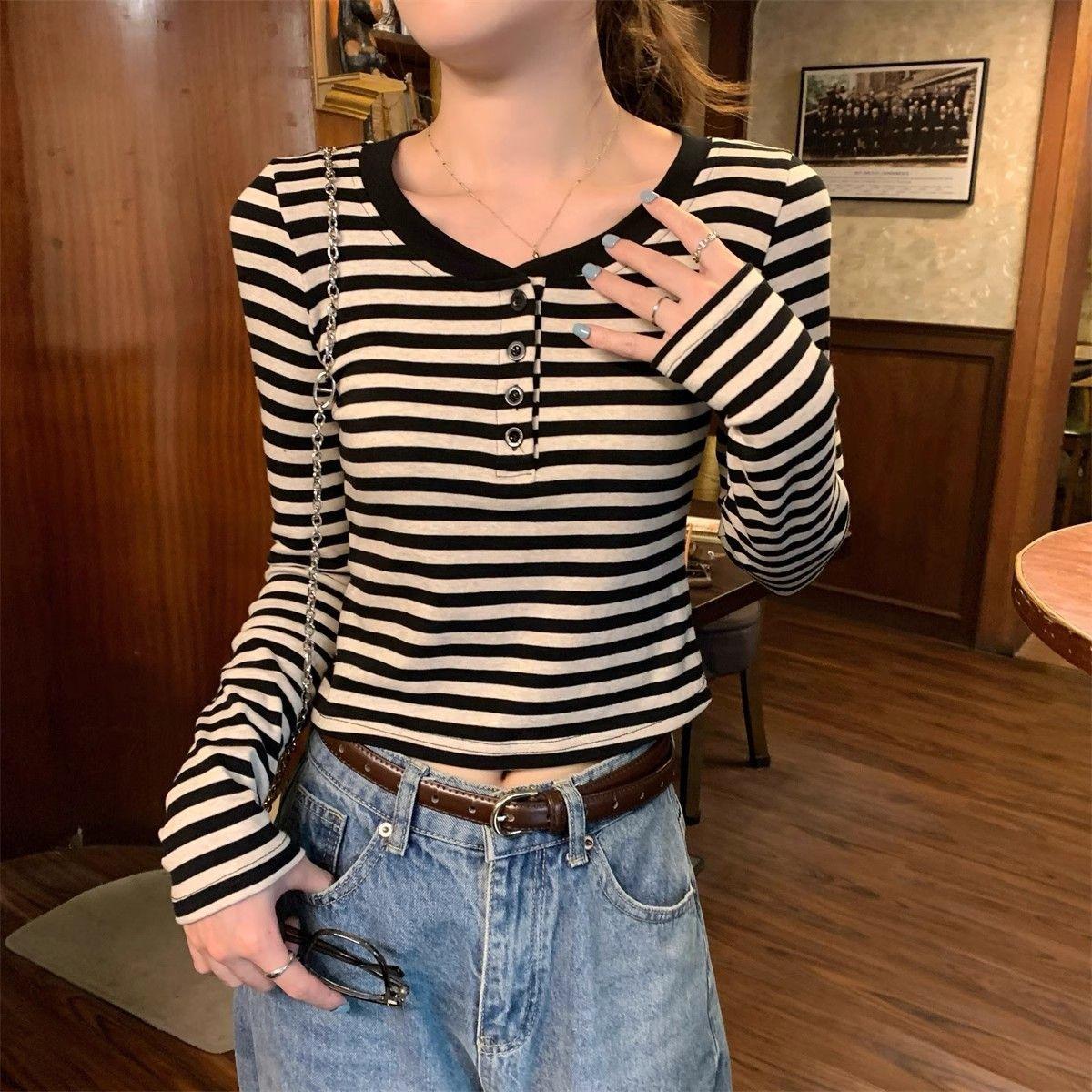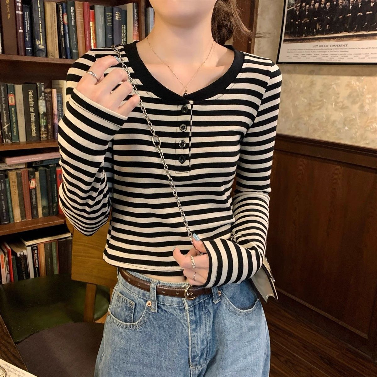 Camiseta de manga larga con cuello redondo a rayas blancas y negras para mujer, nuevo estilo de otoño, ropa interior ajustada, adelgazante, corta, moderna, básica.