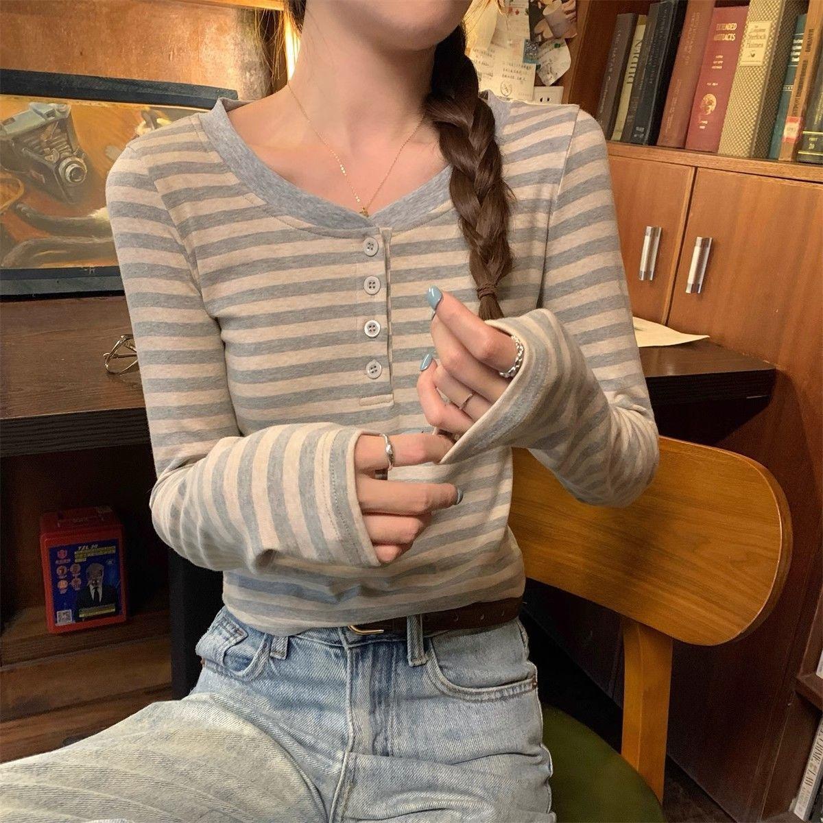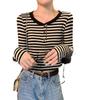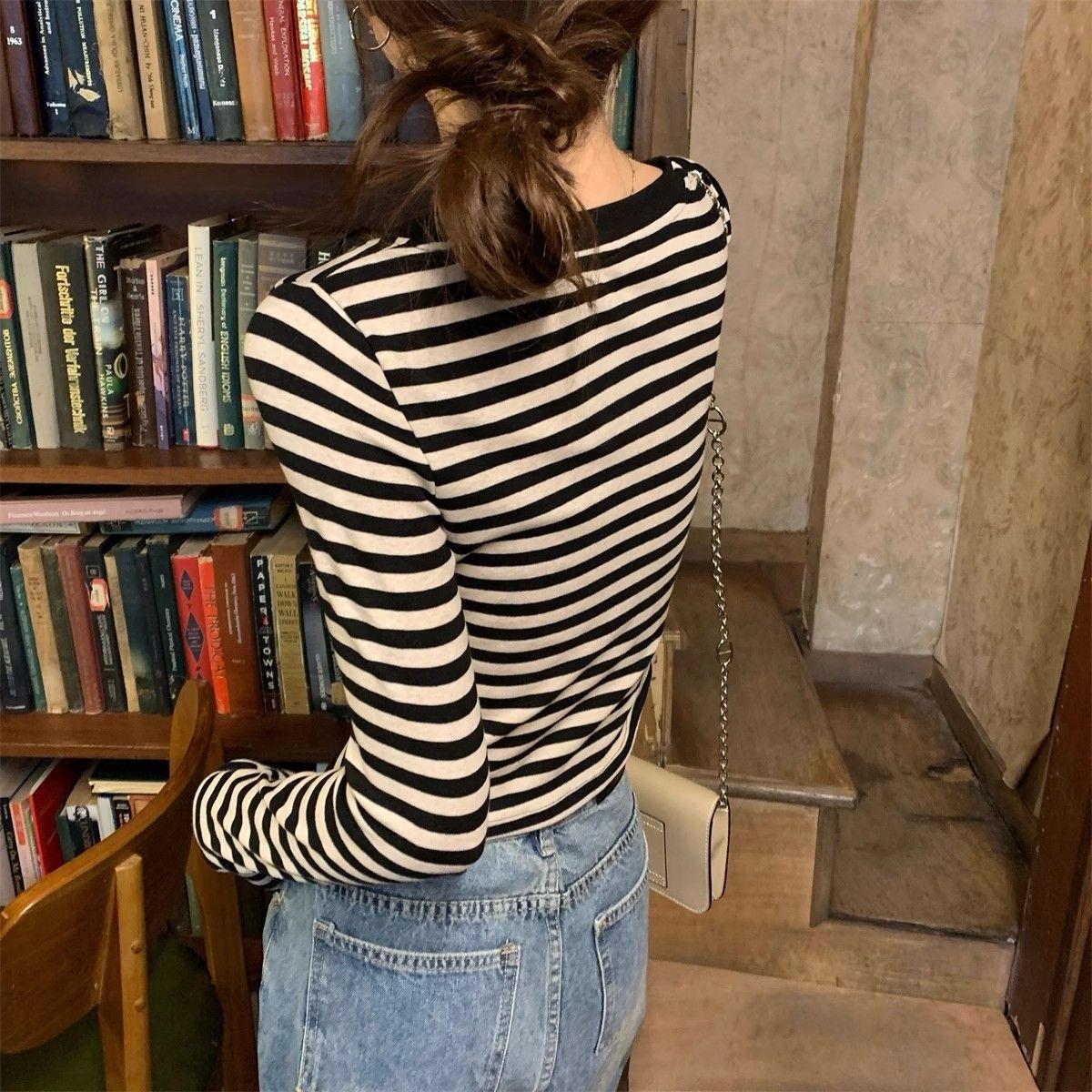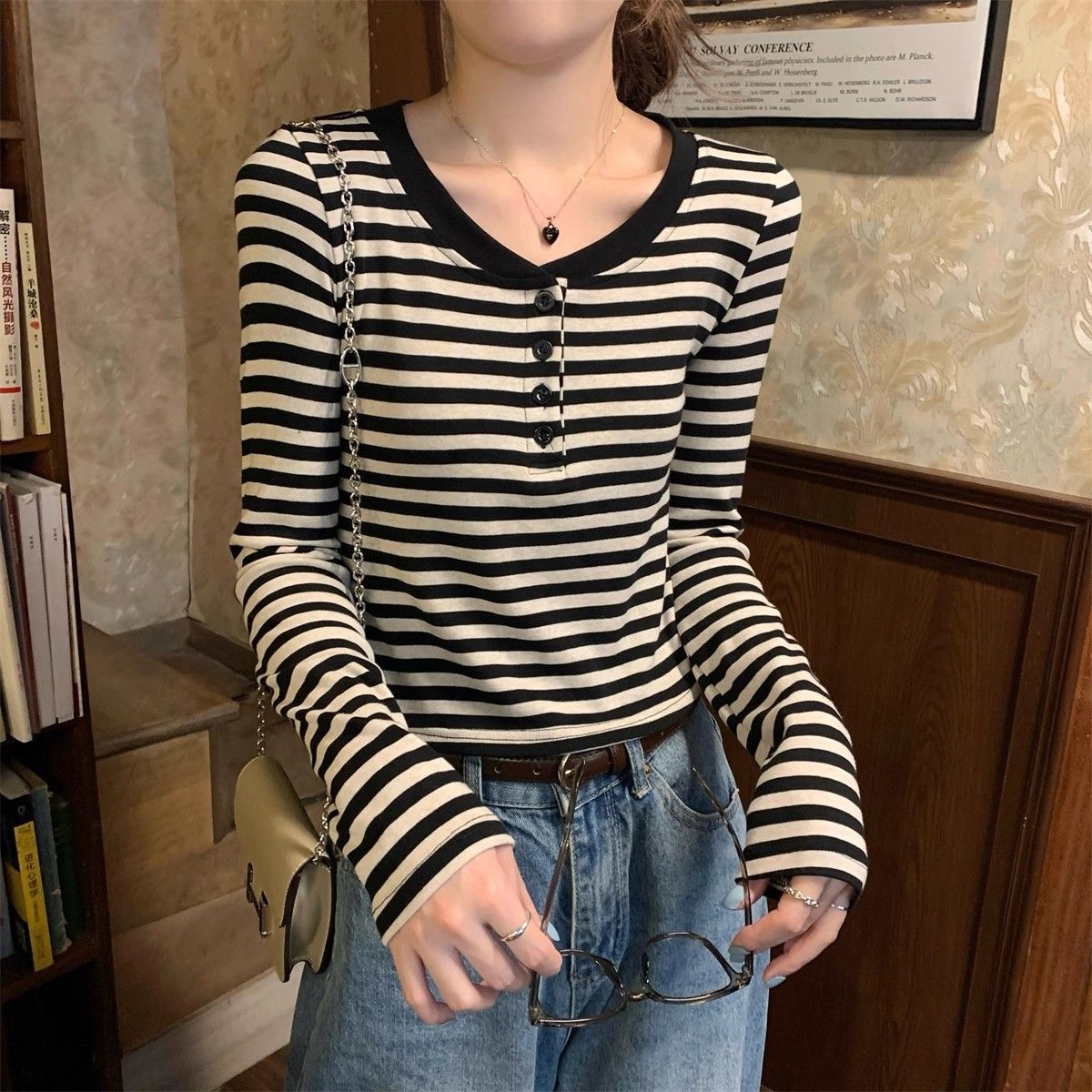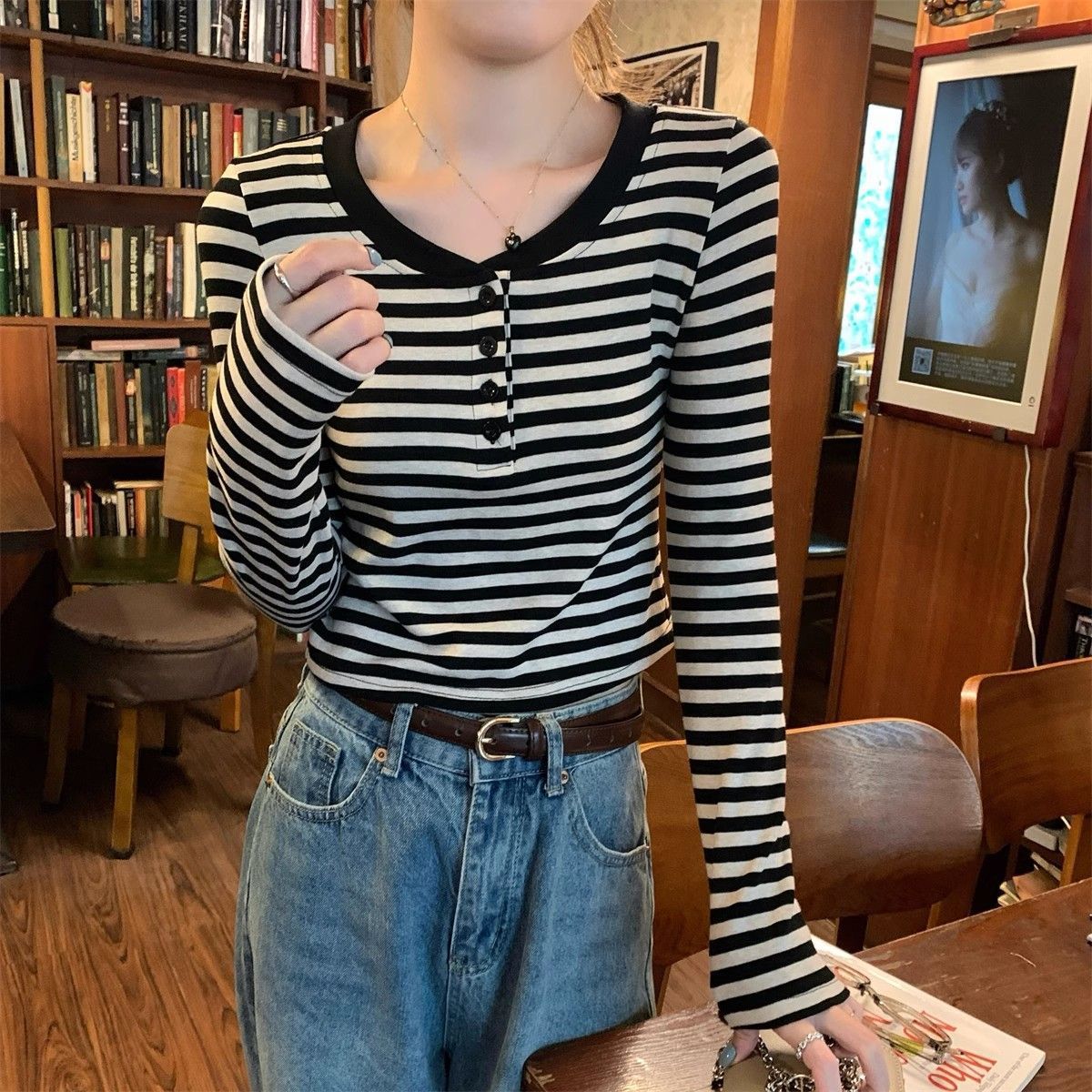 Camiseta de manga larga con cuello redondo a rayas blancas y negras para mujer, nuevo estilo de otoño, ropa interior ajustada, adelgazante, corta, moderna, básica.
