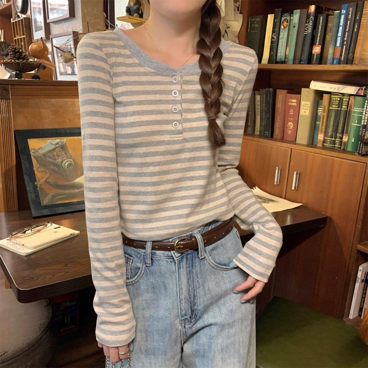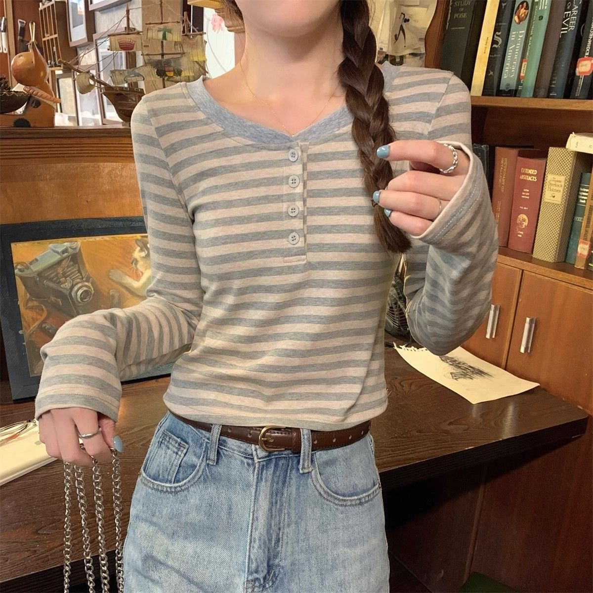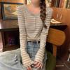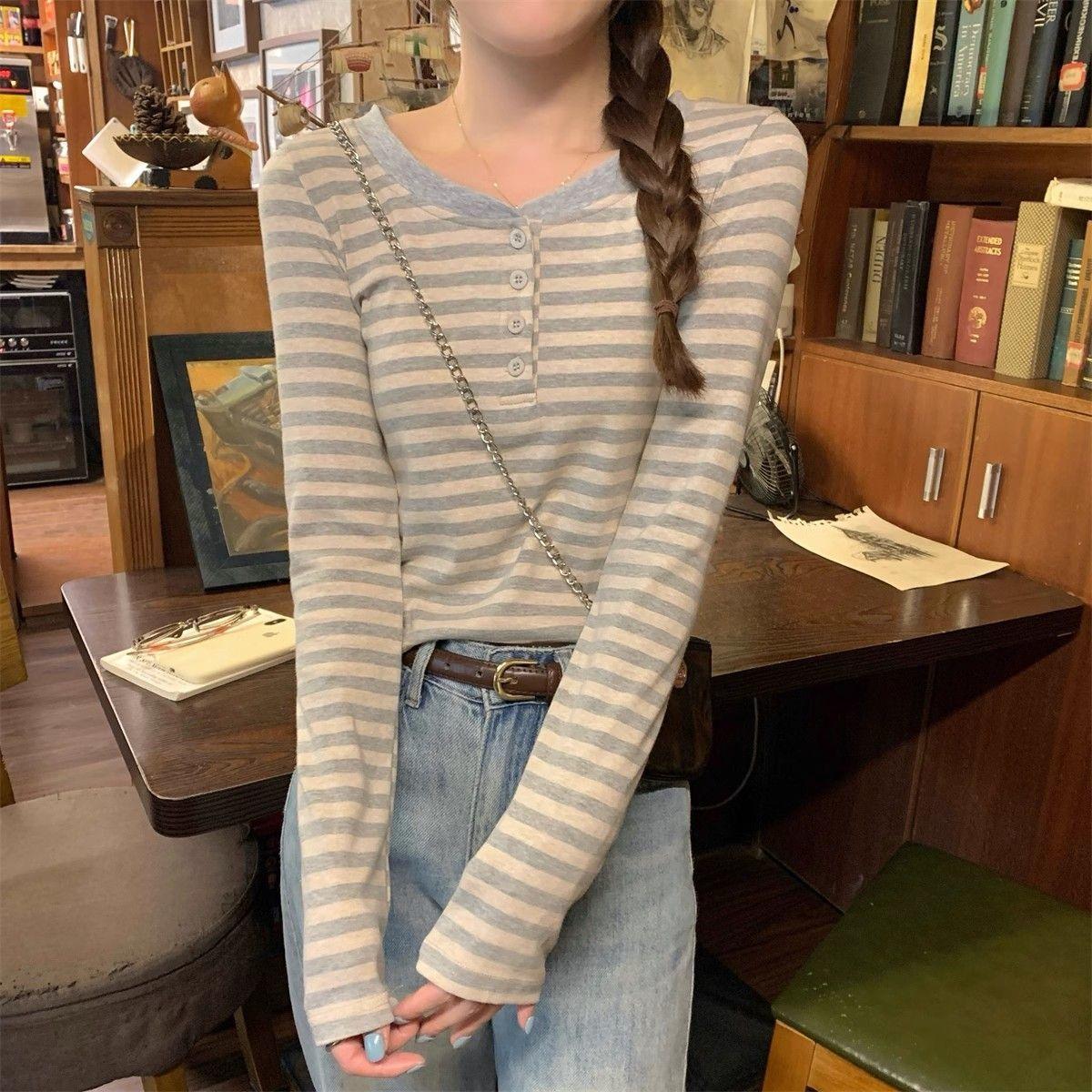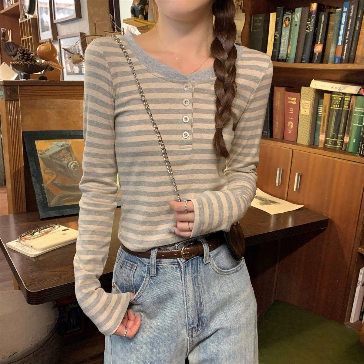 Camiseta de manga larga con cuello redondo a rayas blancas y negras para mujer, nuevo estilo de otoño, ropa interior ajustada, adelgazante, corta, moderna, básica.