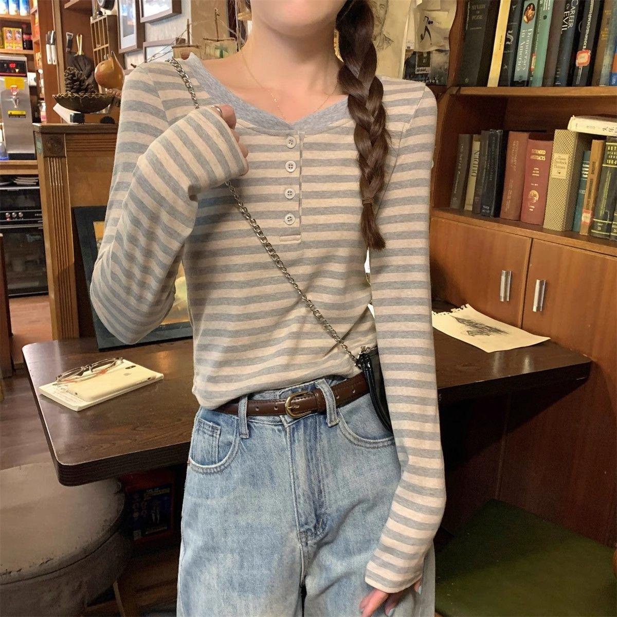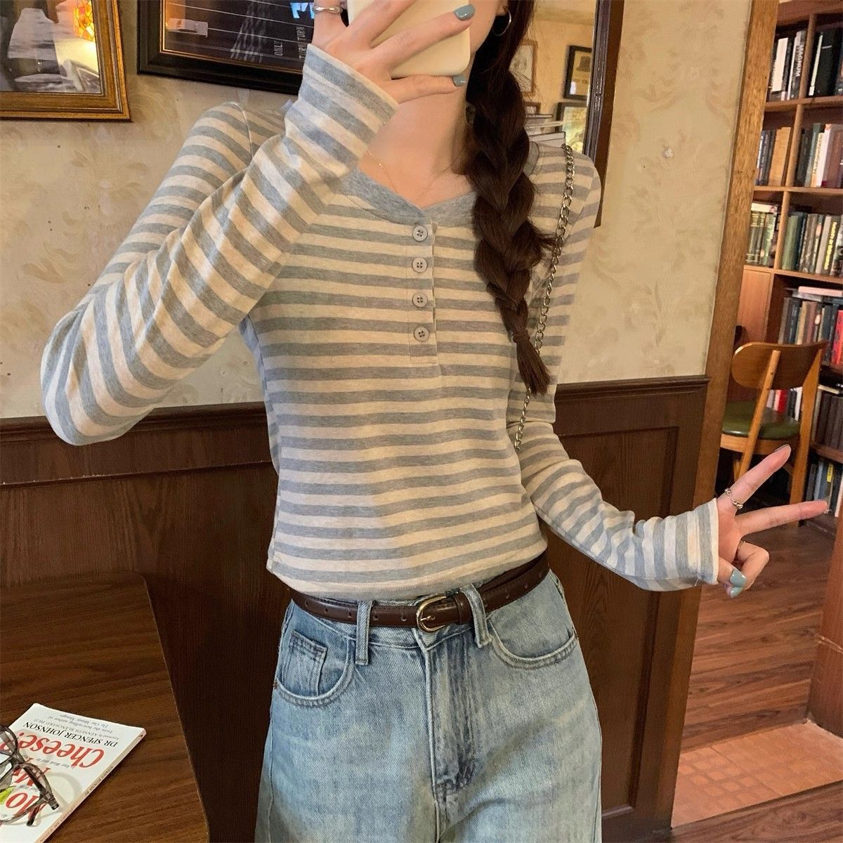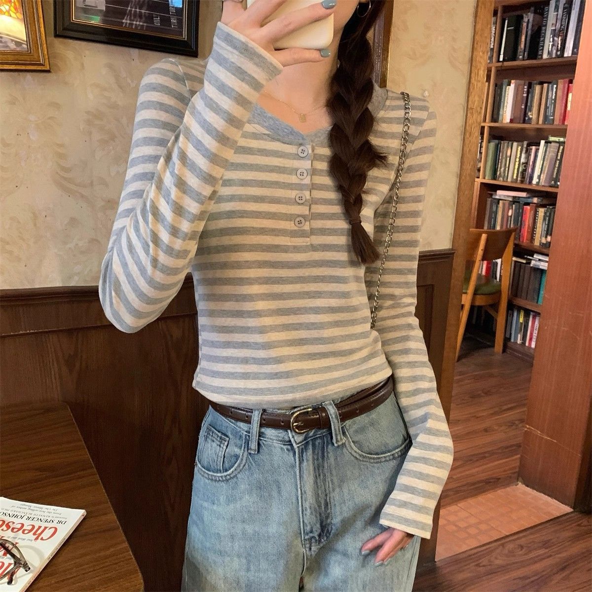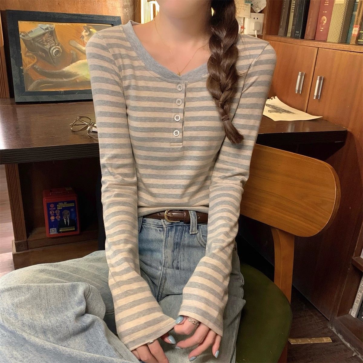 Camiseta de manga larga con cuello redondo a rayas blancas y negras para mujer, nuevo estilo de otoño, ropa interior ajustada, adelgazante, corta, moderna, básica.