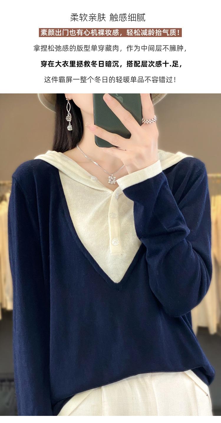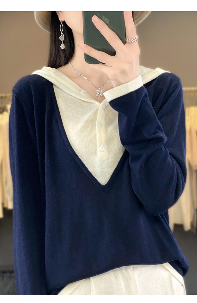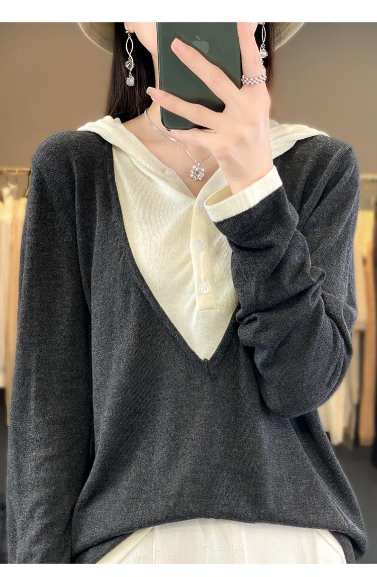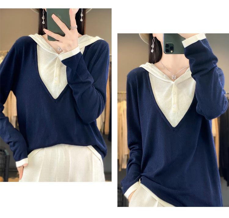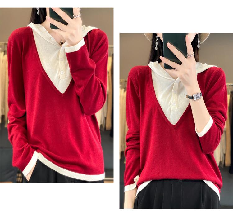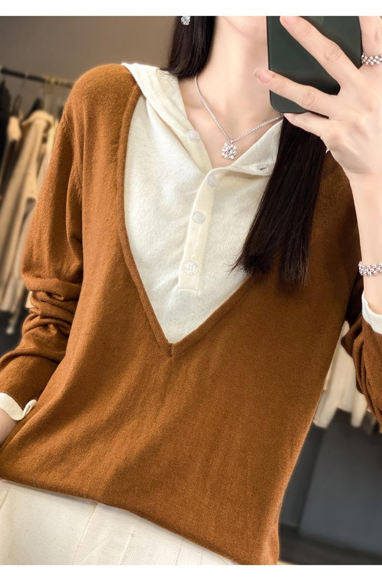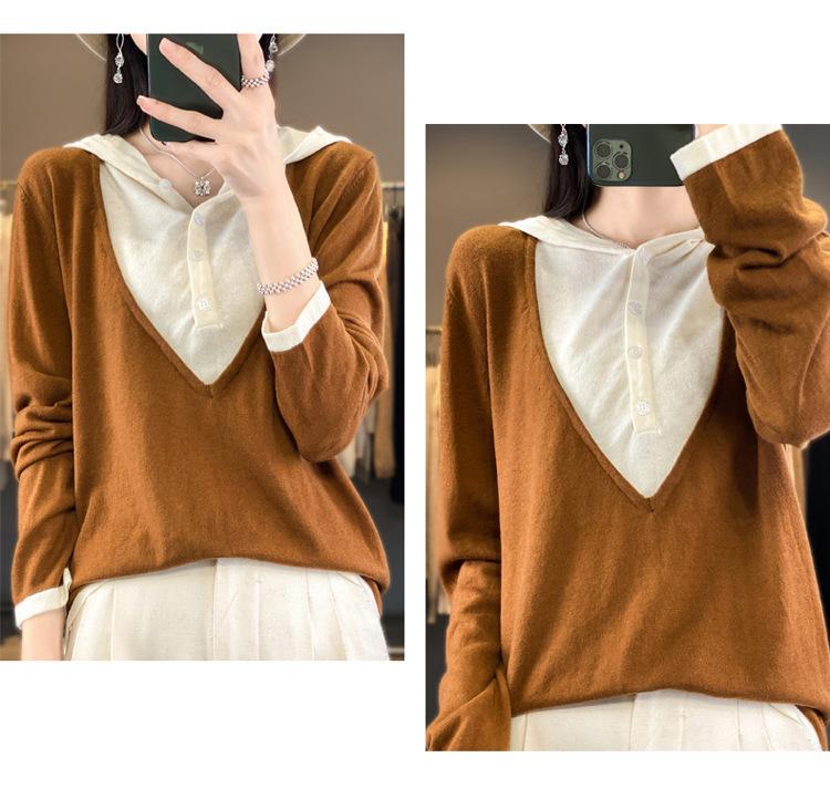 Nuevo Suéter Pulóver para Mujer Transfronterizo Bloque de Color Lana 2025 Cálido Tejido Fino Manga Larga Sudadera con Capucha Otoño Invierno Suéter Tejido para Mujer