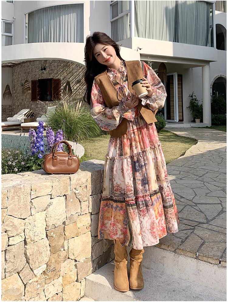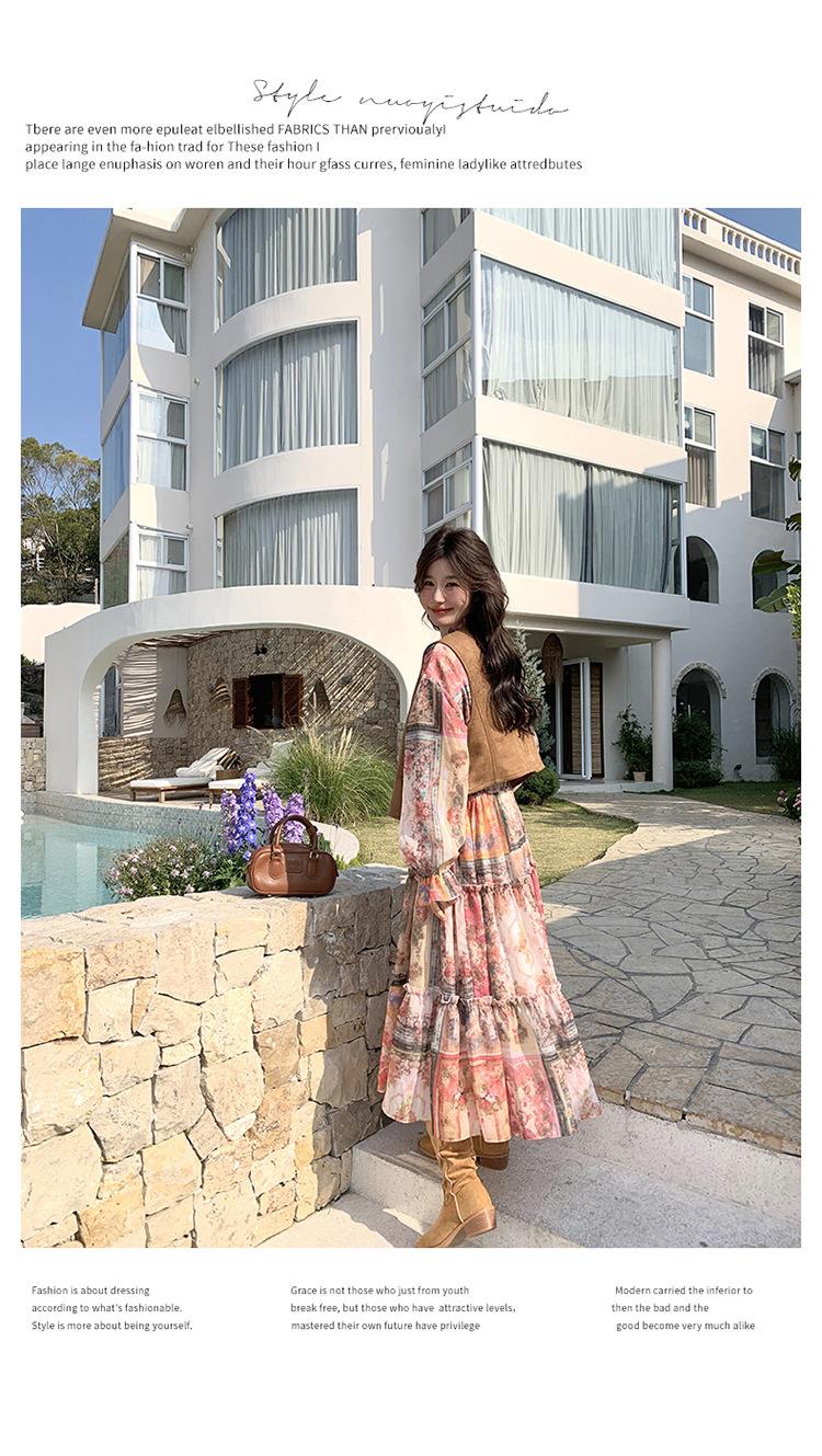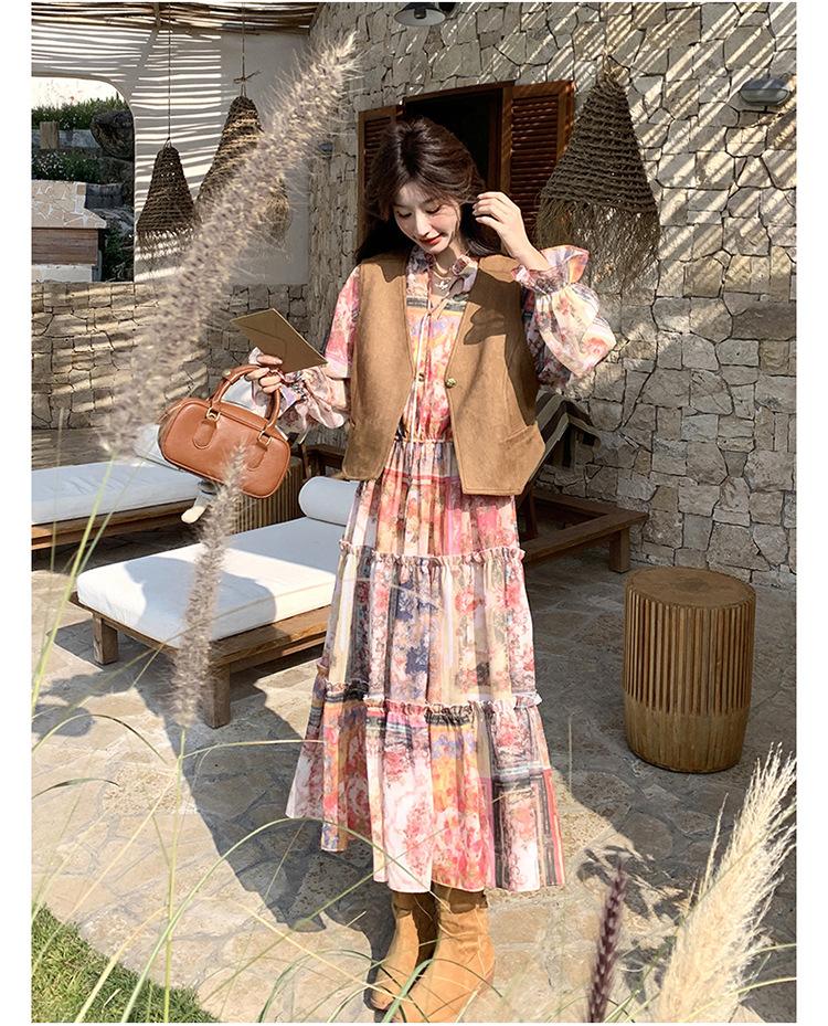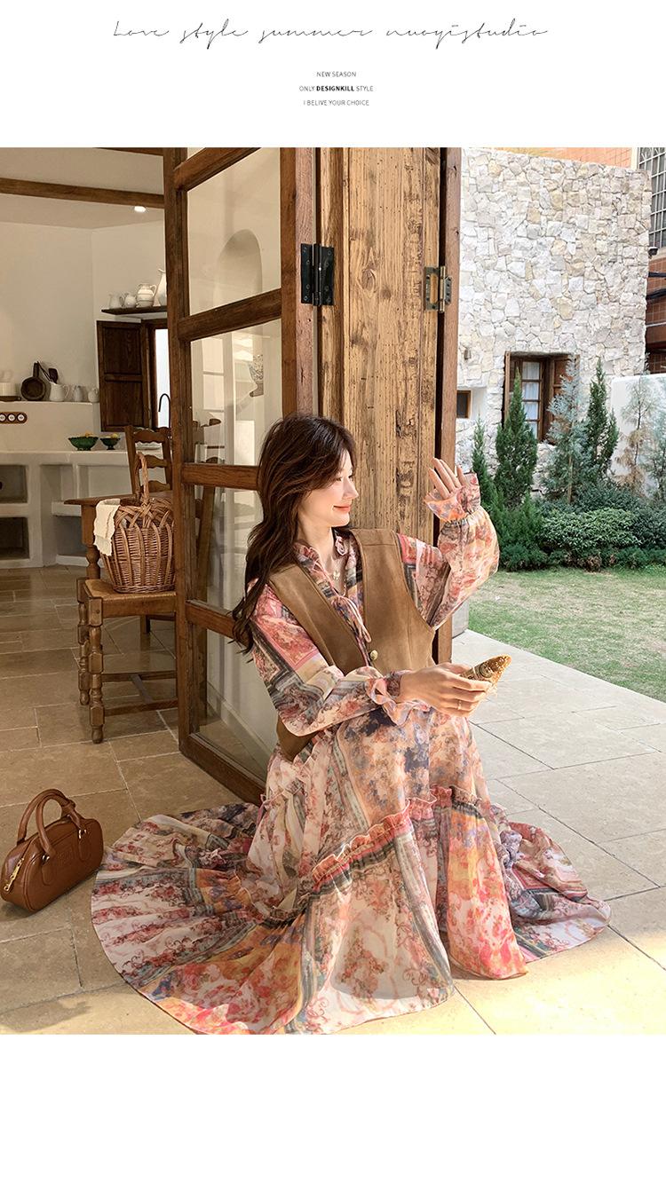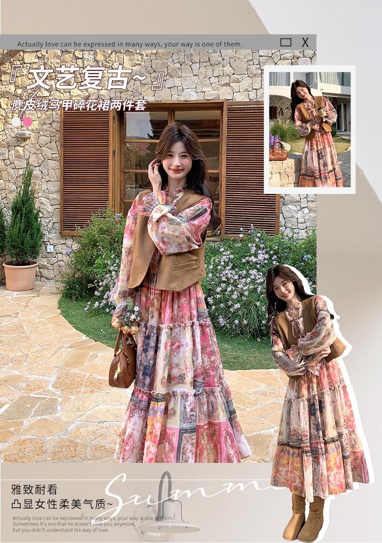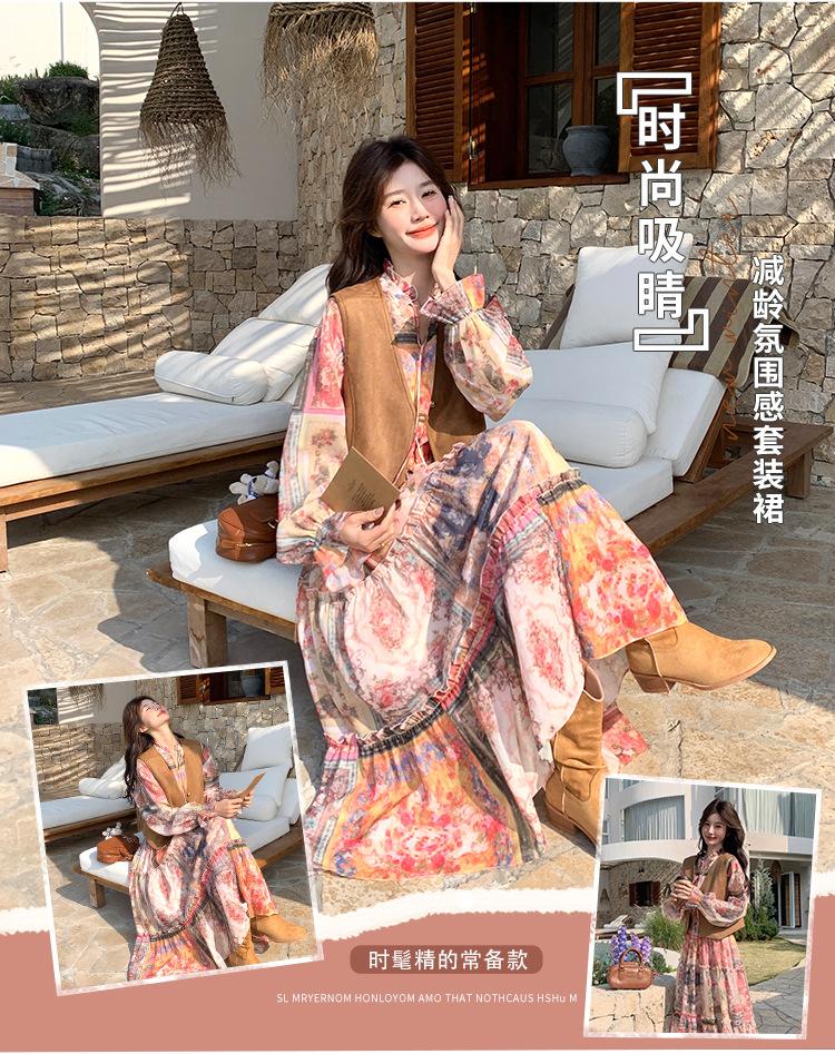 Conjunto de dos piezas de primavera y otoño para mujer 2025 Nuevo estilo Reductor de edad Chaleco versátil + Conjunto de vestido largo estampado Conjunto de dos piezas