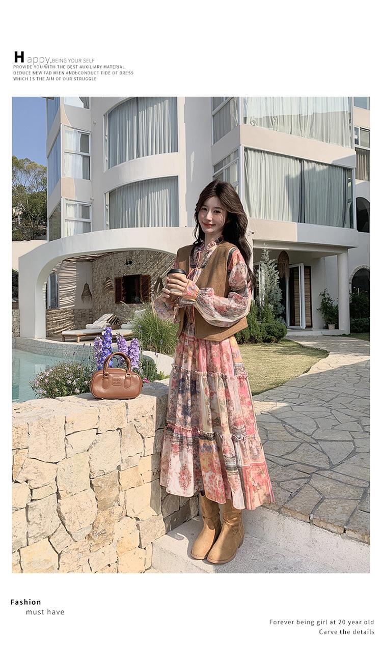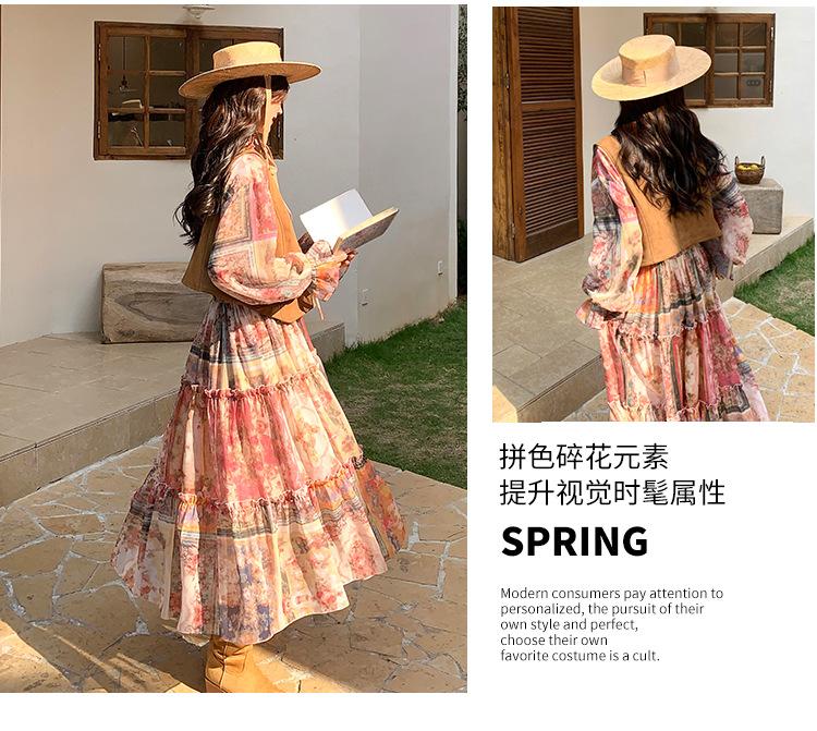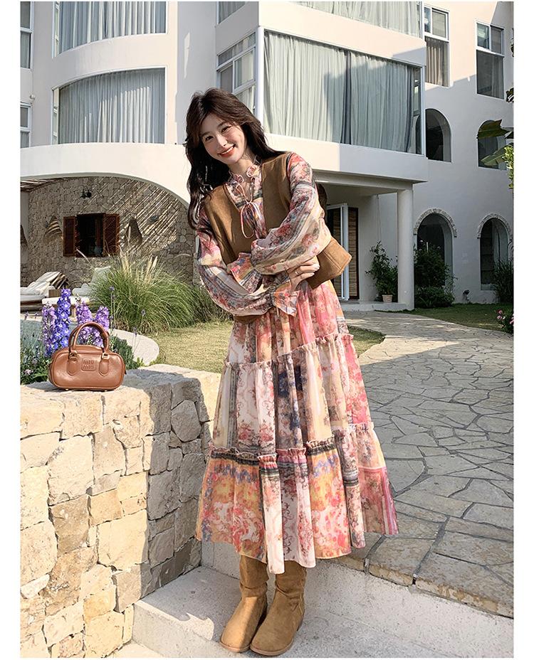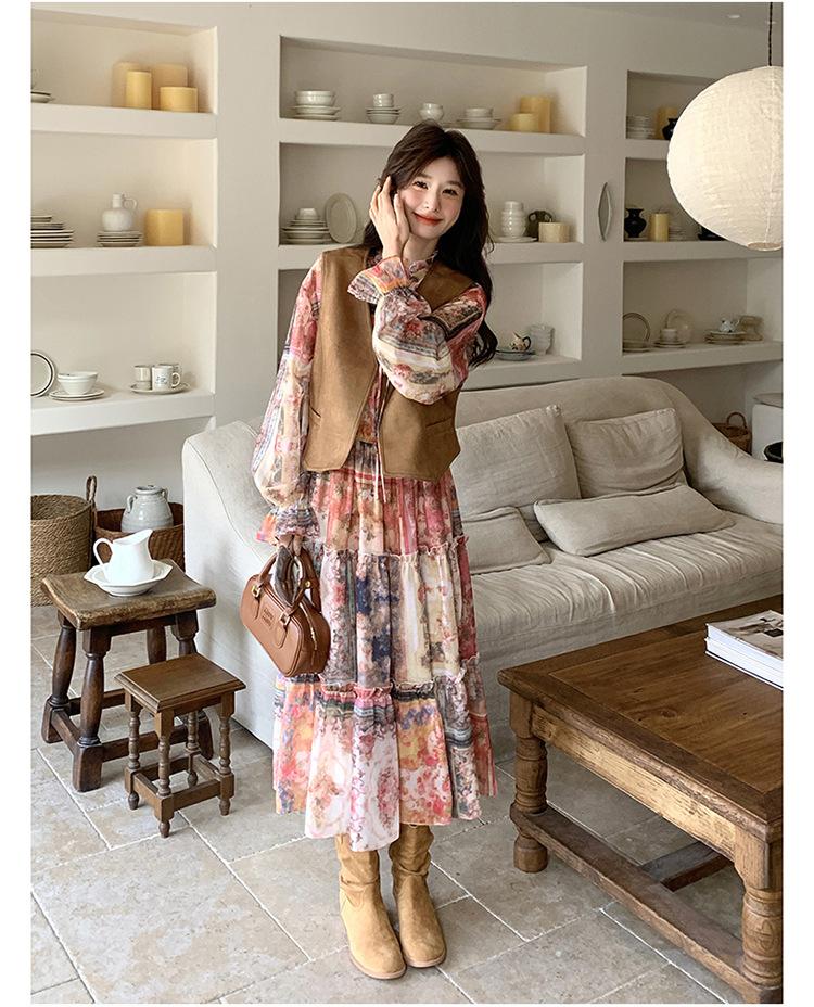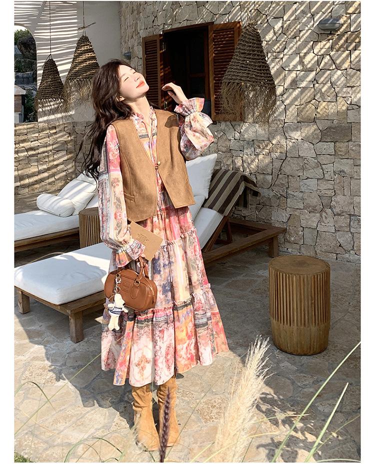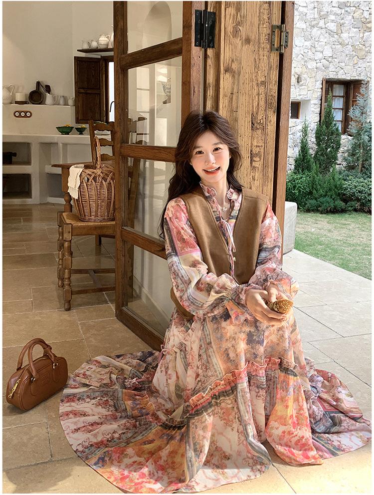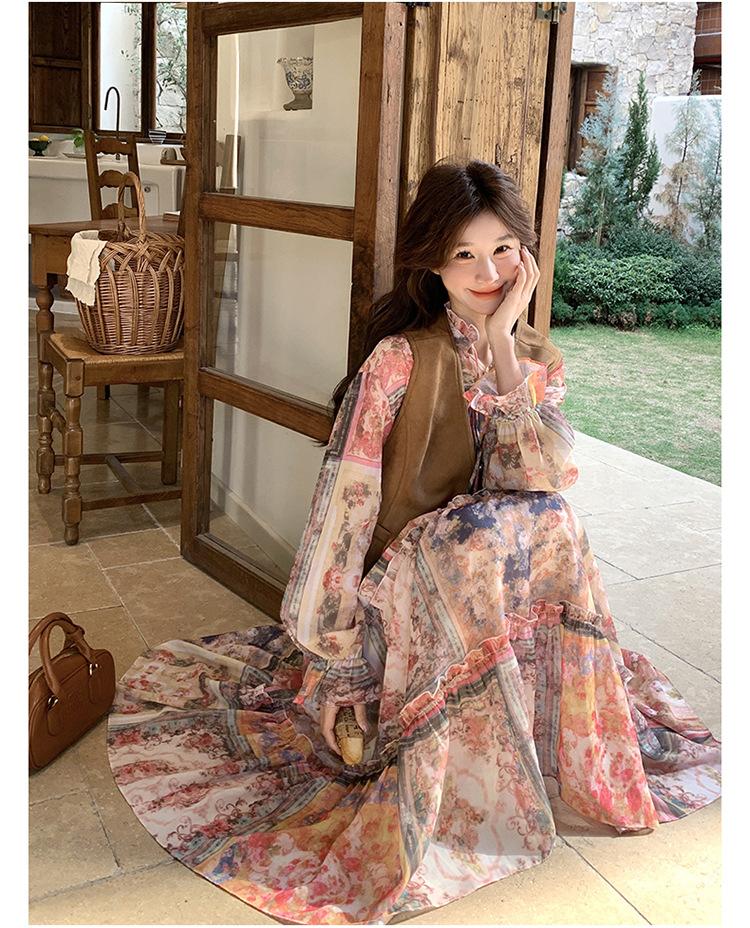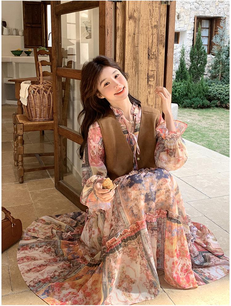 Conjunto de dos piezas de primavera y otoño para mujer 2025 Nuevo estilo Reductor de edad Chaleco versátil + Conjunto de vestido largo estampado Conjunto de dos piezas