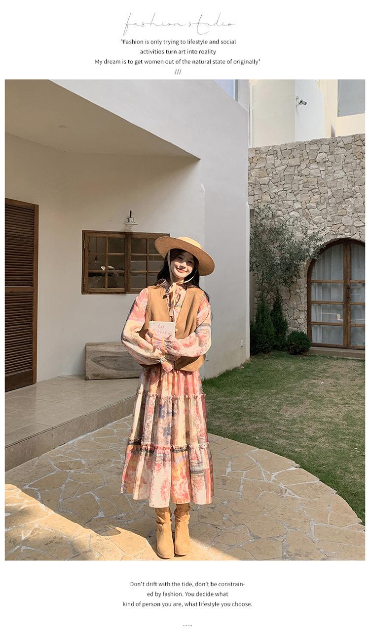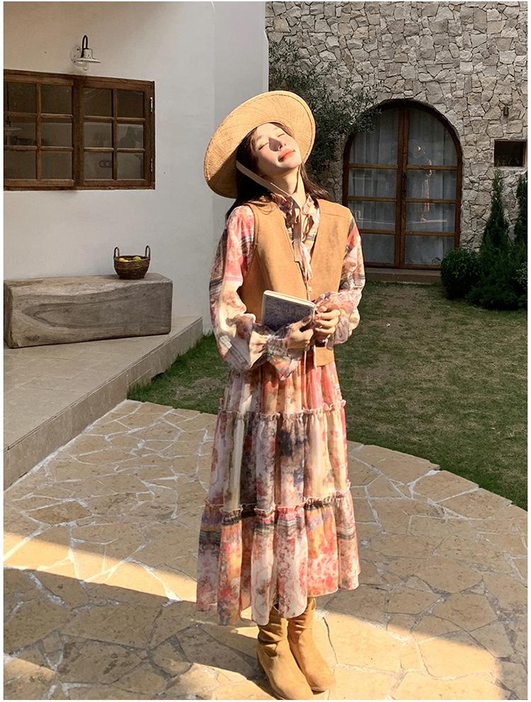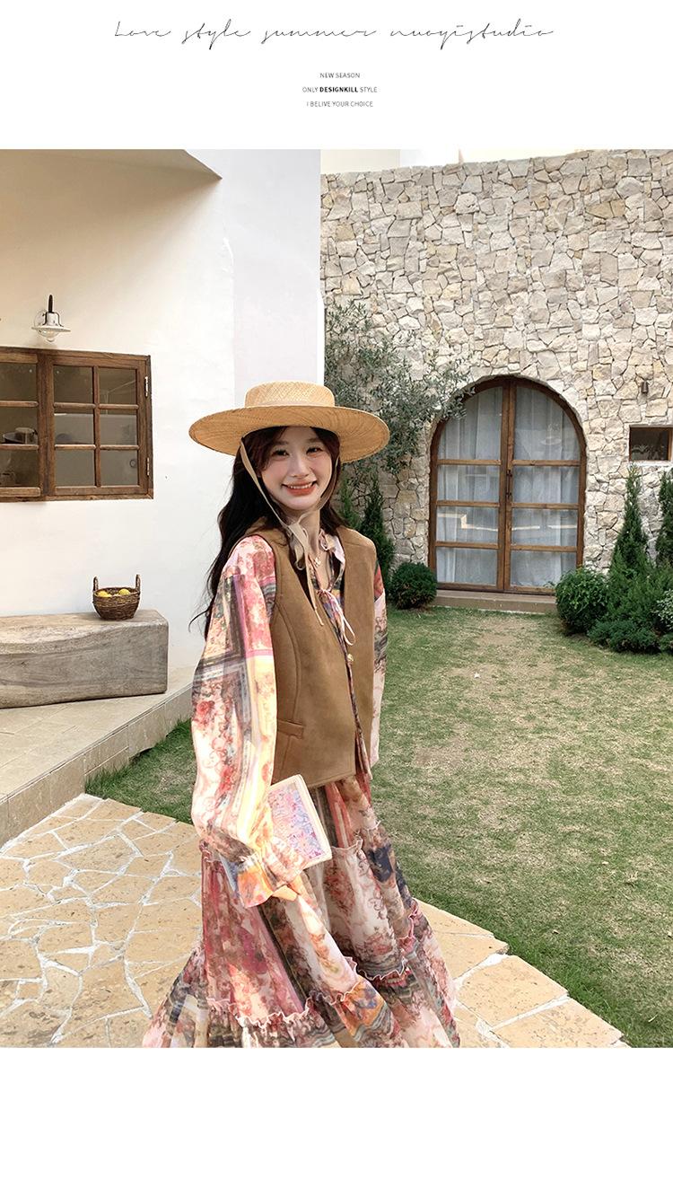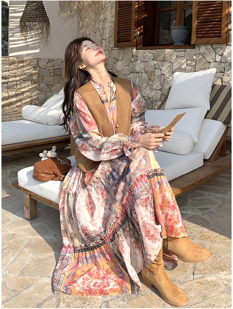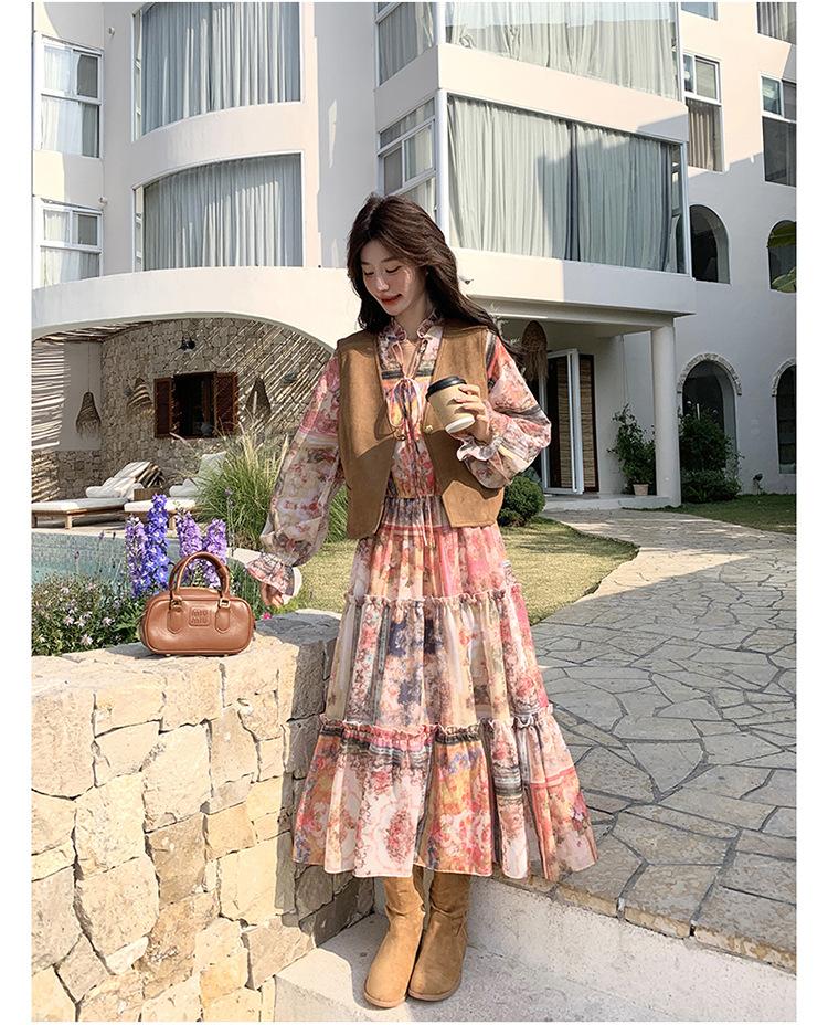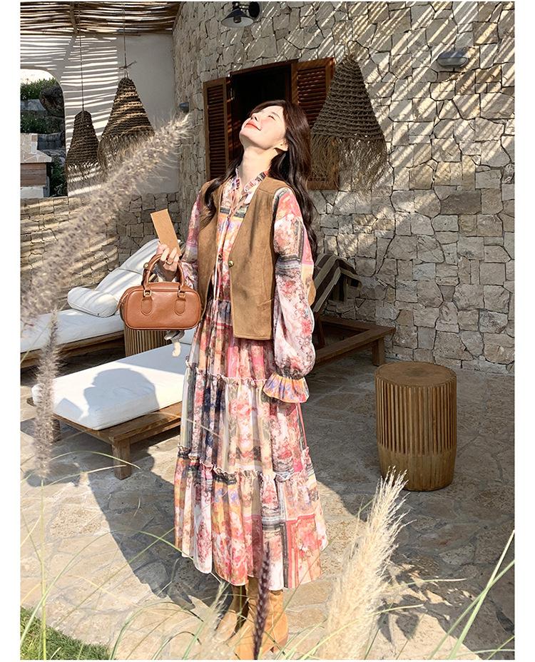 Conjunto de dos piezas de primavera y otoño para mujer 2025 Nuevo estilo Reductor de edad Chaleco versátil + Conjunto de vestido largo estampado Conjunto de dos piezas
