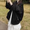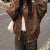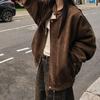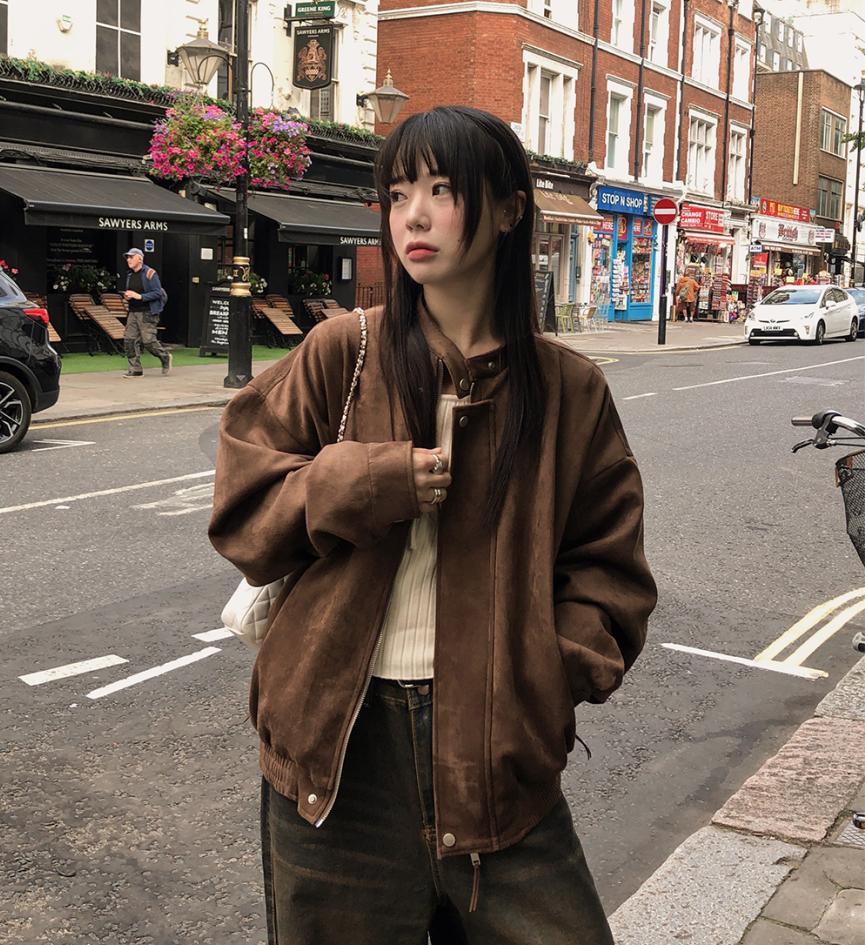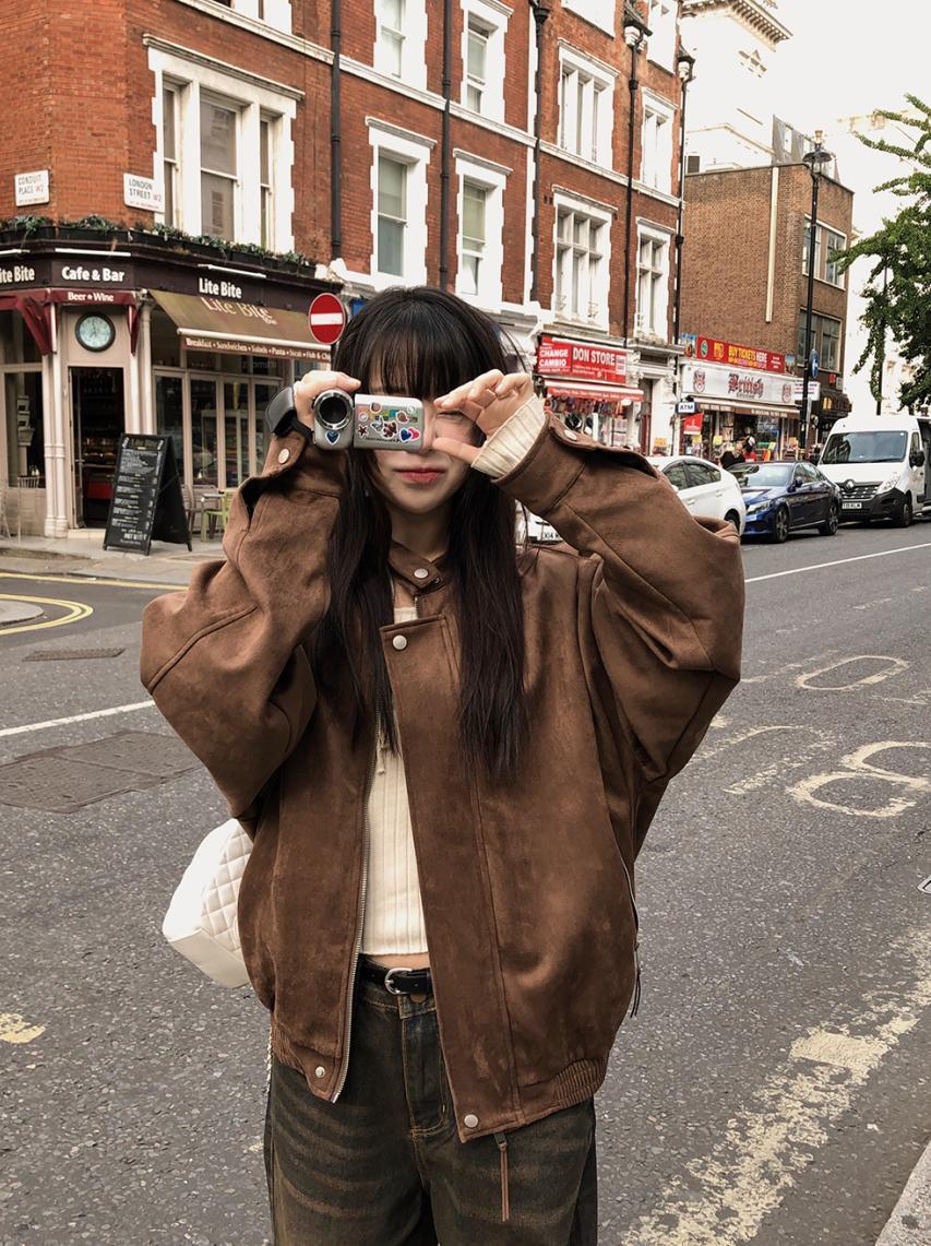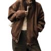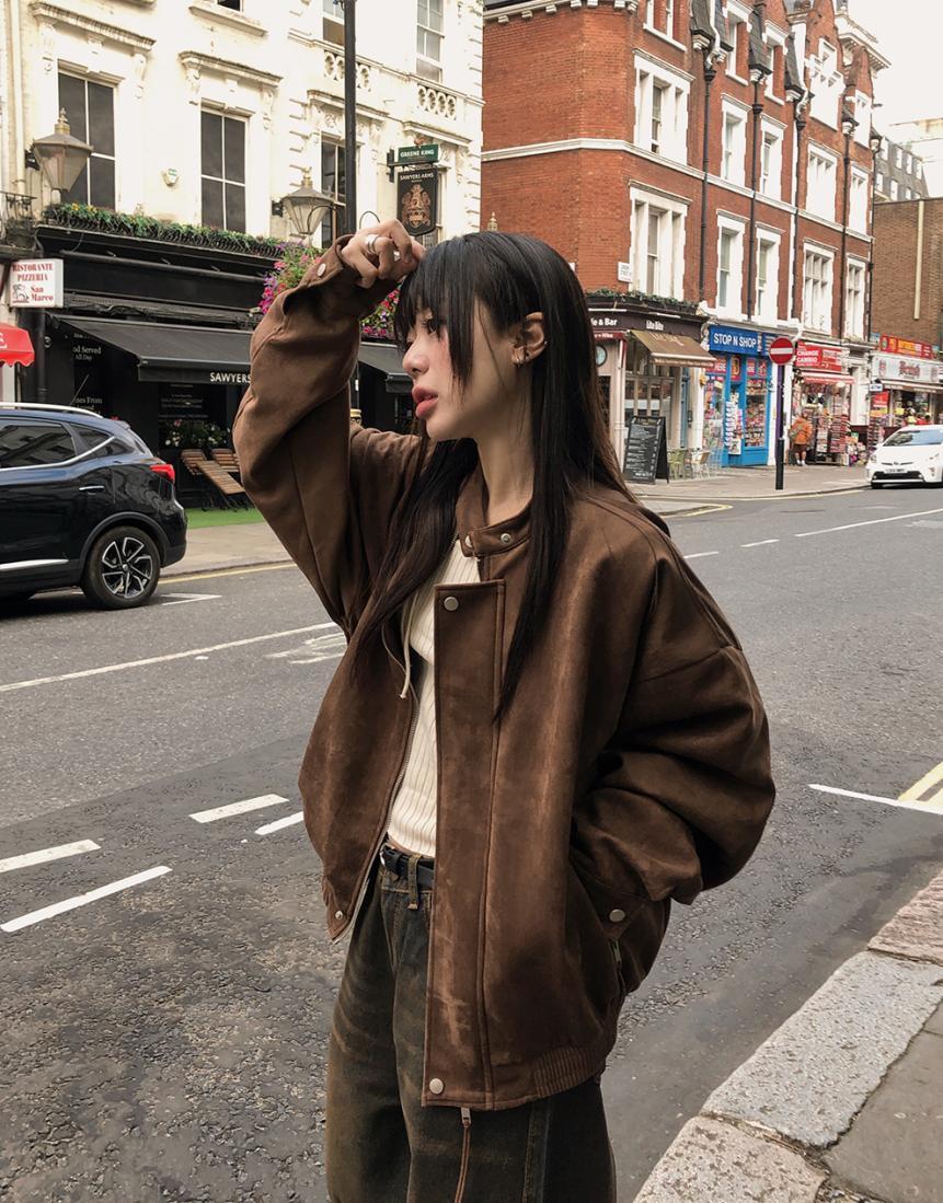 Chaqueta Exterior Coreana Dongdaemun para Mujer Chic Otoño Invierno Cuello Medio Alto Cremallera Gamuza Suelta Manga Larga