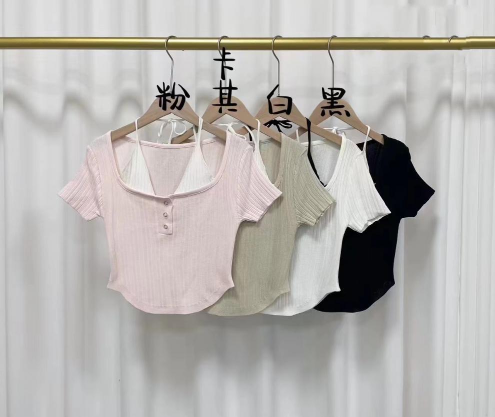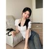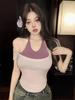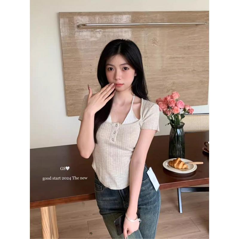 Deseo Puro Color Contraste Chica Sexy Slim Alta Elasticidad Halter Tirantes Manga Corta Falso Top de Dos Piezas Corto t de Lana para Mujer Verano Nuevo Estilo