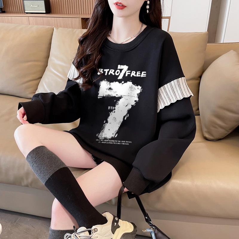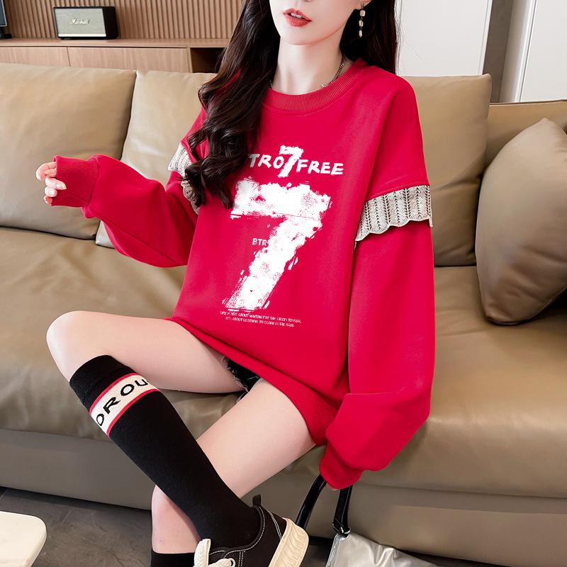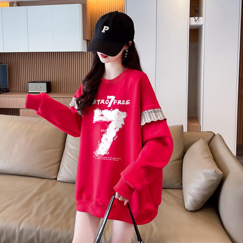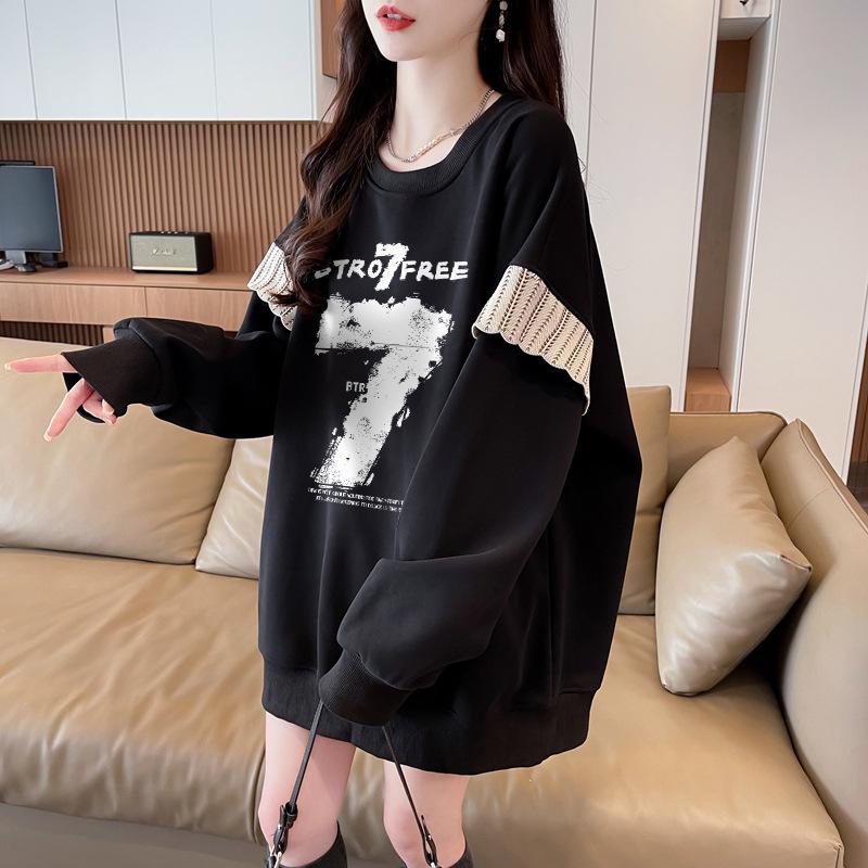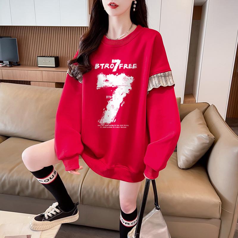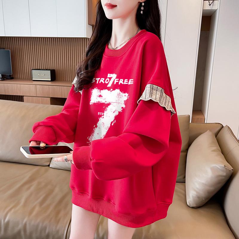 Sudadera Chic Divertida con Estampado Digital de Cuello Redondo Otoño e Invierno Super Fuego Largo Medio Oversize con Forro Polar Grueso Top