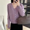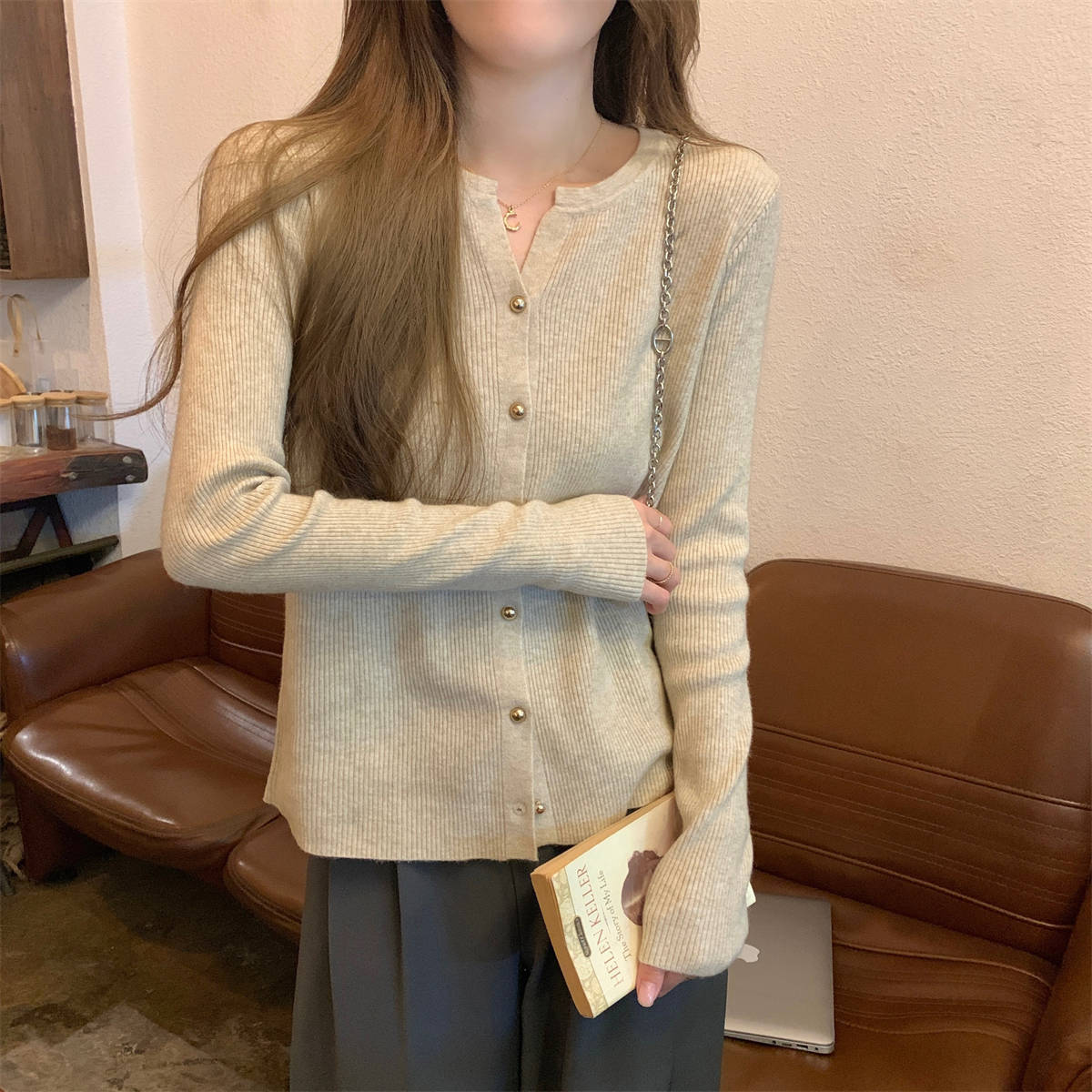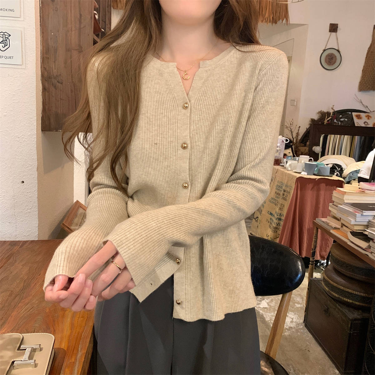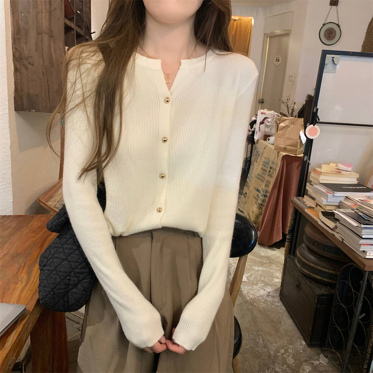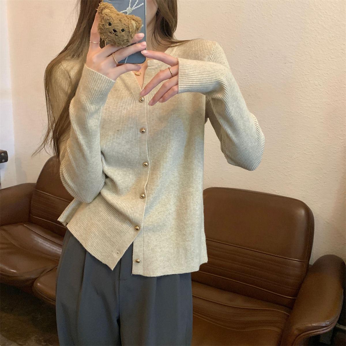Cárdigan de punto de estilo francés con cuello en V y botonadura simple para mujer, suéter casual versátil sencillo de manga larga, top acanalado