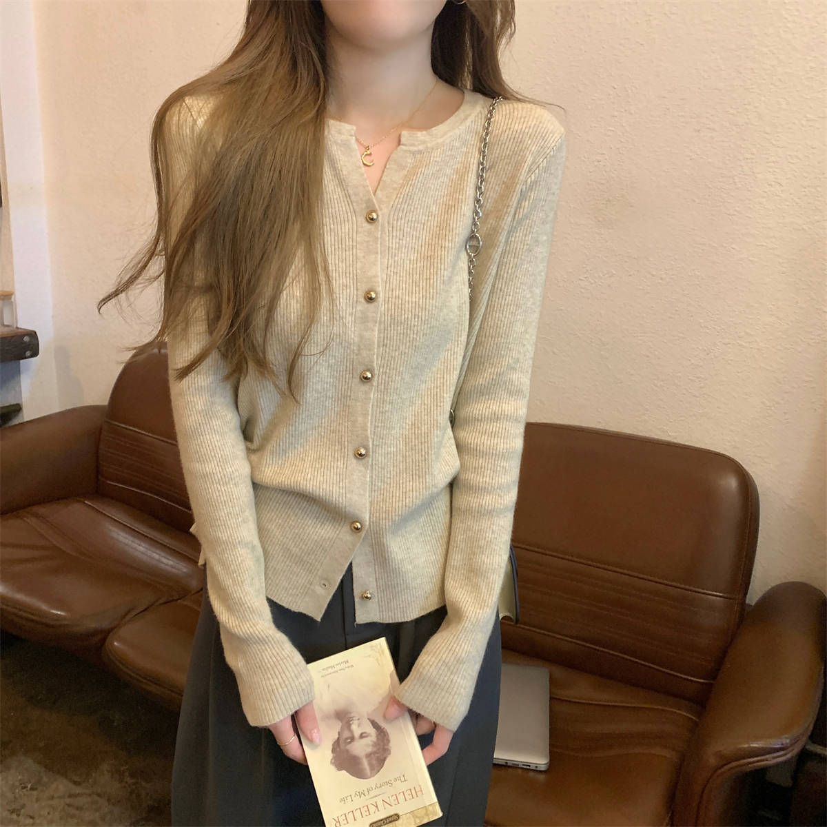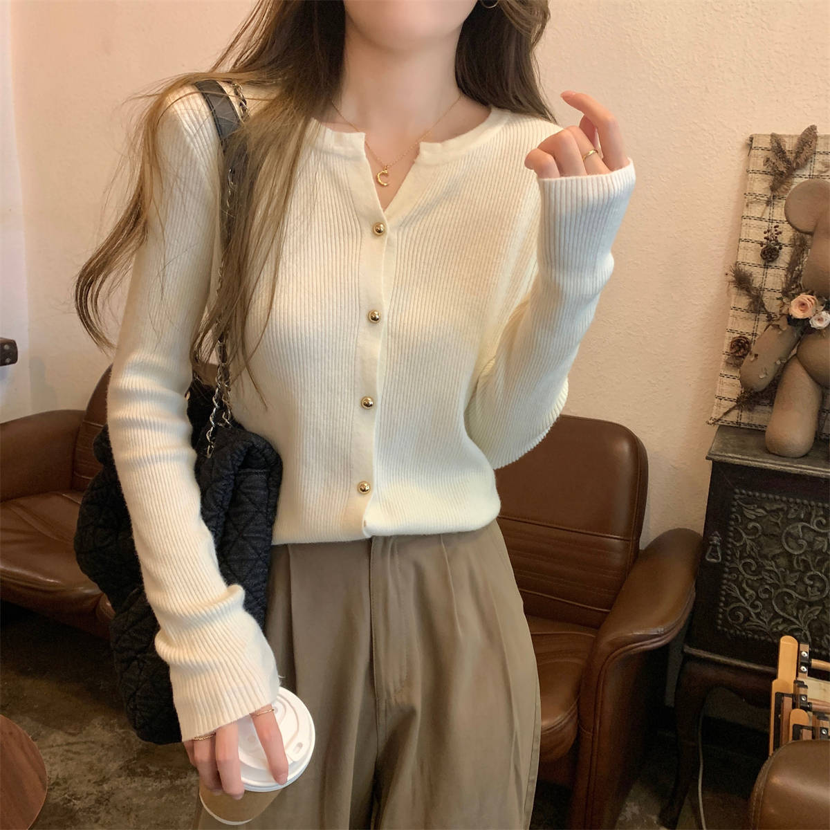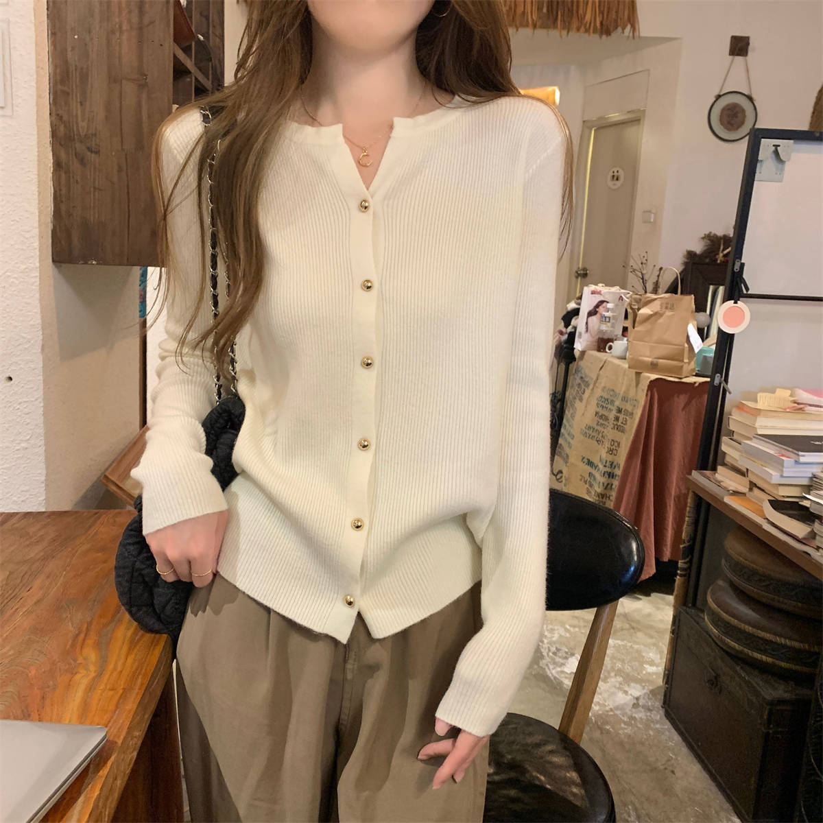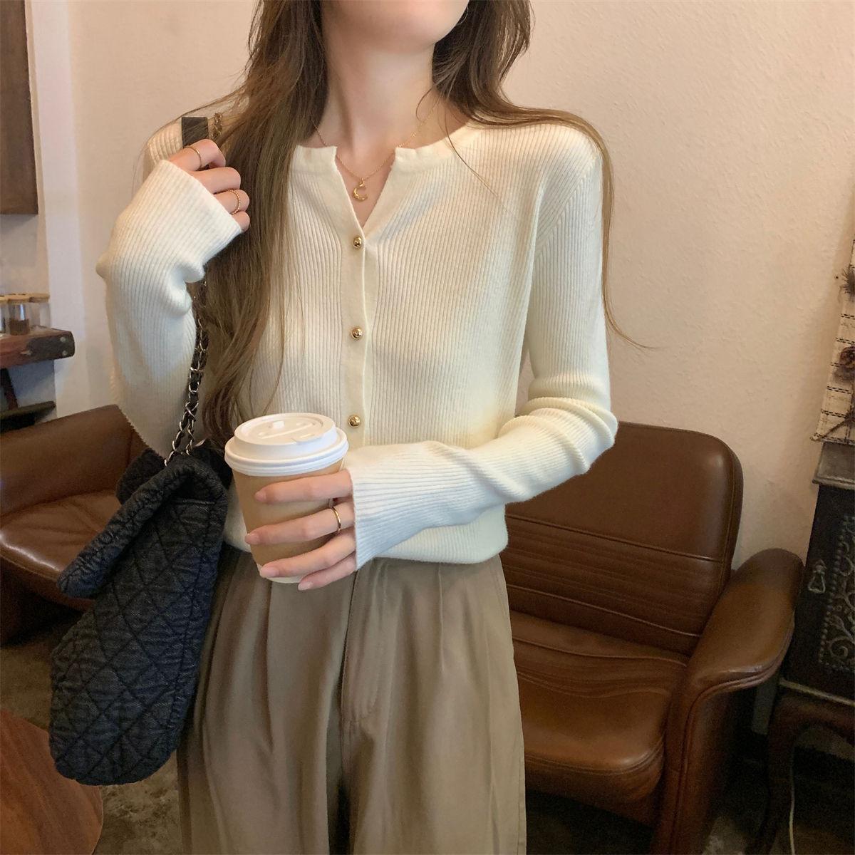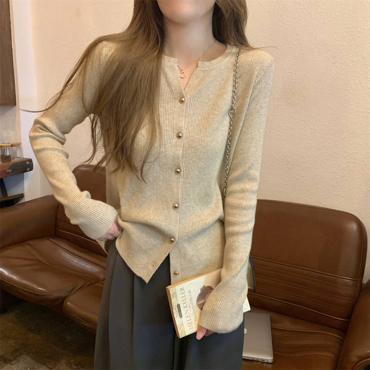 Cárdigan de punto de estilo francés con cuello en V y botonadura simple para mujer, suéter casual versátil sencillo de manga larga, top acanalado