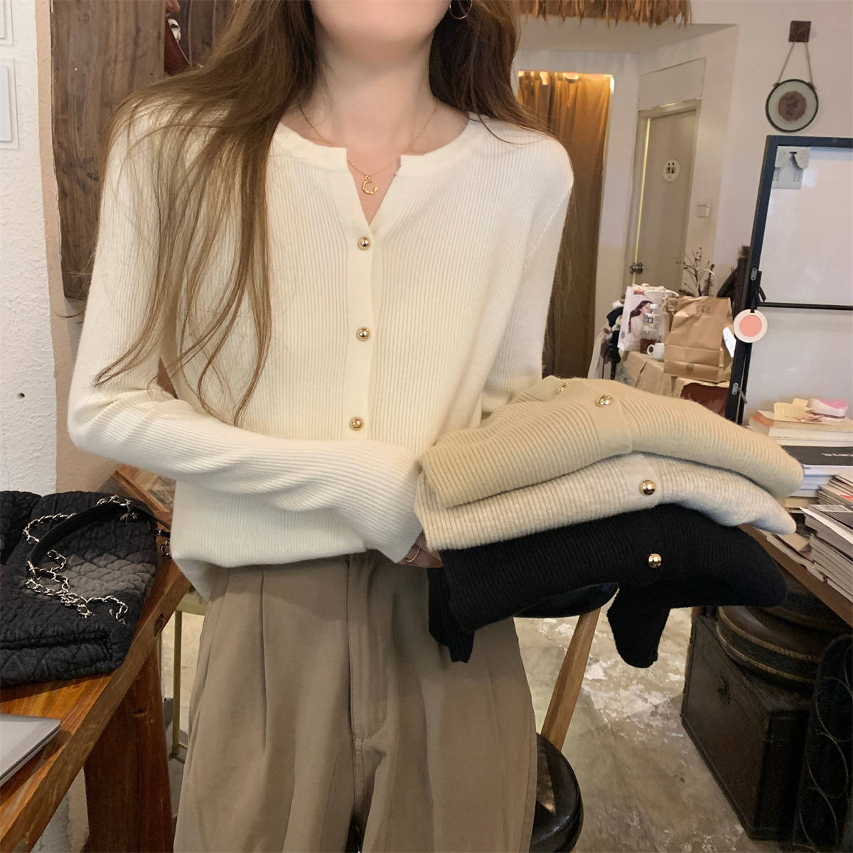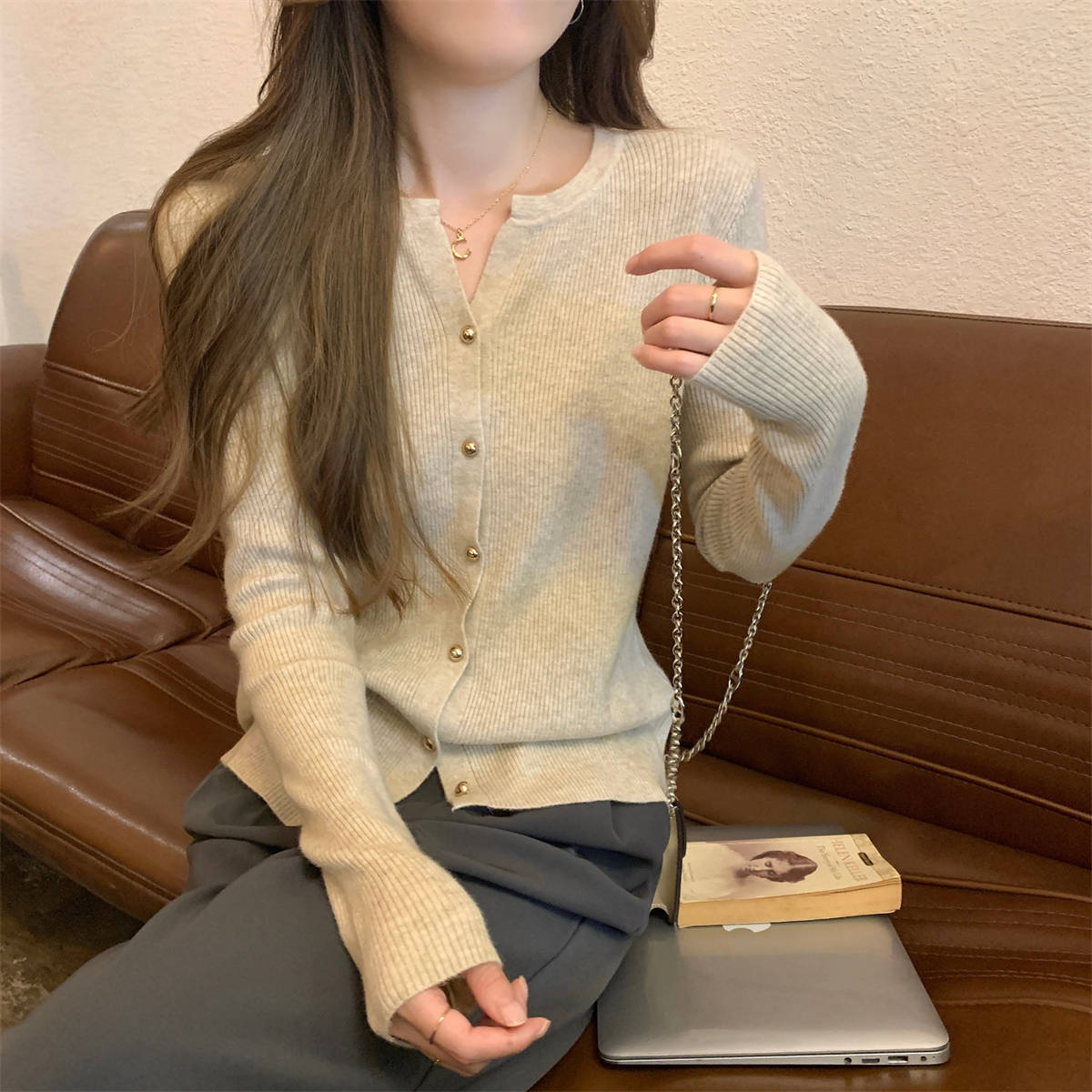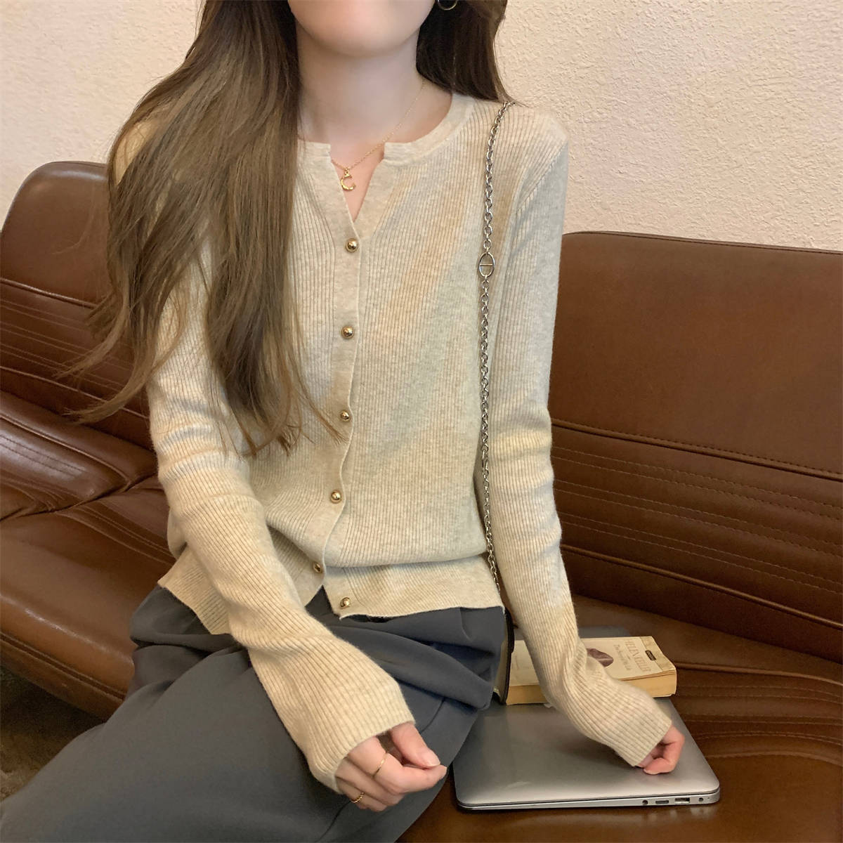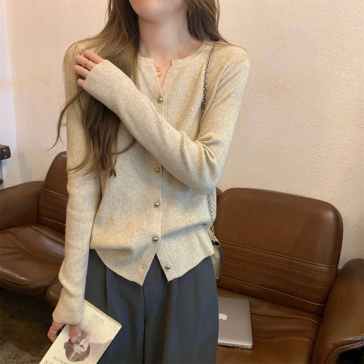 Cárdigan de punto de estilo francés con cuello en V y botonadura simple para mujer, suéter casual versátil sencillo de manga larga, top acanalado