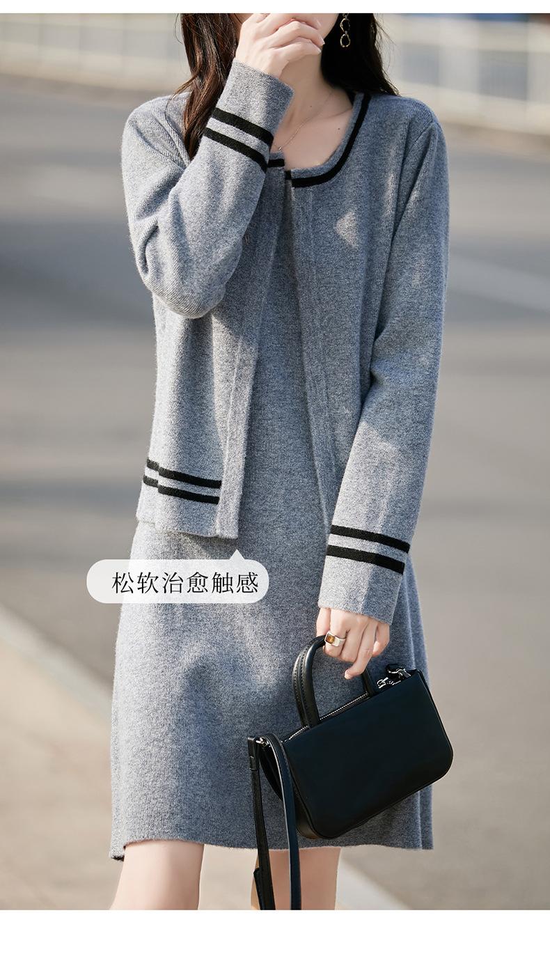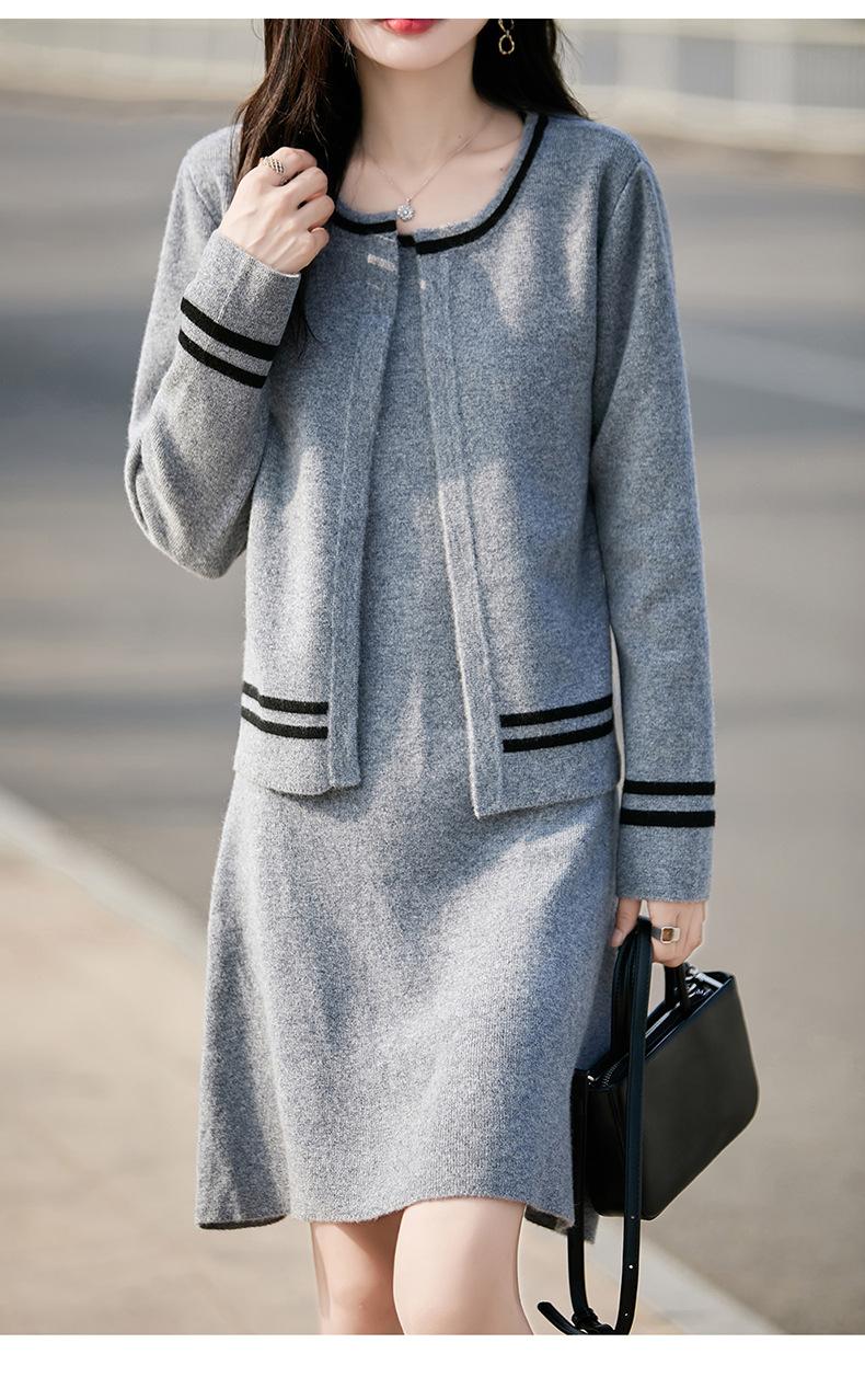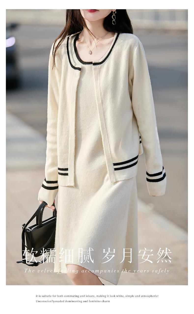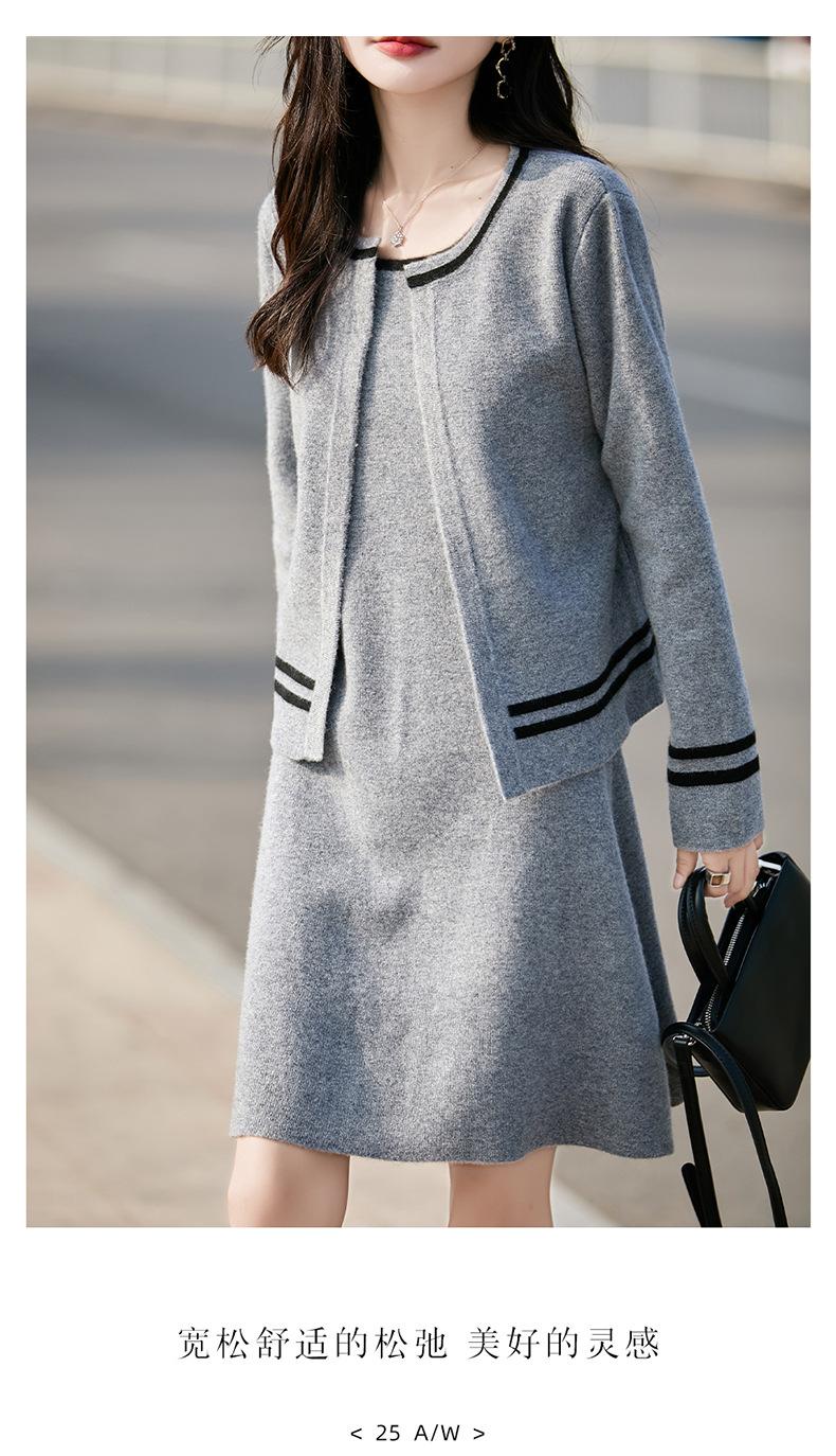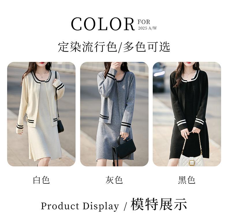 2025 Otoño/Invierno Nuevo Estilo 100% Lana Pura Set Vestido Cárdigan para Mujer Suelto Bloque de Color Capas Conjunto de Dos Piezas